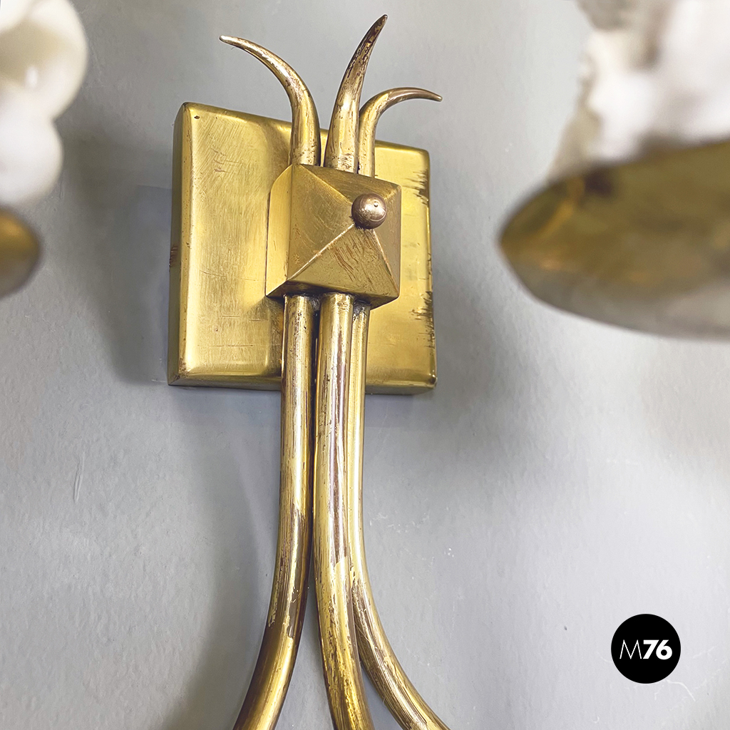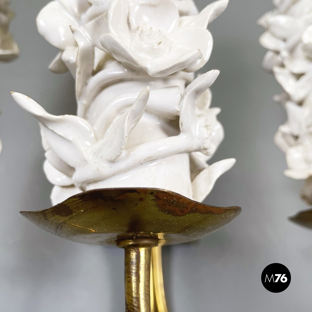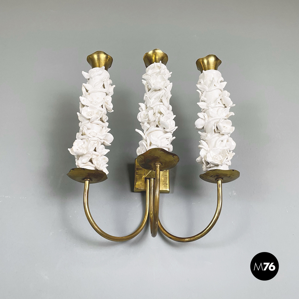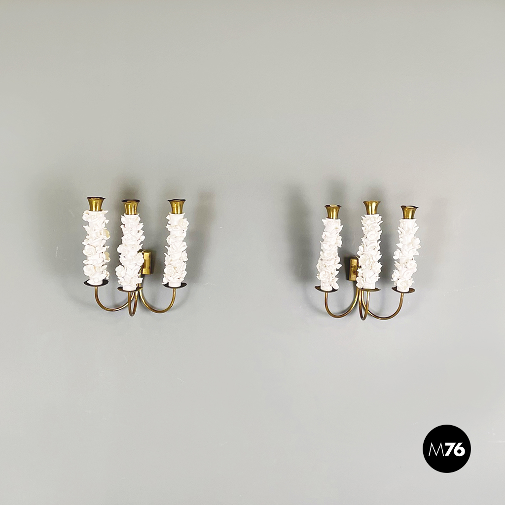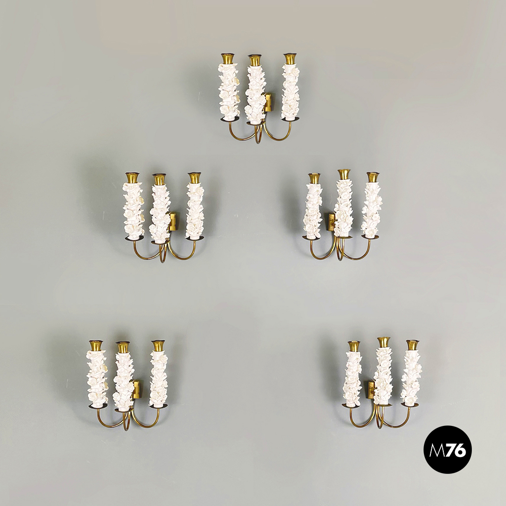 Set di cinque applique o lampade da parete a tre luci in ottone e ceramica. La struttura presenta tre bracci in tondino di ottone e tre diffusori in ottone con decorazione floreale in ceramica bianca.