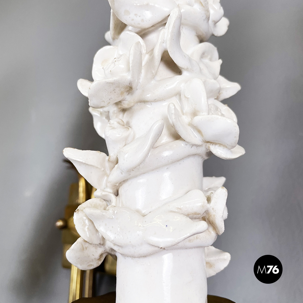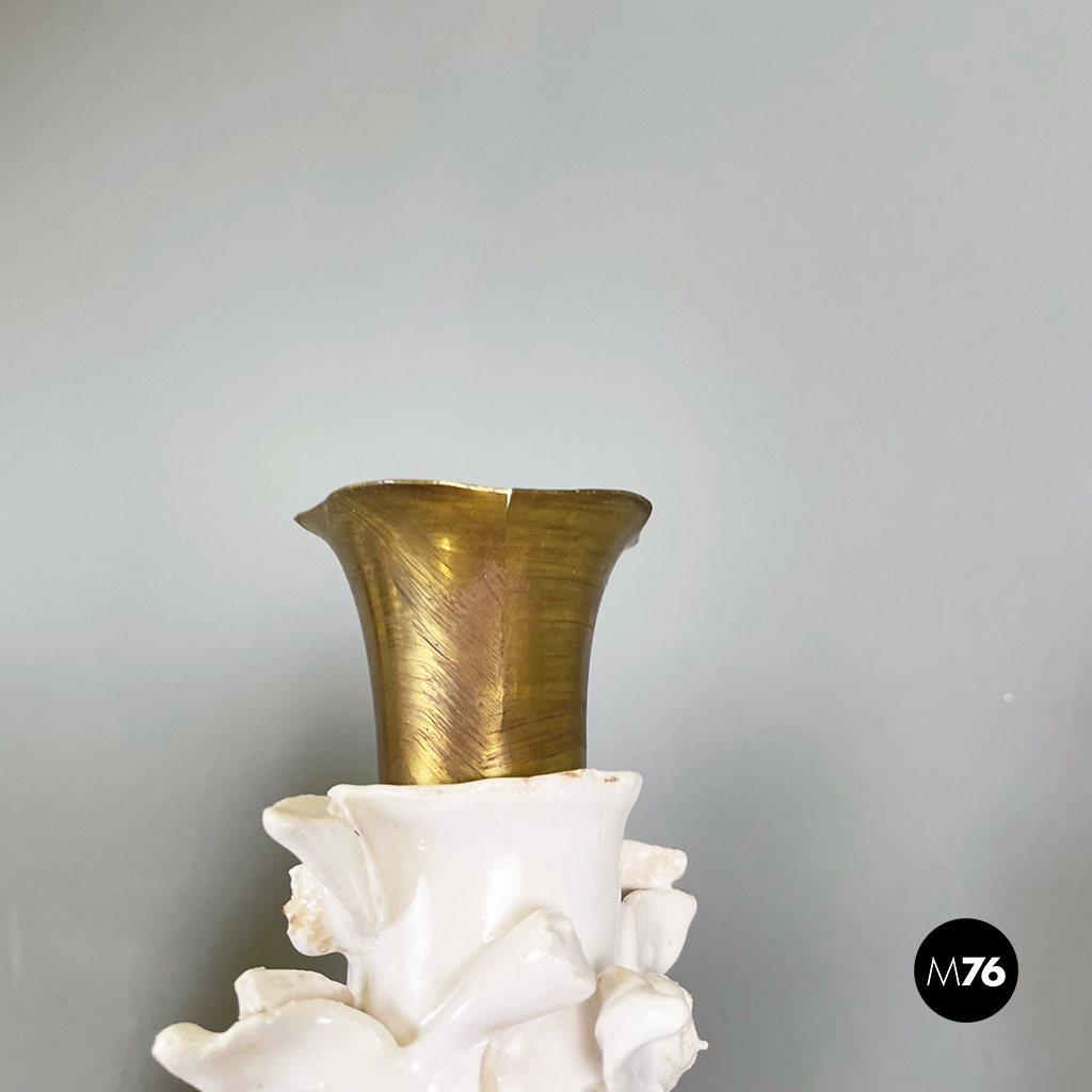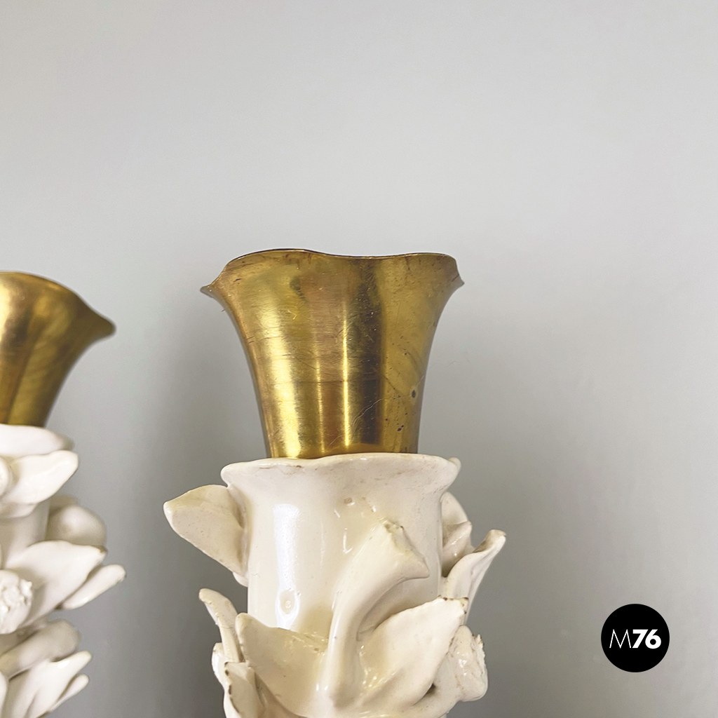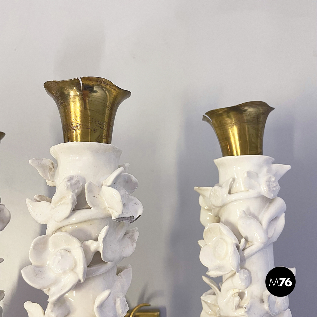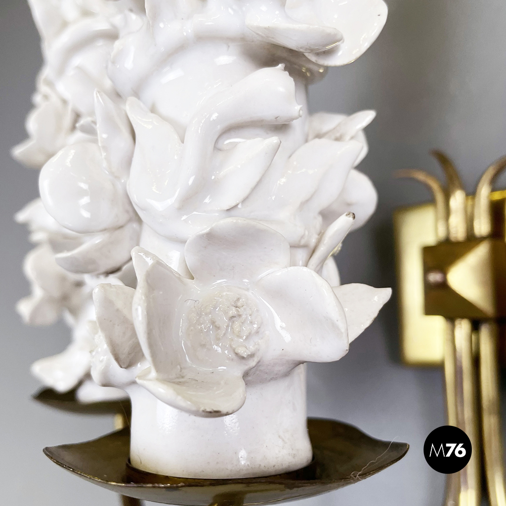 Set di cinque applique o lampade da parete a tre luci in ottone e ceramica. La struttura presenta tre bracci in tondino di ottone e tre diffusori in ottone con decorazione floreale in ceramica bianca.