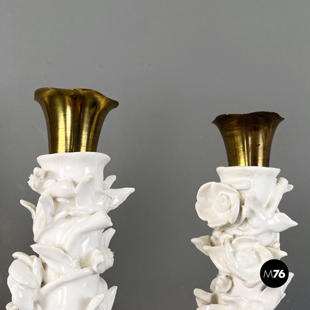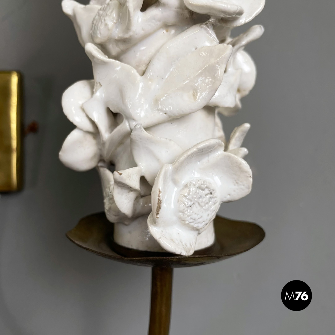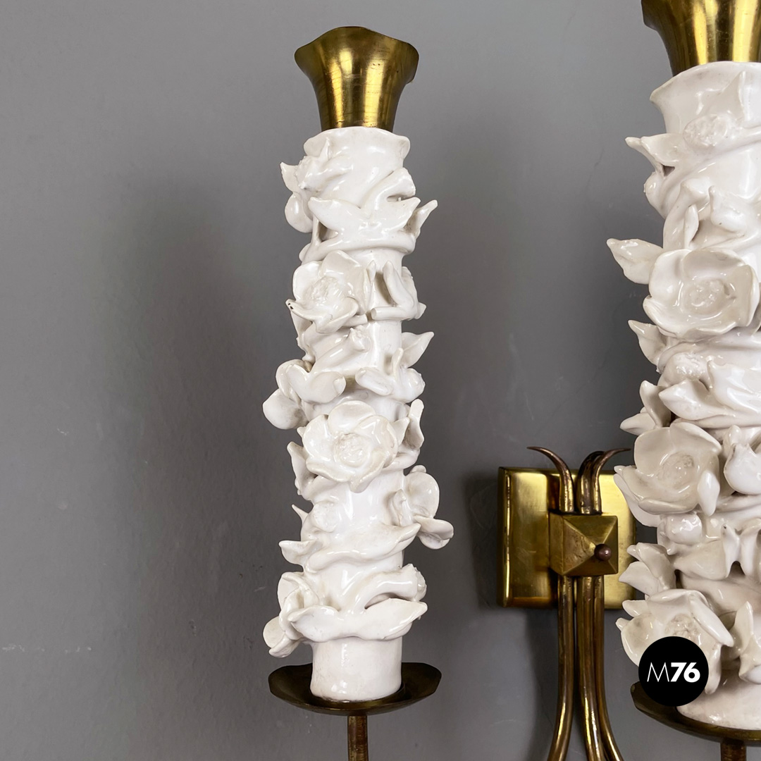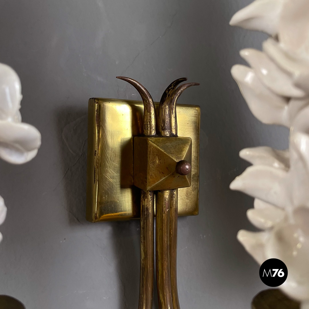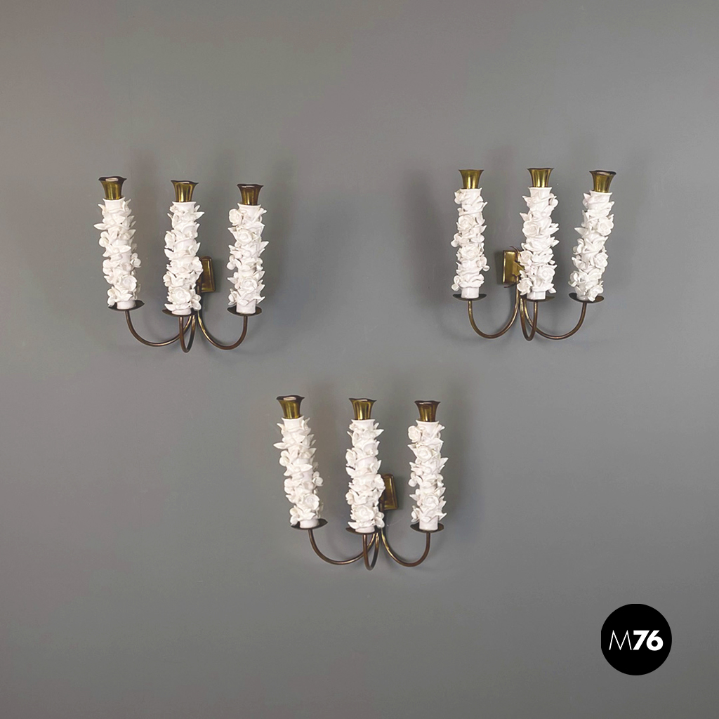Set di tre applique a tre luci in ottone e ceramica. La struttura presenta tre bracci in tondino di ottone e tre diffusori in ottone con decorazione floreale in ceramica bianca.