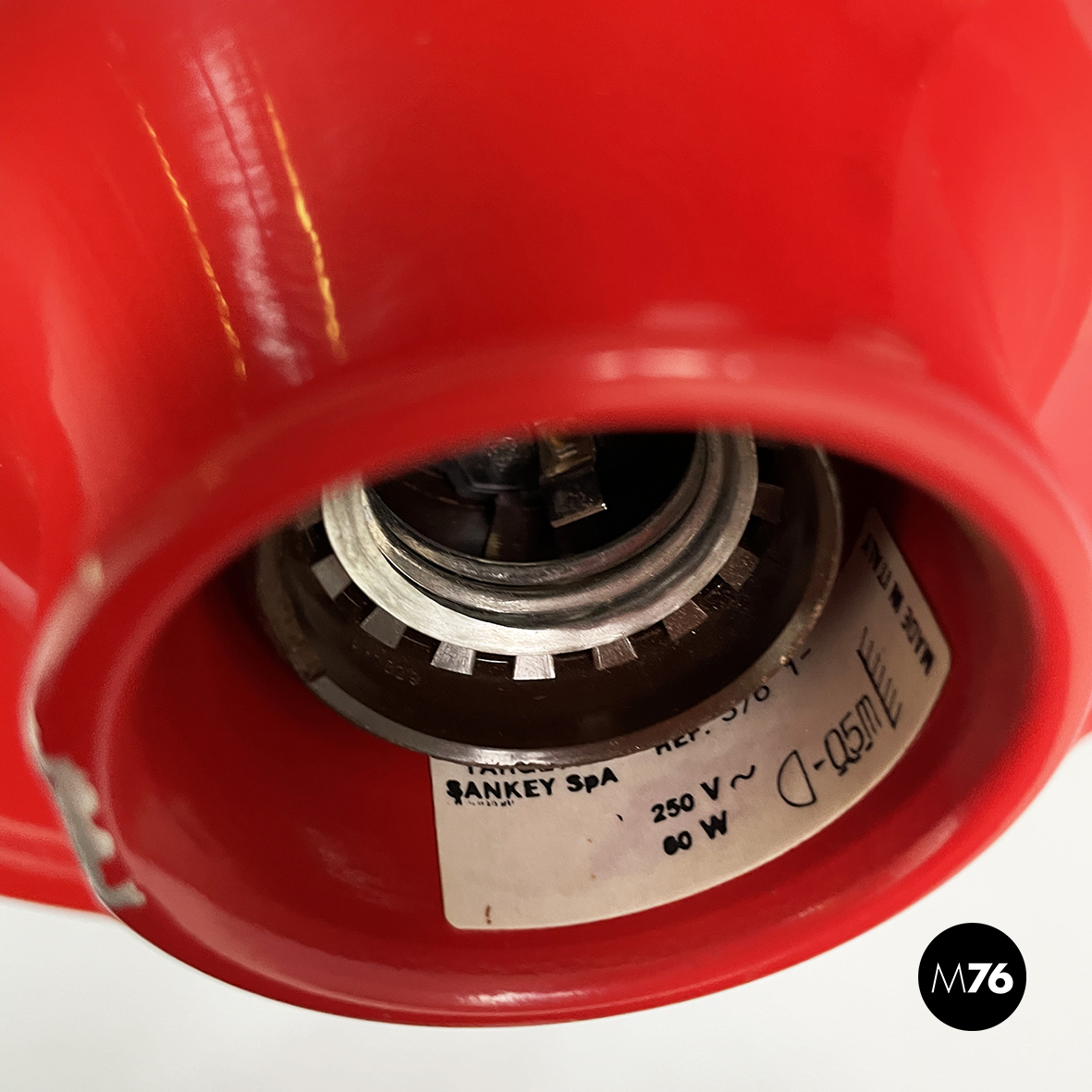 Applique a base tonda in metallo verniciato rosso brillante. La struttura si tende a stringere verso il porta-lampadine e si tende ad allargare verso la base. Utilizzabile anche come plafoniera.