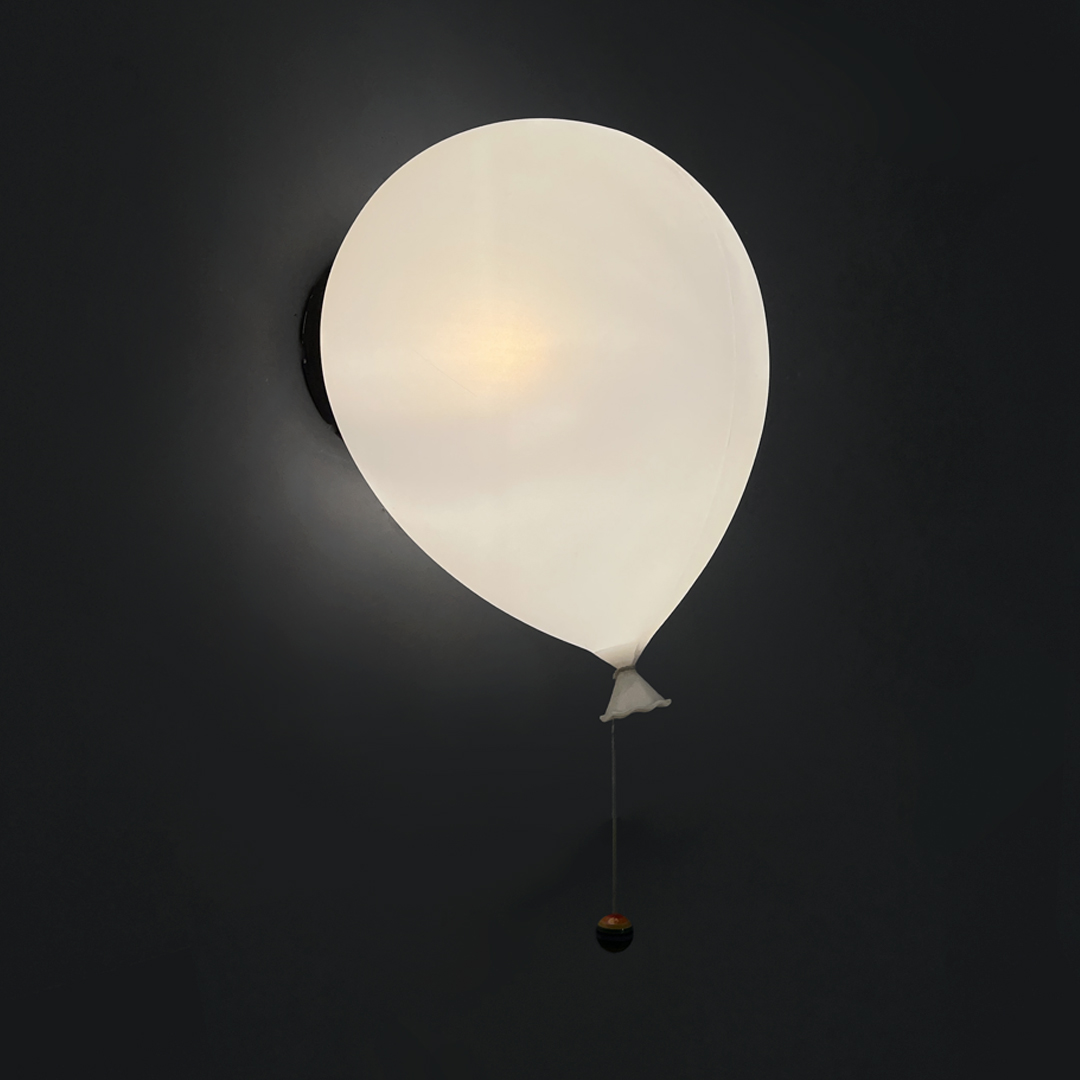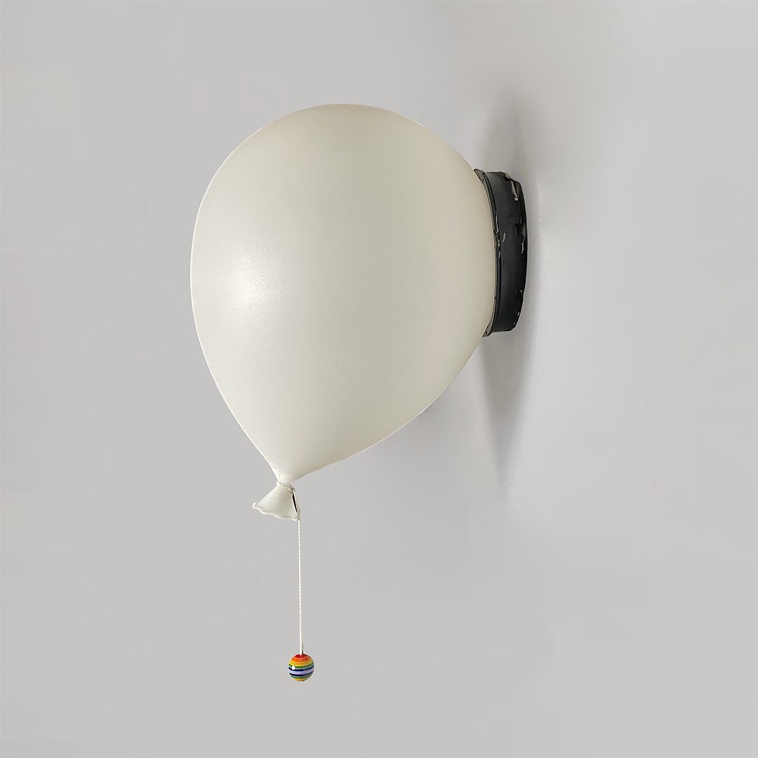 Applique in plastica. L’attacco a parete rotondo colore nero.. Paralume in plastica colore bianco a forma di palloncino. Termina con una corda con sfera multicolore sempre in plastica.