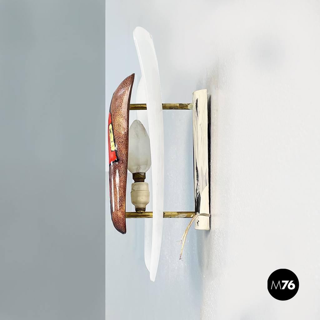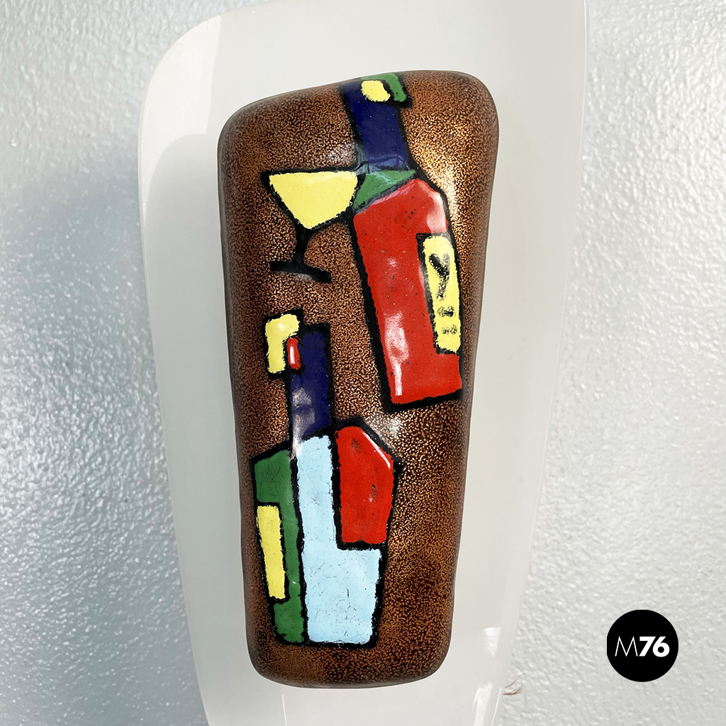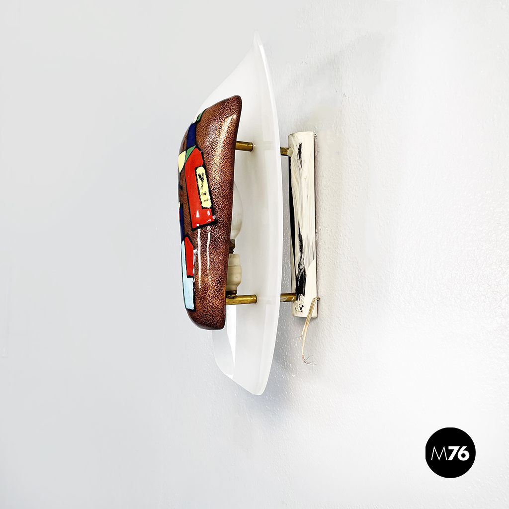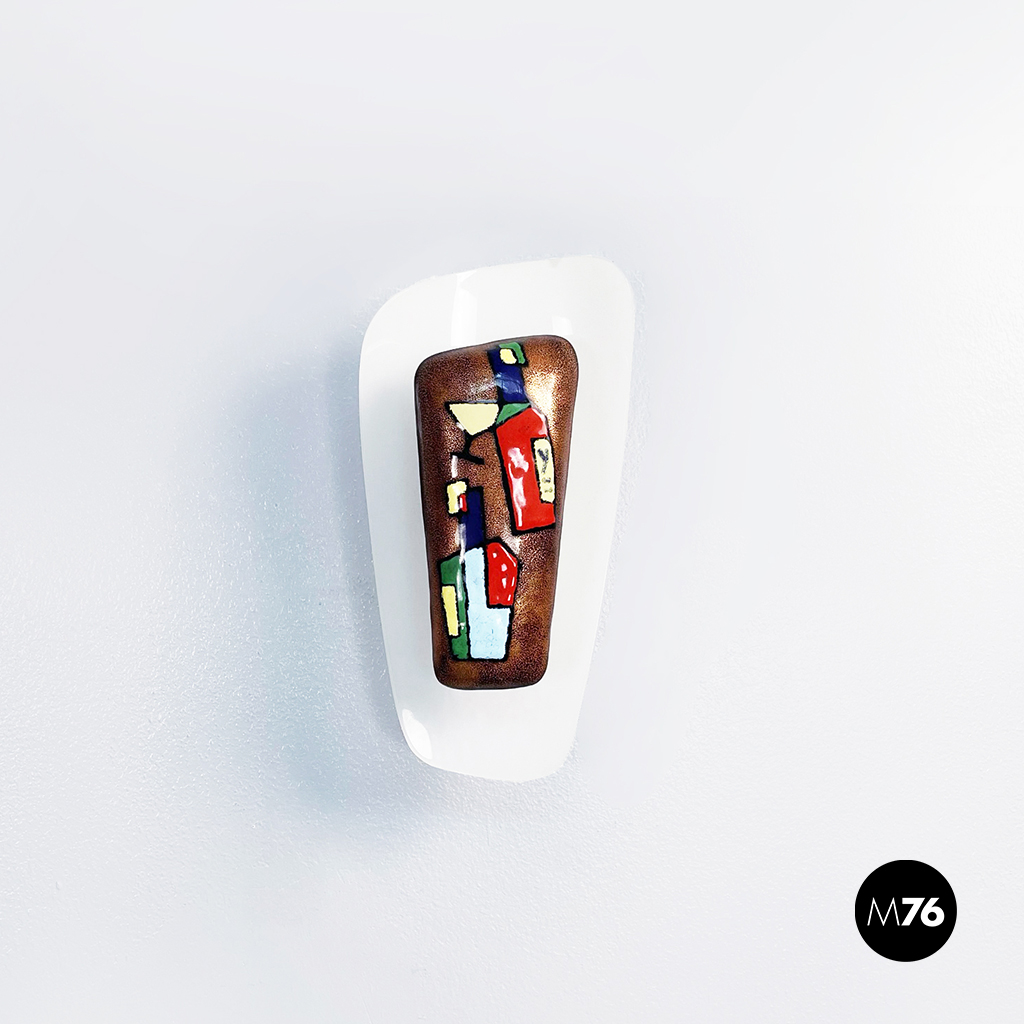 Applique di forma irregolare in vetro acrilico opalino e metallo. La lampadina è frapposta tra il plexiglass e il metallo verniciato, grazie alla presenza di due piccole aste tubolari. Sul paralume esterno è rappresentato un disegno geometrico astratto con i colori blu, marrone, rosso, giallo, azzurro, verde e nero.