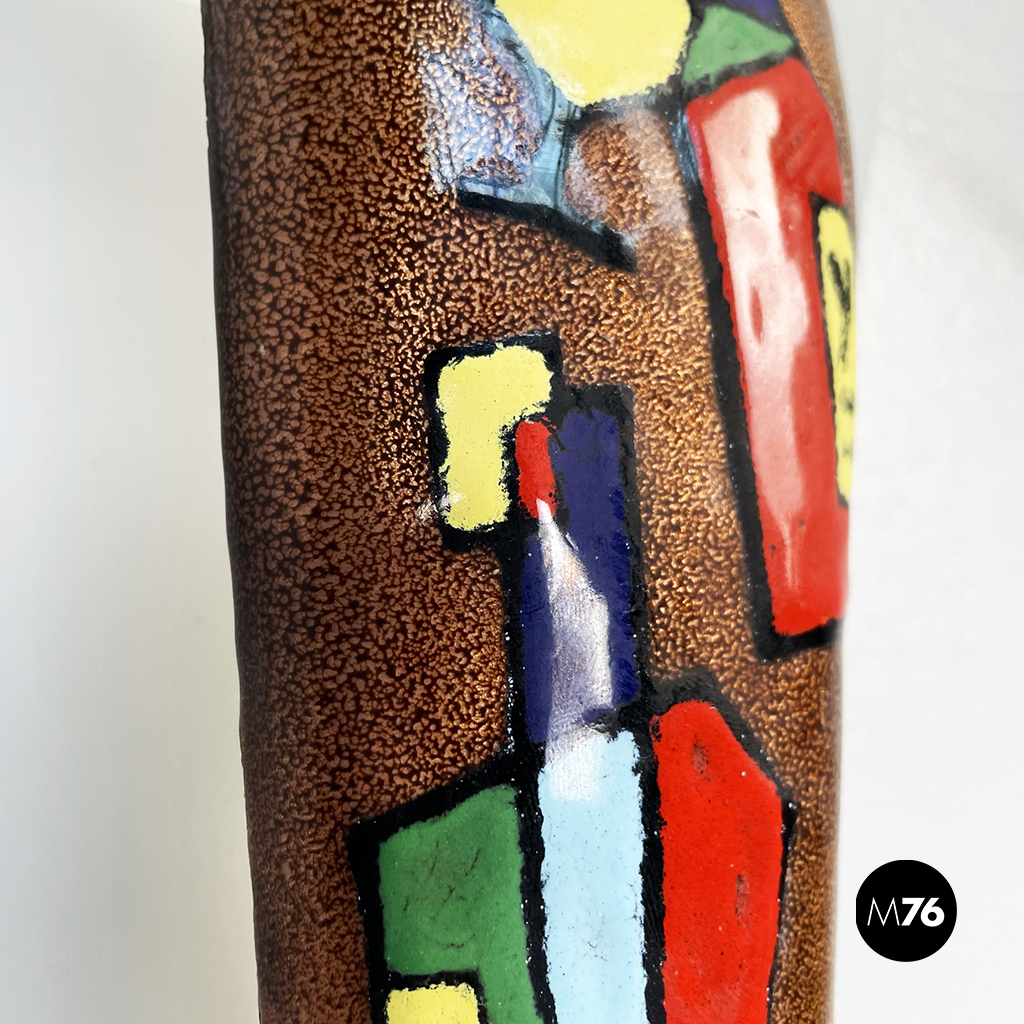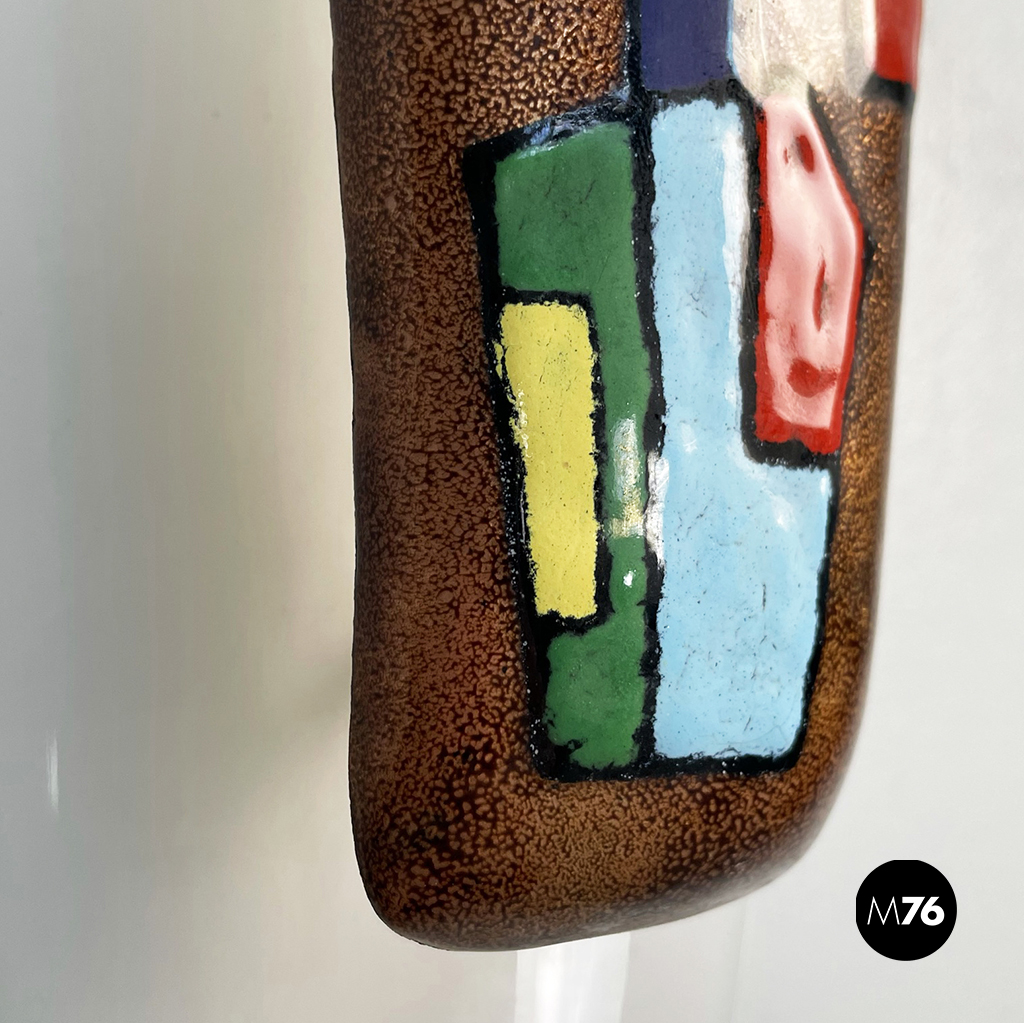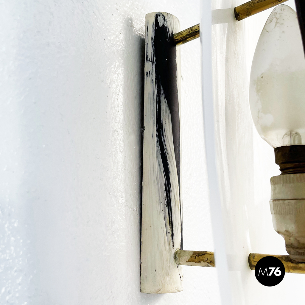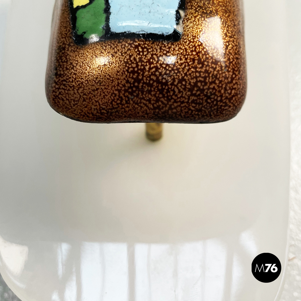 Applique di forma irregolare in vetro acrilico opalino e metallo. La lampadina è frapposta tra il plexiglass e il metallo verniciato, grazie alla presenza di due piccole aste tubolari. Sul paralume esterno è rappresentato un disegno geometrico astratto con i colori blu, marrone, rosso, giallo, azzurro, verde e nero.