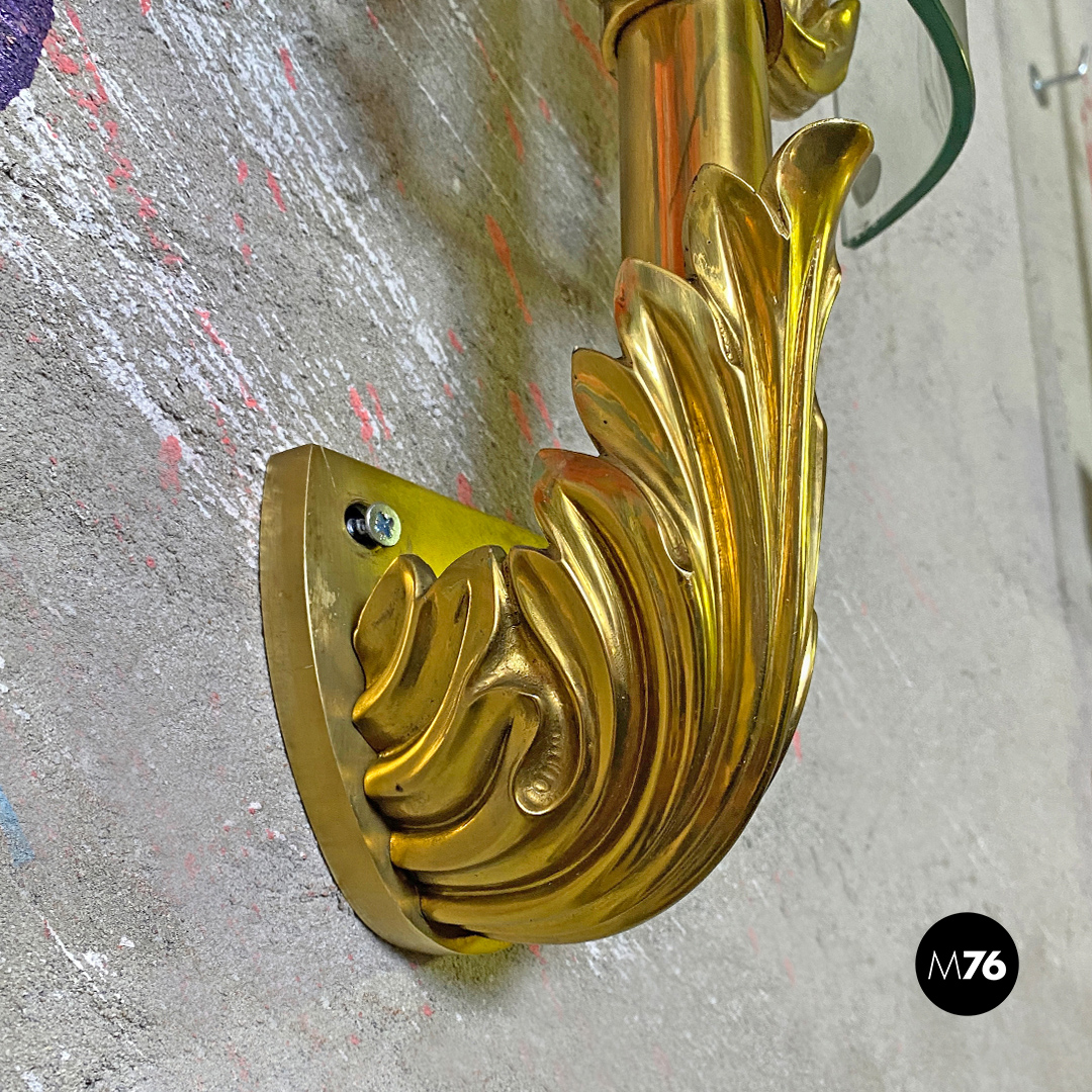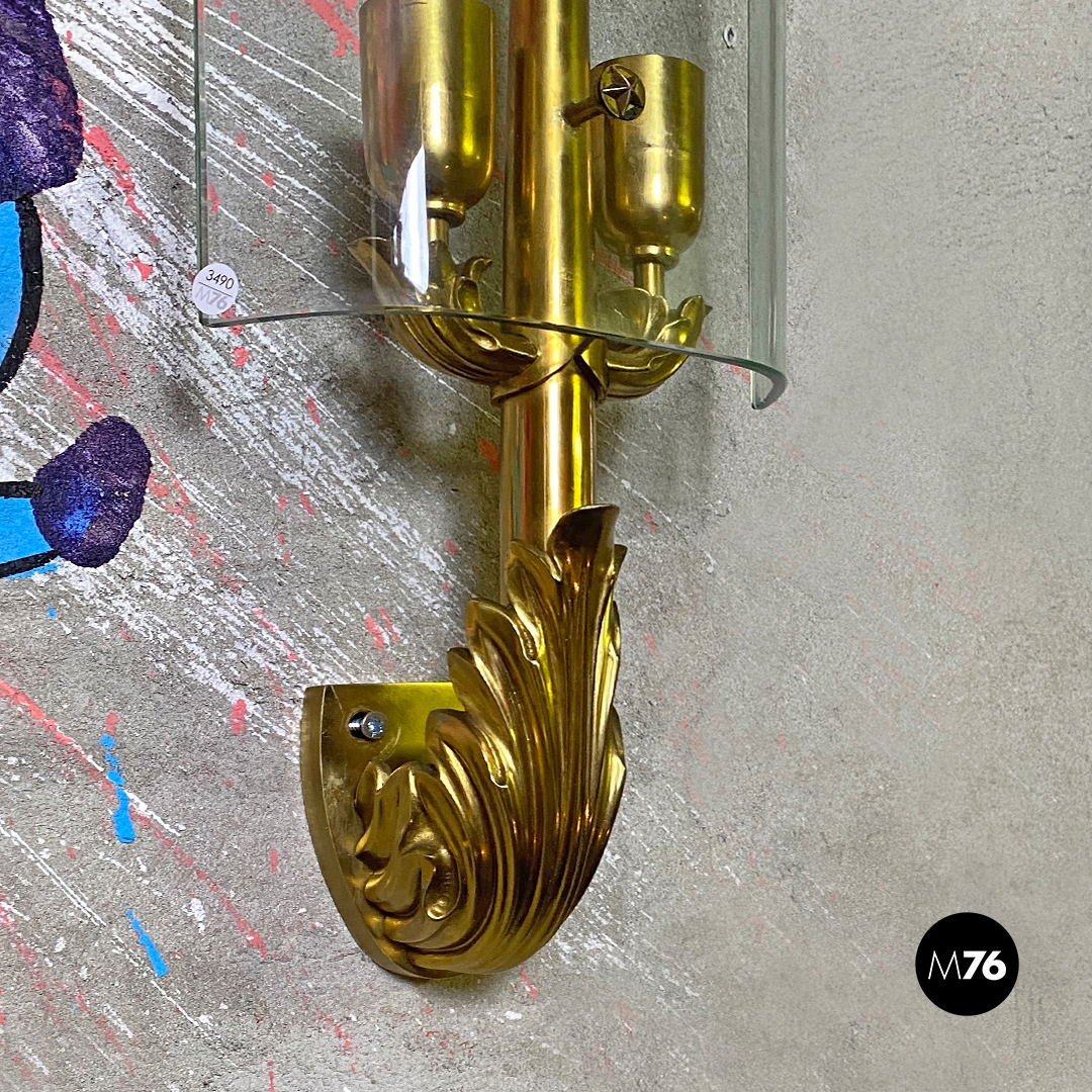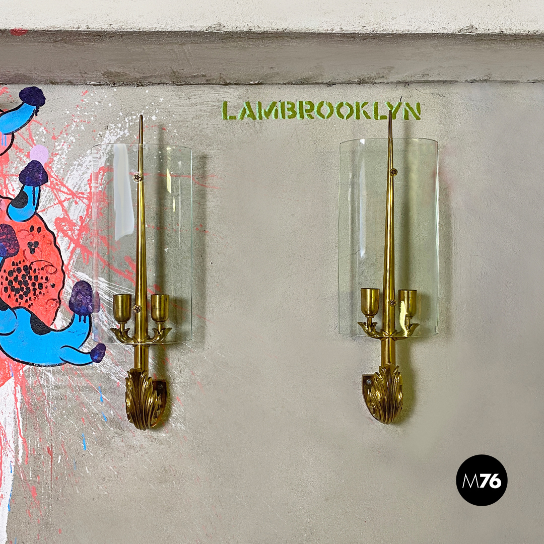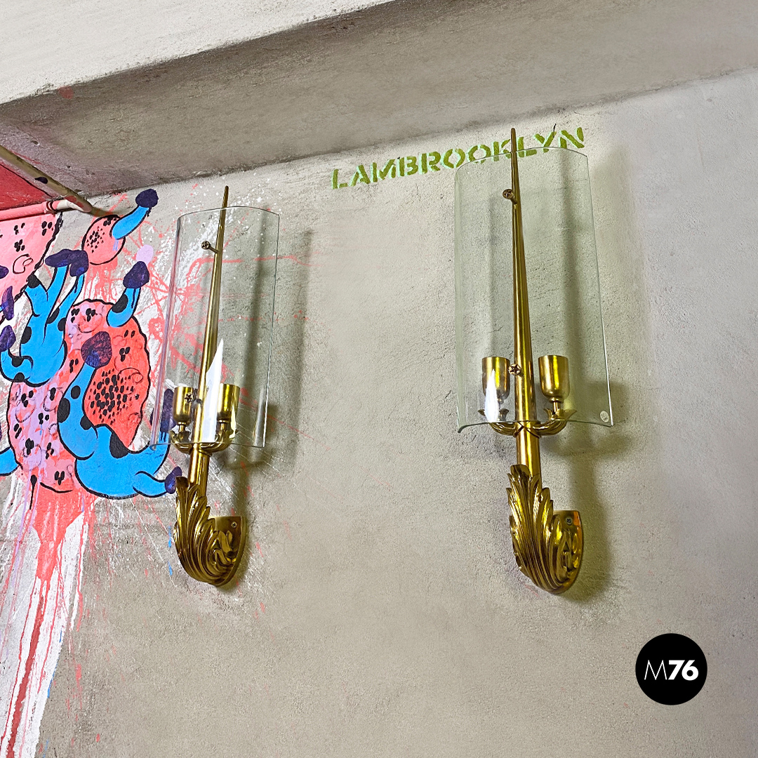 Coppia di applique con struttura in fusione di ottone con decoro a foglia e diffusori in cristallo curvato trasparente.