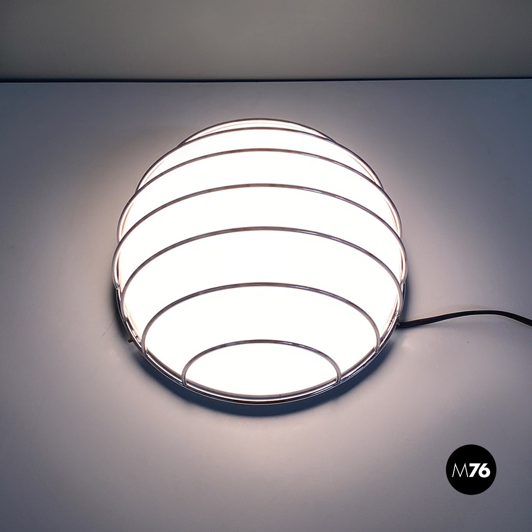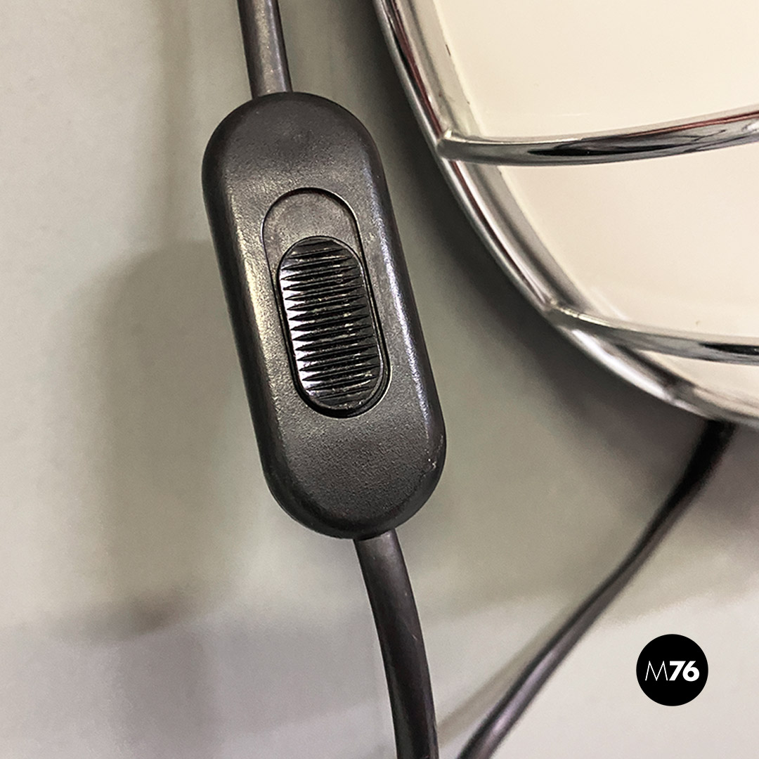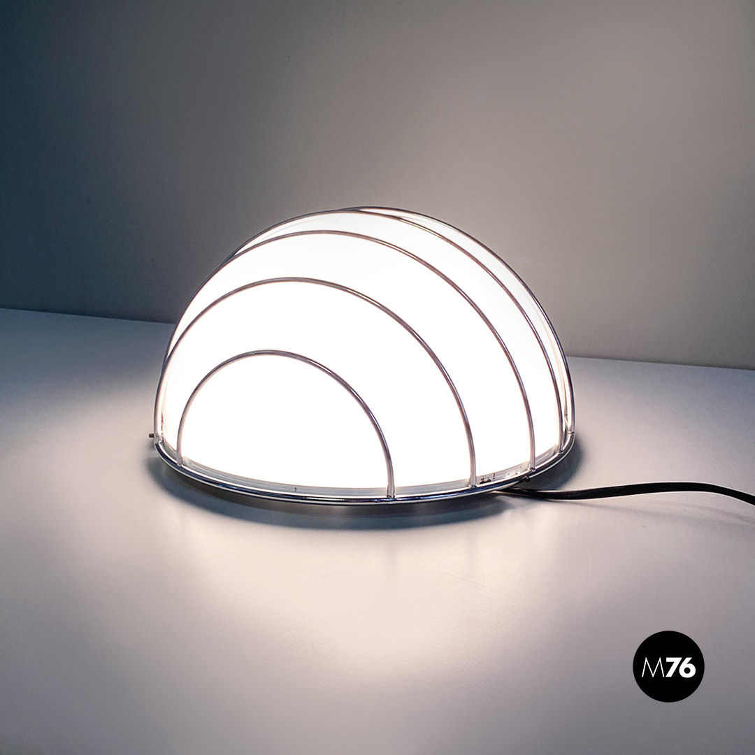 Lampada da parete, modificata per essere anche una lampada da tavolo, di forma semisferica con diffusore in plastica bianco posto all’interno di una griglia in tondino di metallo cromato.