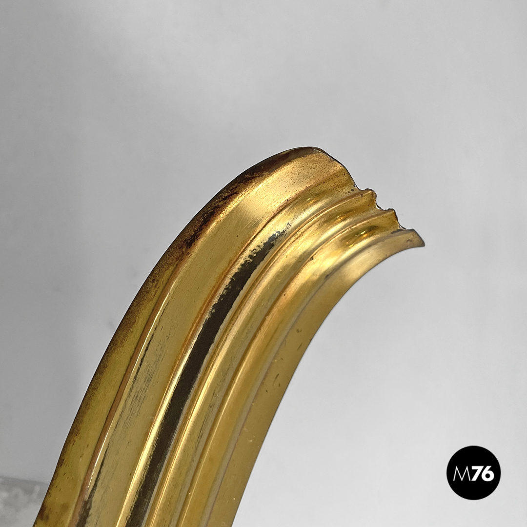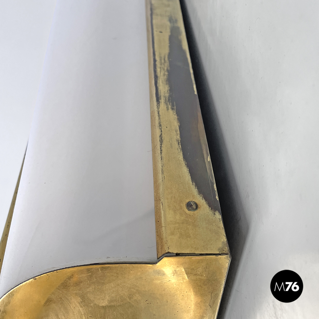 Applique dalla forma allungata. Il paralume si sviluppa in lunghezza ed è in plexiglass bianco, mentre la struttura finemente decorata è in ottone, e si sviluppa sulla lunghezza della parte frontale dell’applique e nella parte bassa, dove poggia alla parete.