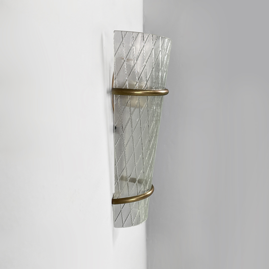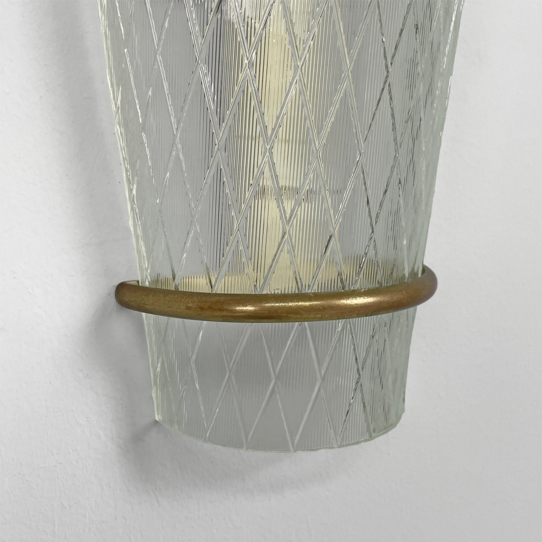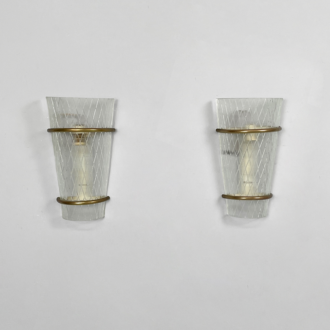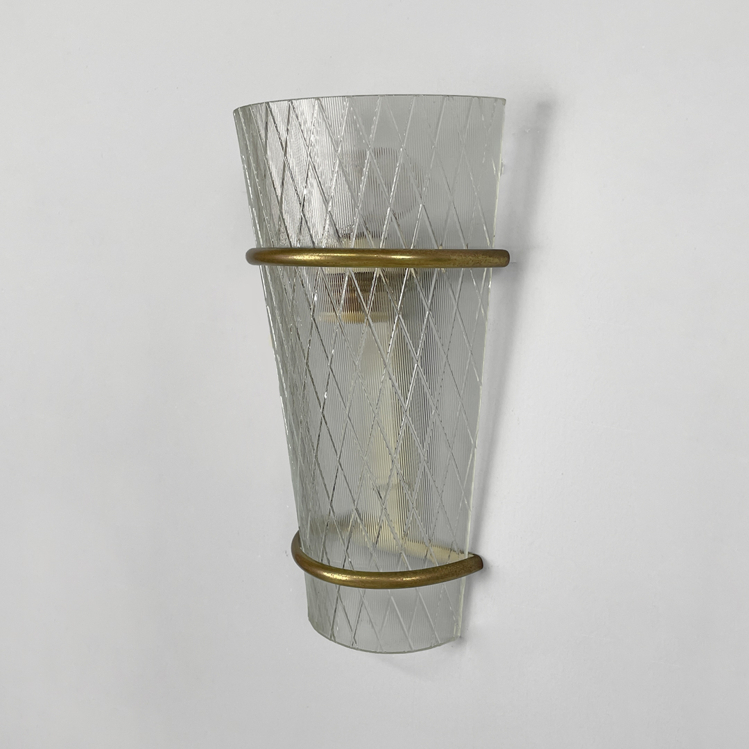 Coppia di applique con diffusore a forma conica. Il vetro presenta delle scanalature decorative. La struttura, su cui poggia il vetro, è in metallo.