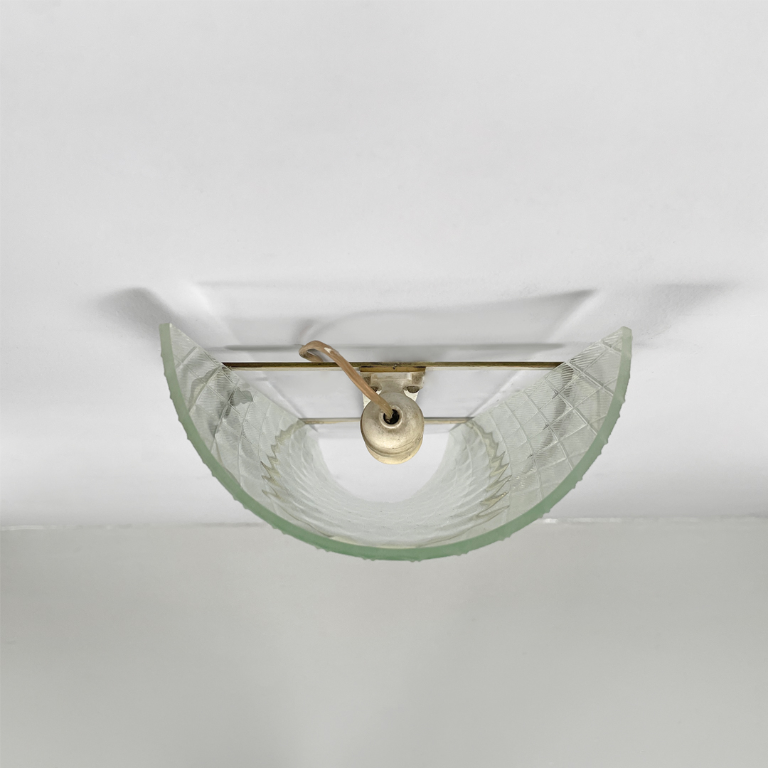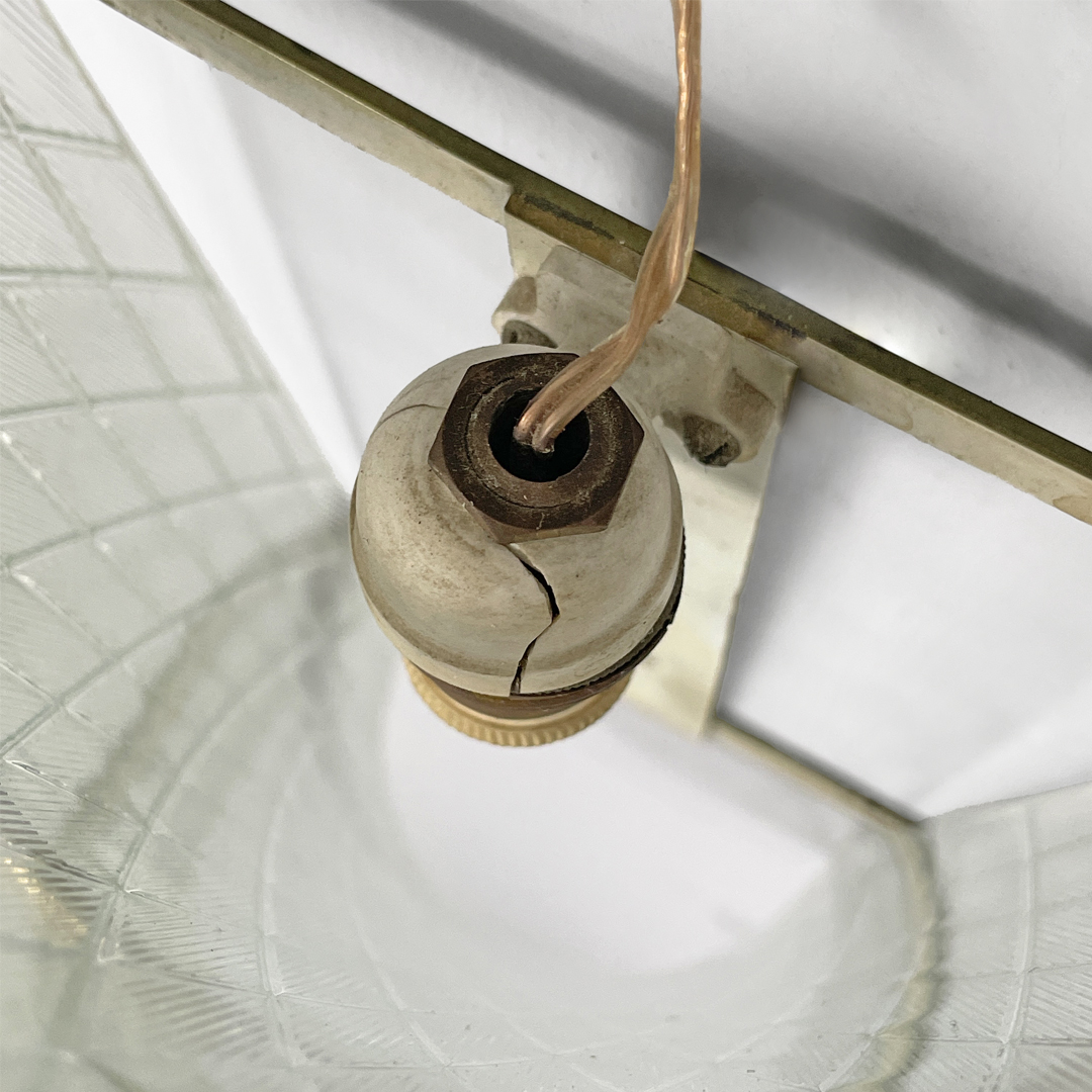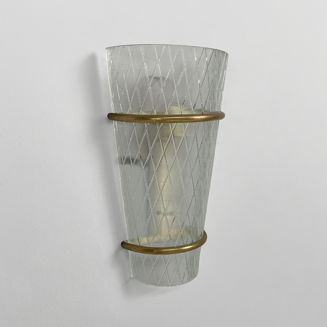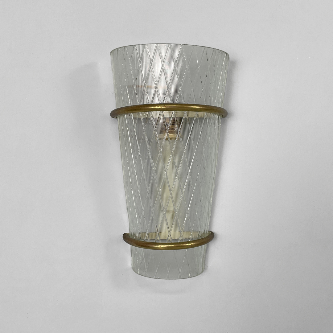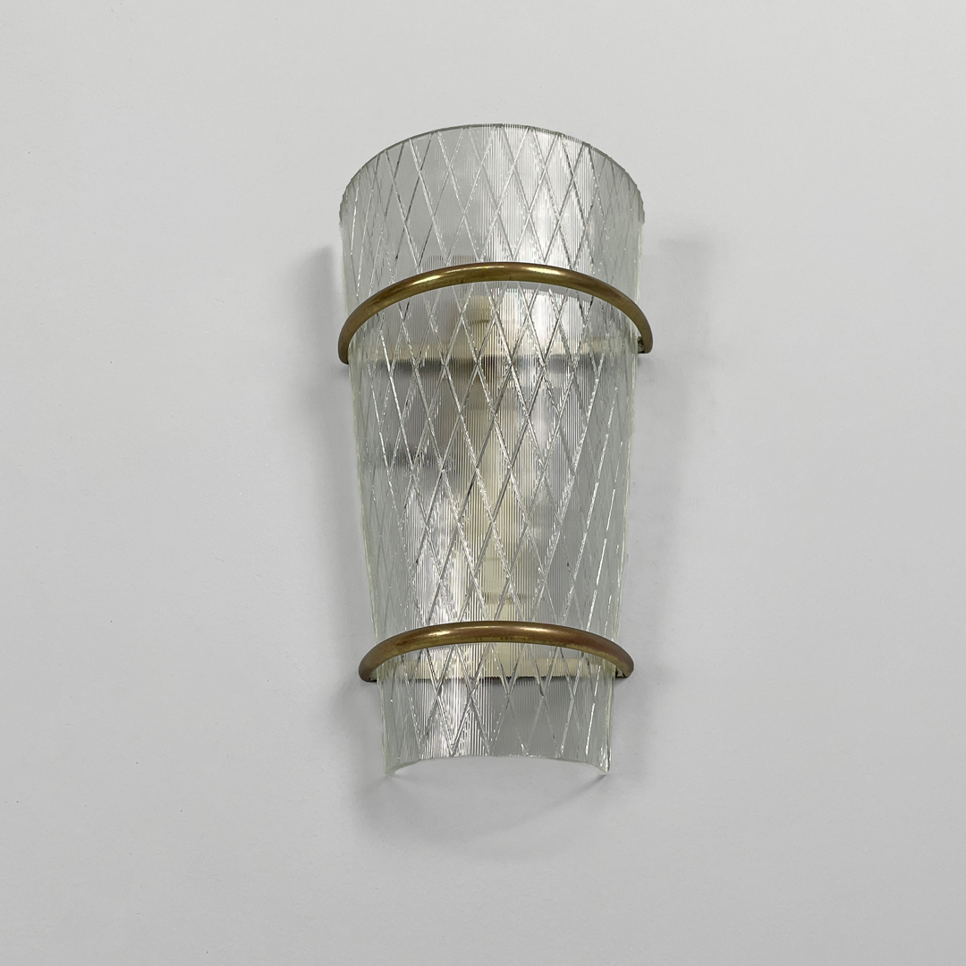 Coppia di applique con diffusore a forma conica. Il vetro presenta delle scanalature decorative. La struttura, su cui poggia il vetro, è in metallo.