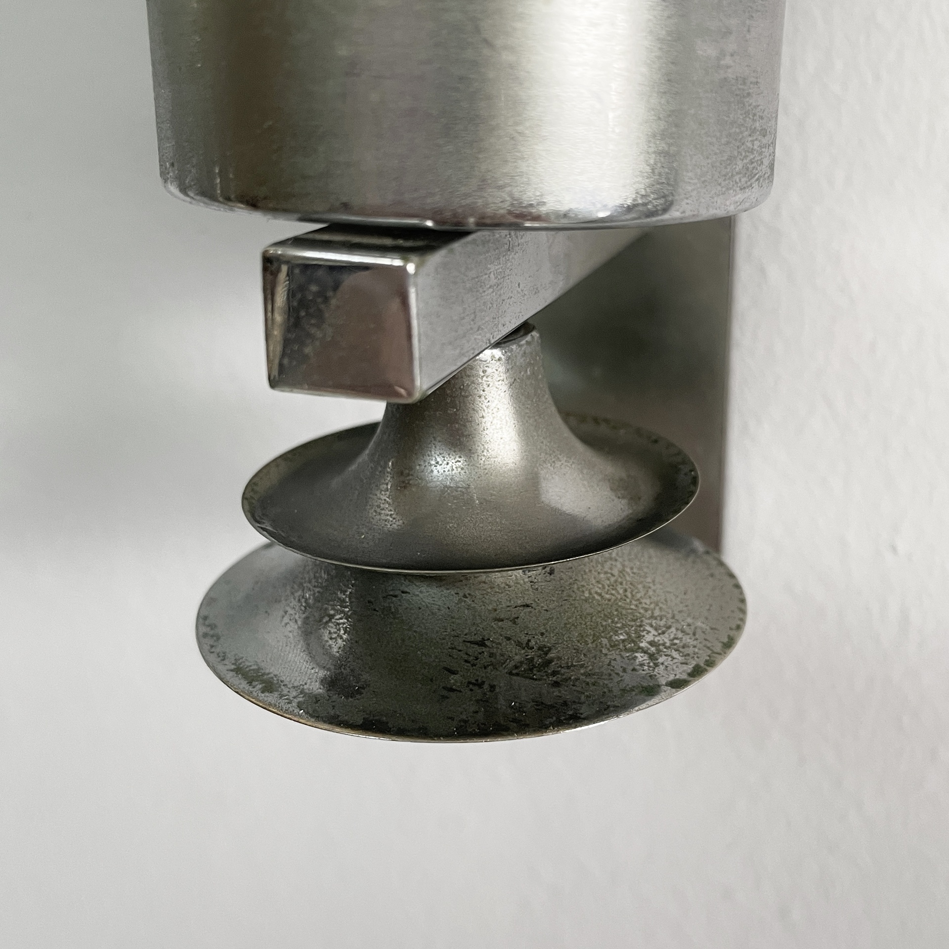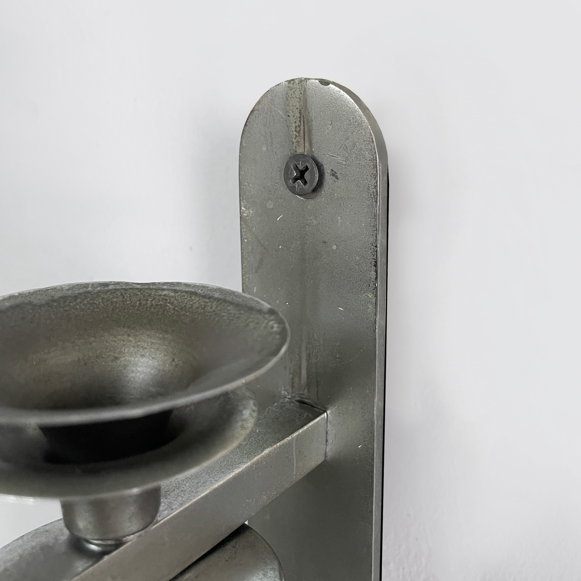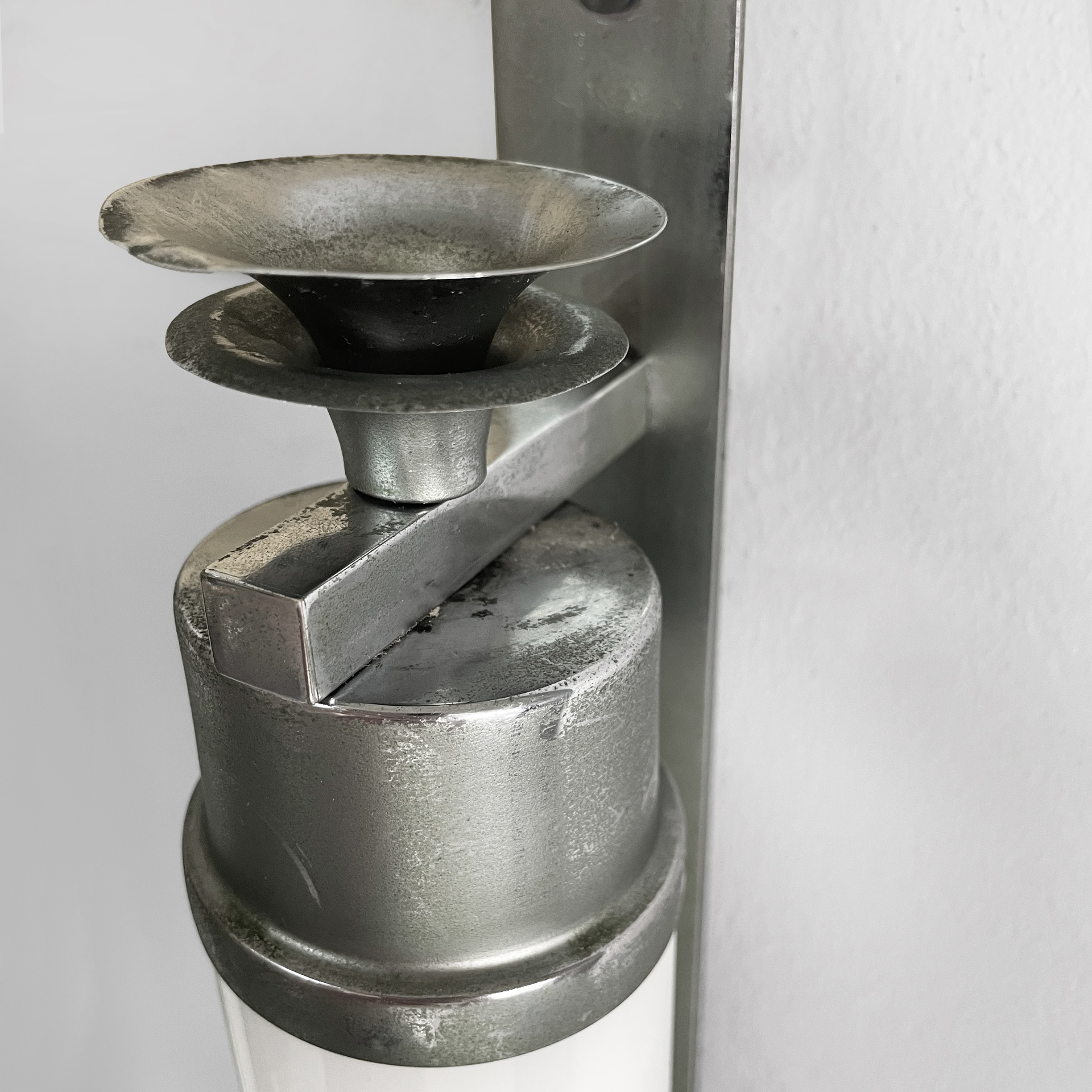 Coppia di applique o lampade da parete con diffusore cilindrico in vetro opalino con le estremità in metallo. All’interno sono presenti due lampadine E27. Alle estremità sono presenti delle decorazioni metalliche. Due listelli orizzontali collegano il diffusore all’attacco a parete ovale in metallo. Utilizzabili anche in orizzontale. Art Deco.