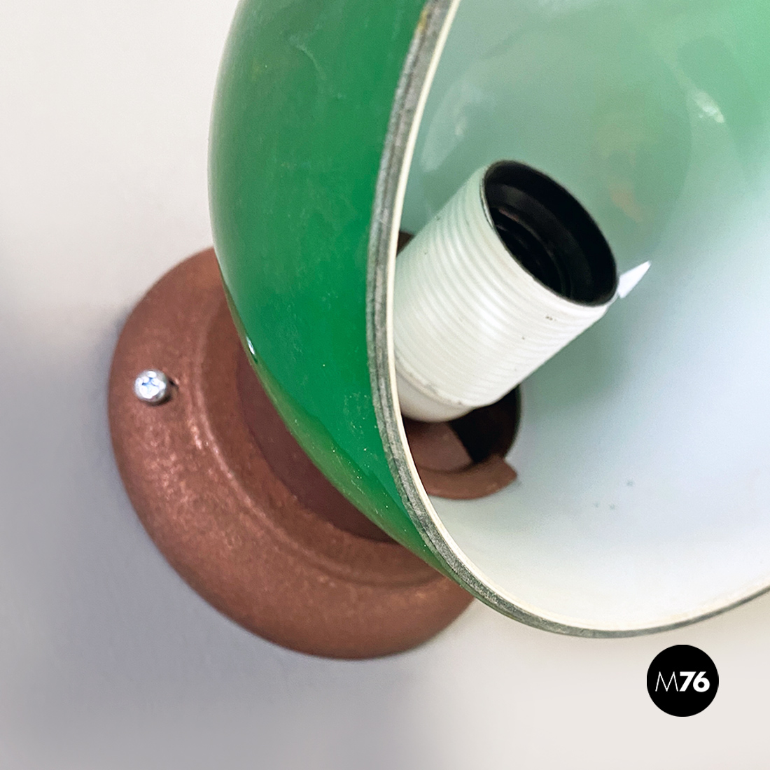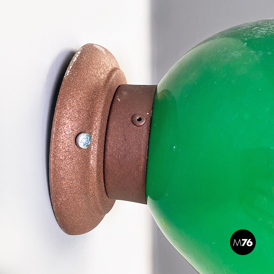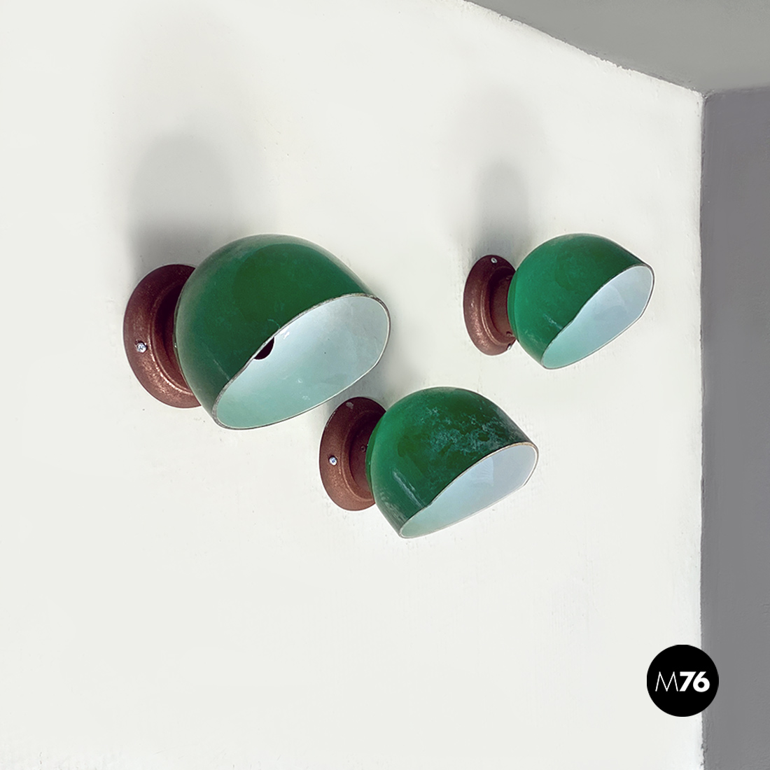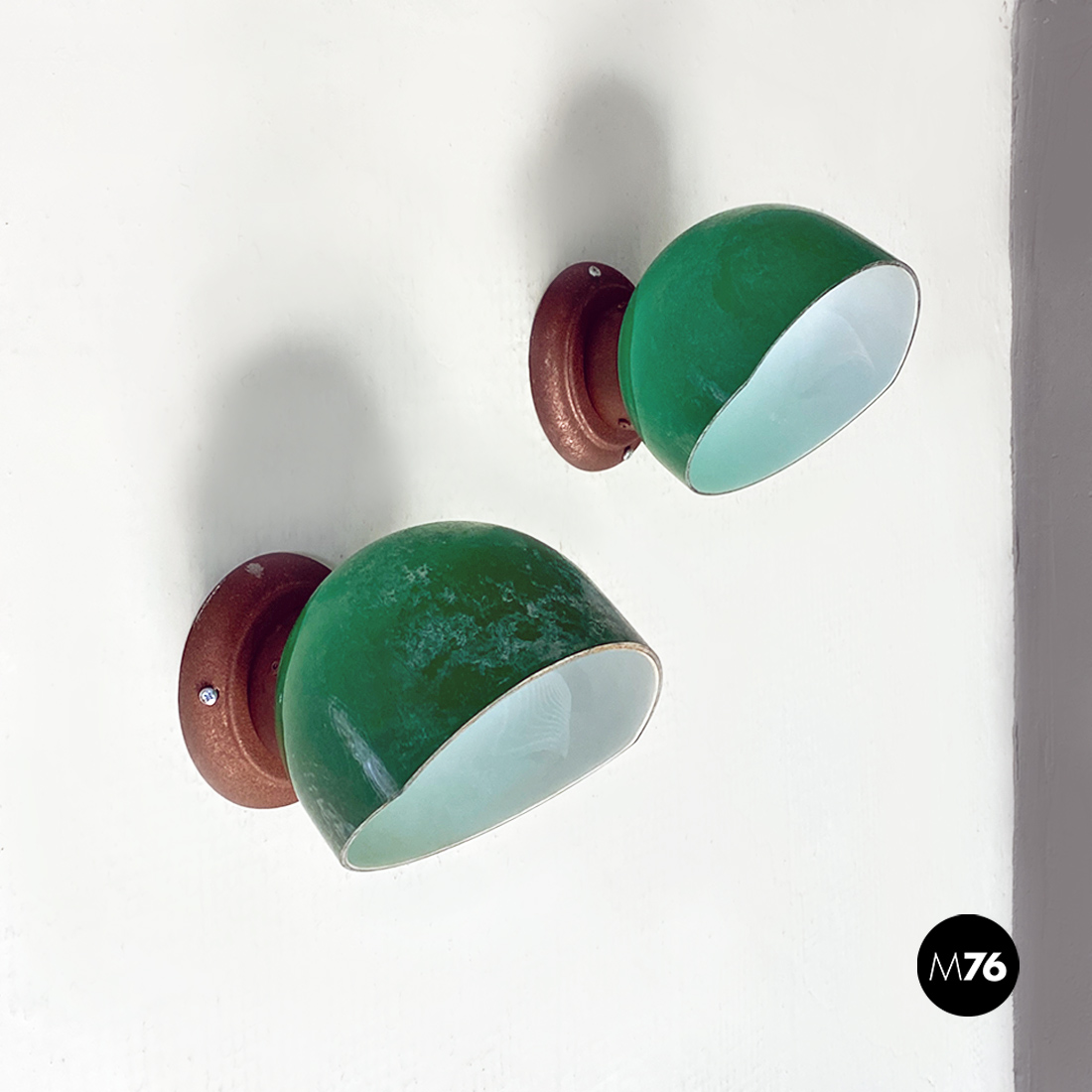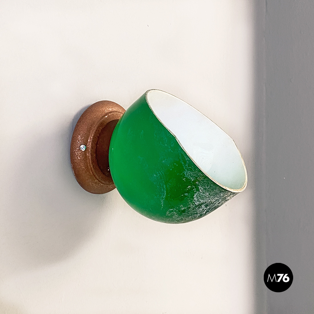 Set di tre appliques in vetro incamiciato verde all’esterno e bianco all’interno, con portalampada in lamiera.