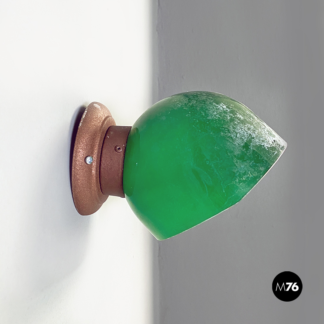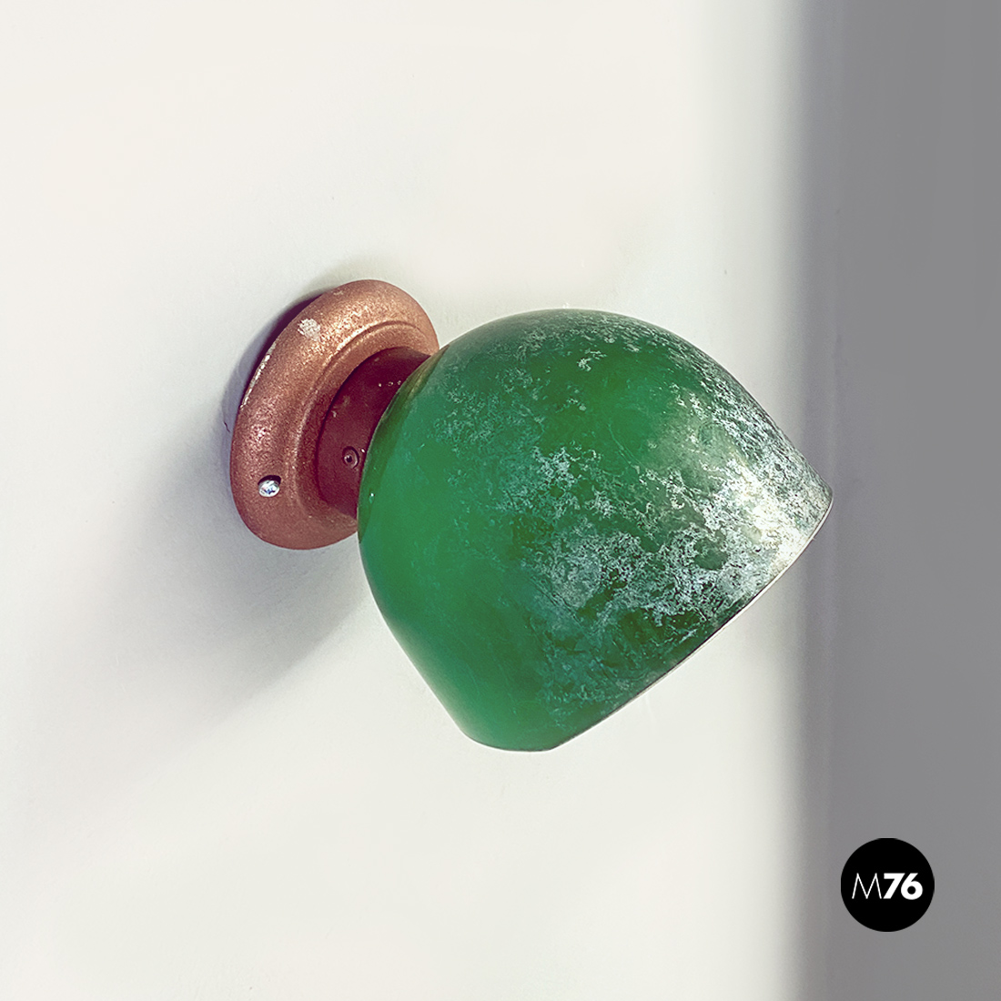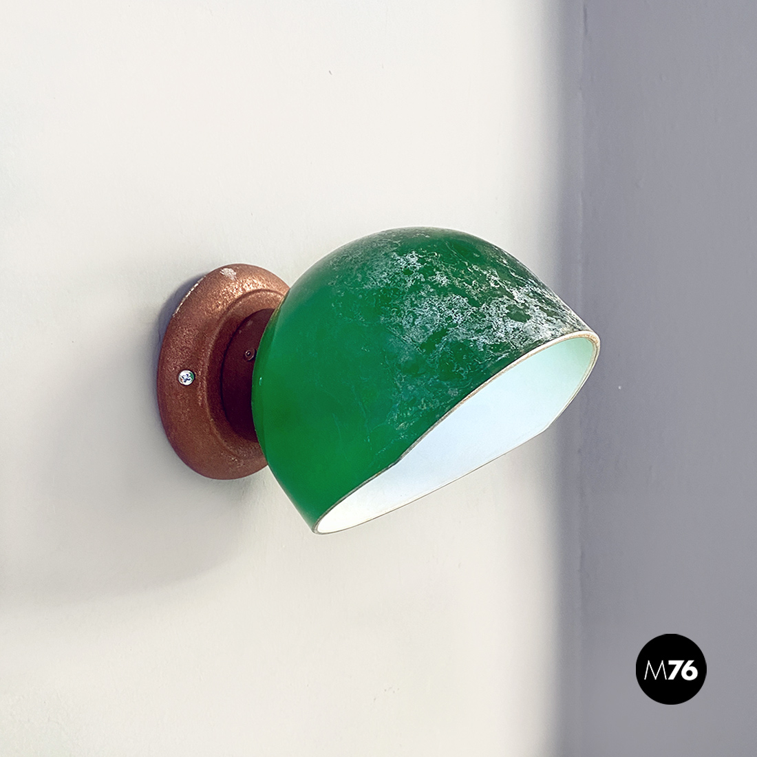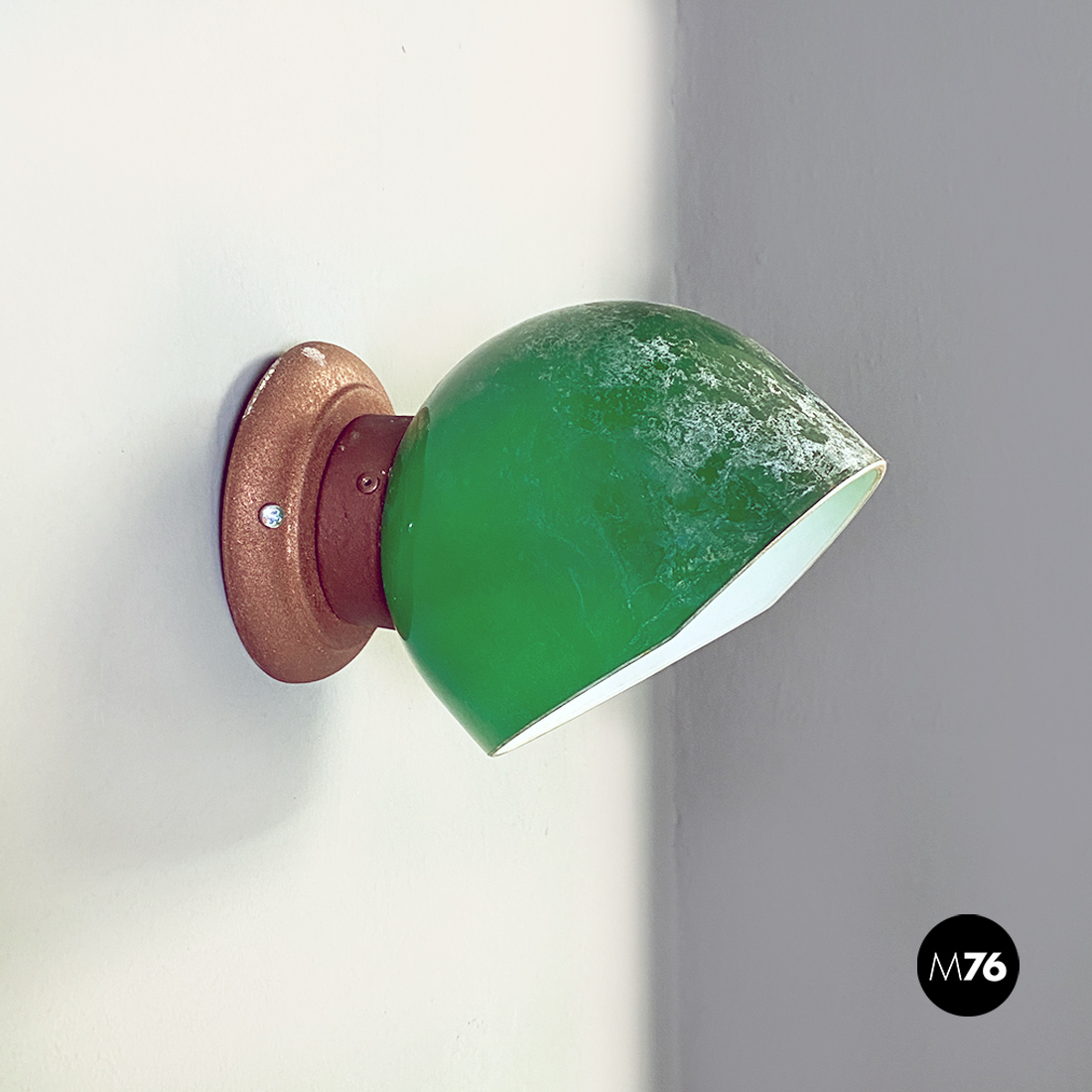 Set di tre appliques in vetro incamiciato verde all’esterno e bianco all’interno, con portalampada in lamiera.