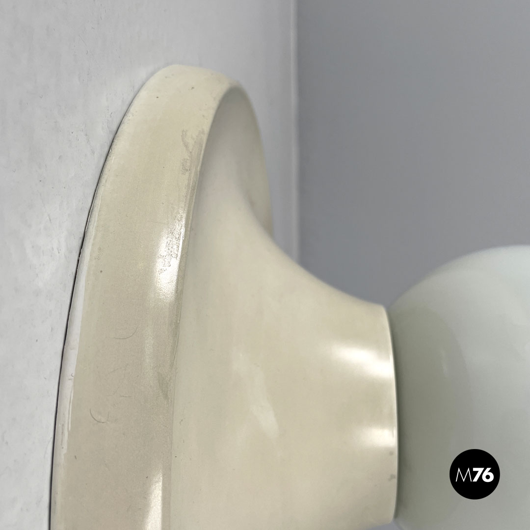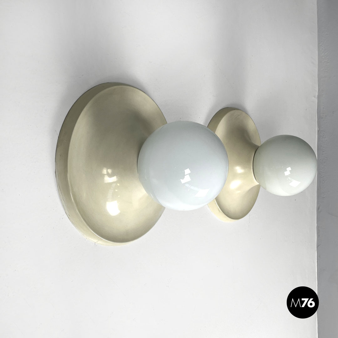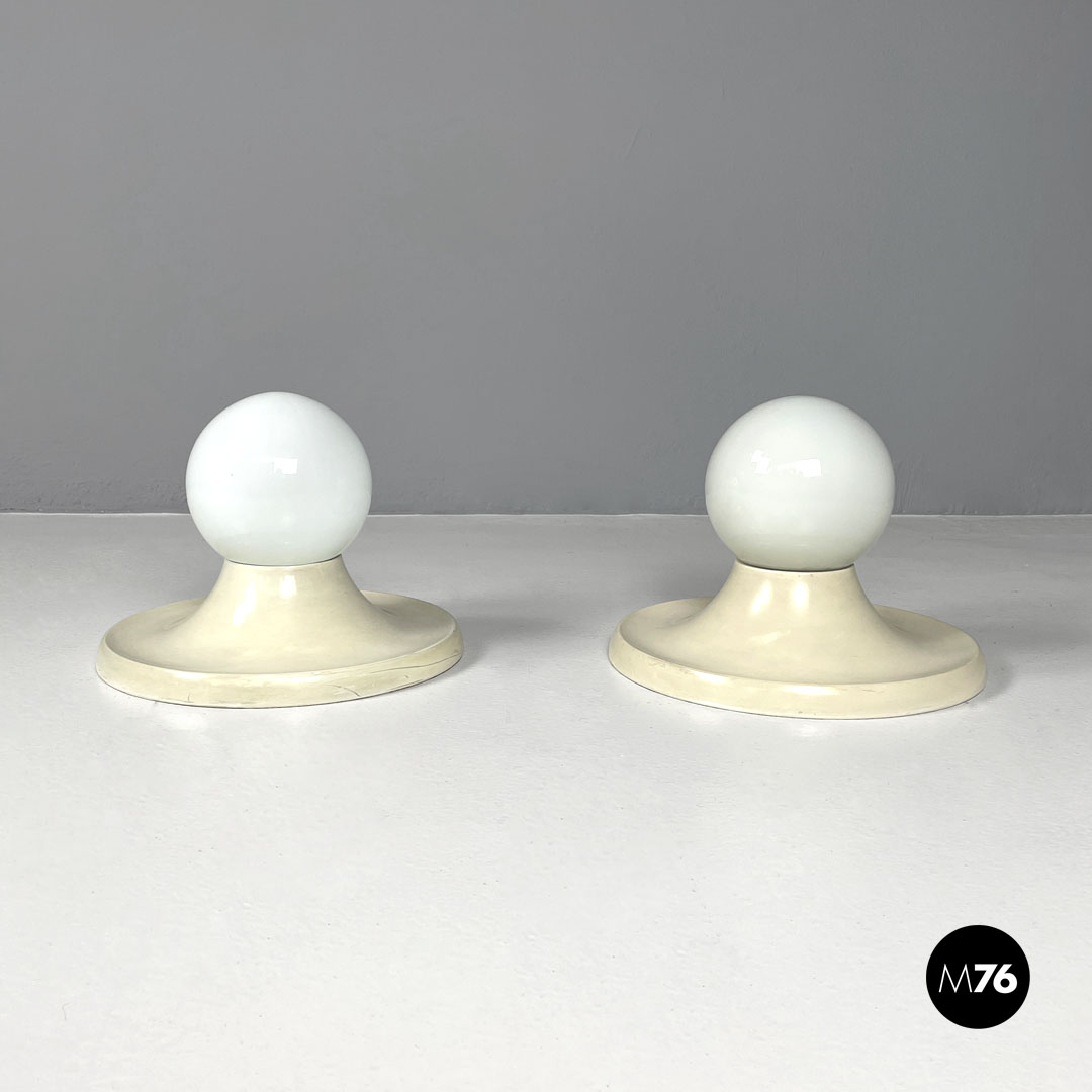 Coppia di applique o plafoniere modello Light Ball con diffusore sferico in vetro opalino. La struttura a base tonda è in metallo smaltato bianco-avorio.