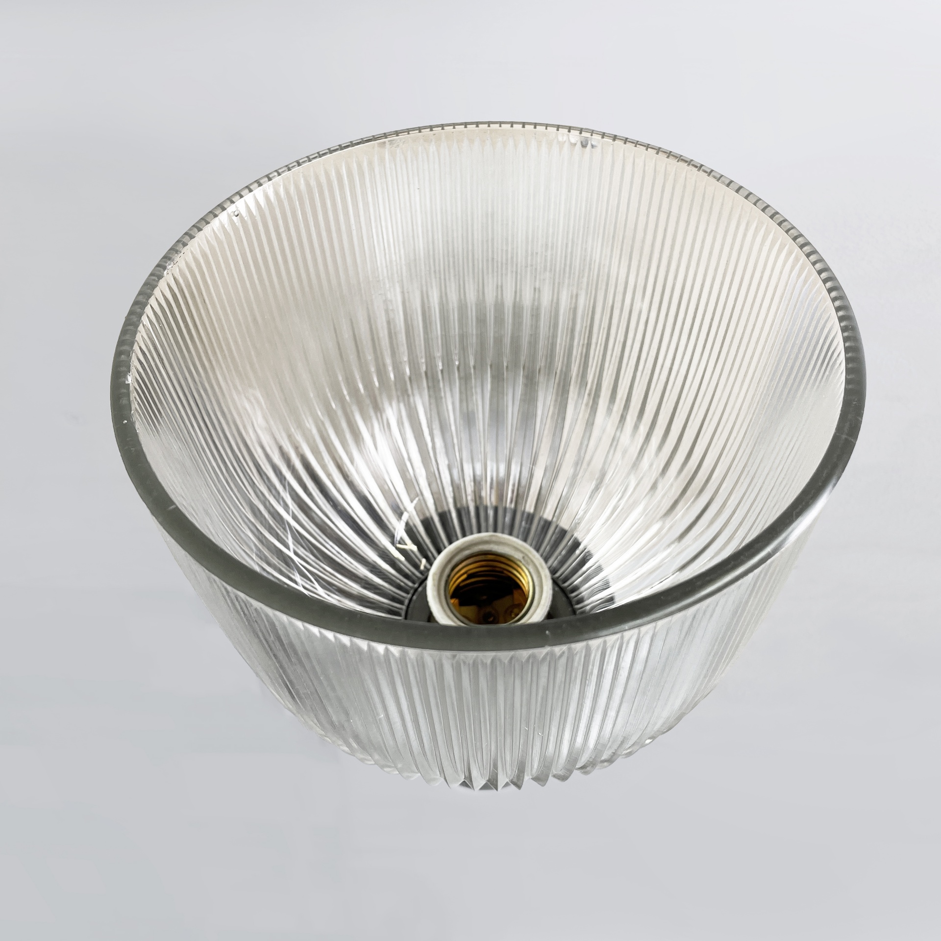 Set di tre applique o lampade da parete modello LP5 con diffusore a cupola in vetro stampato. La struttura conica in metallo verniciato nero presenta nella parte superiore una fascia in ottone. La struttura si collega all’attacco a parete rettangolare grazie ad una listello in ottone.