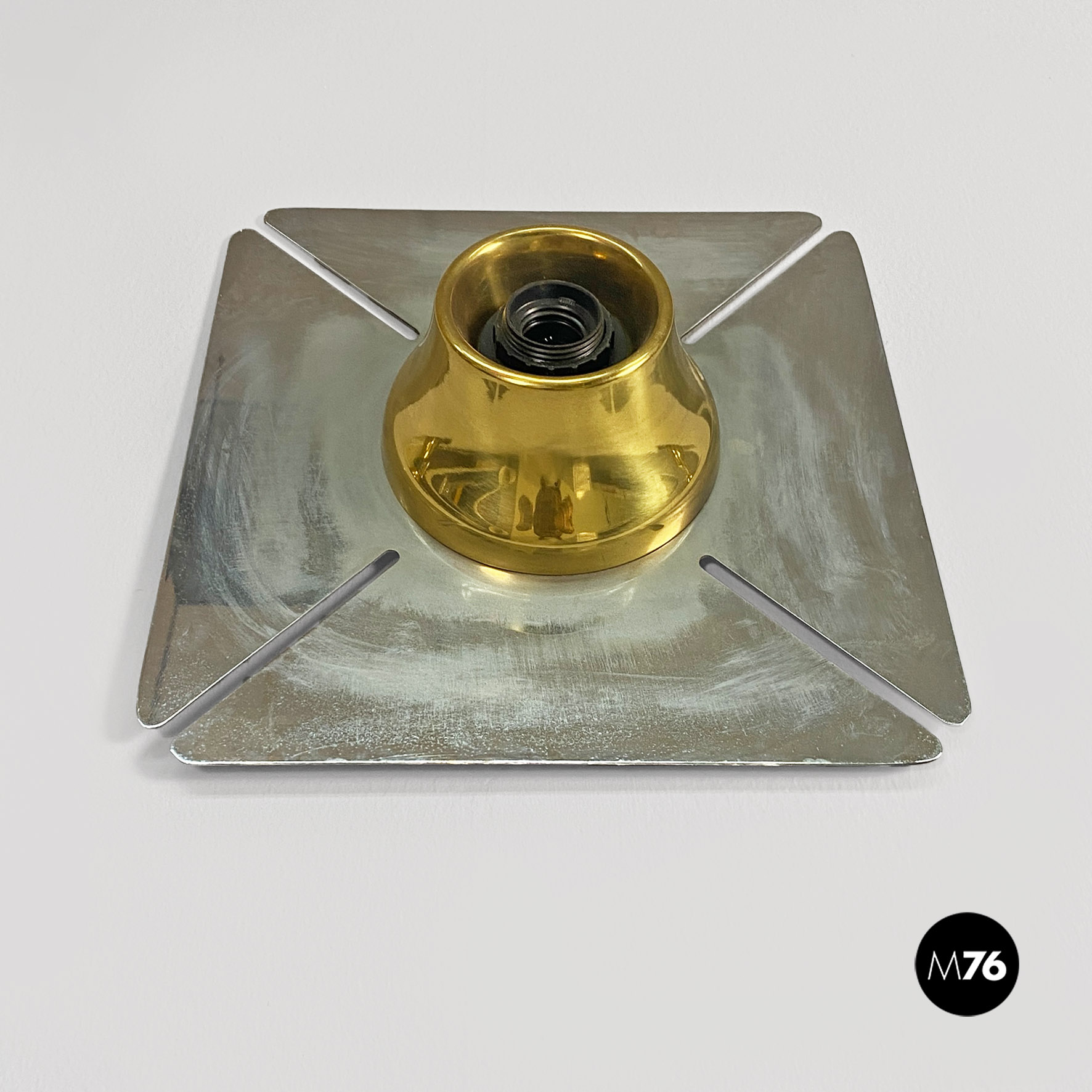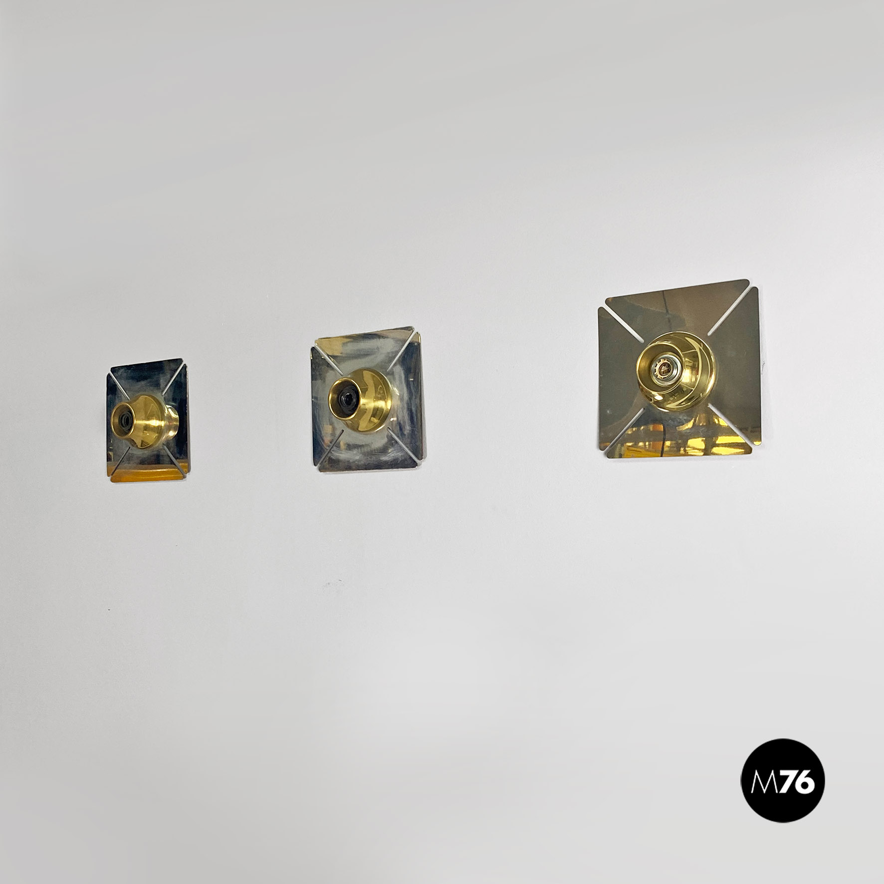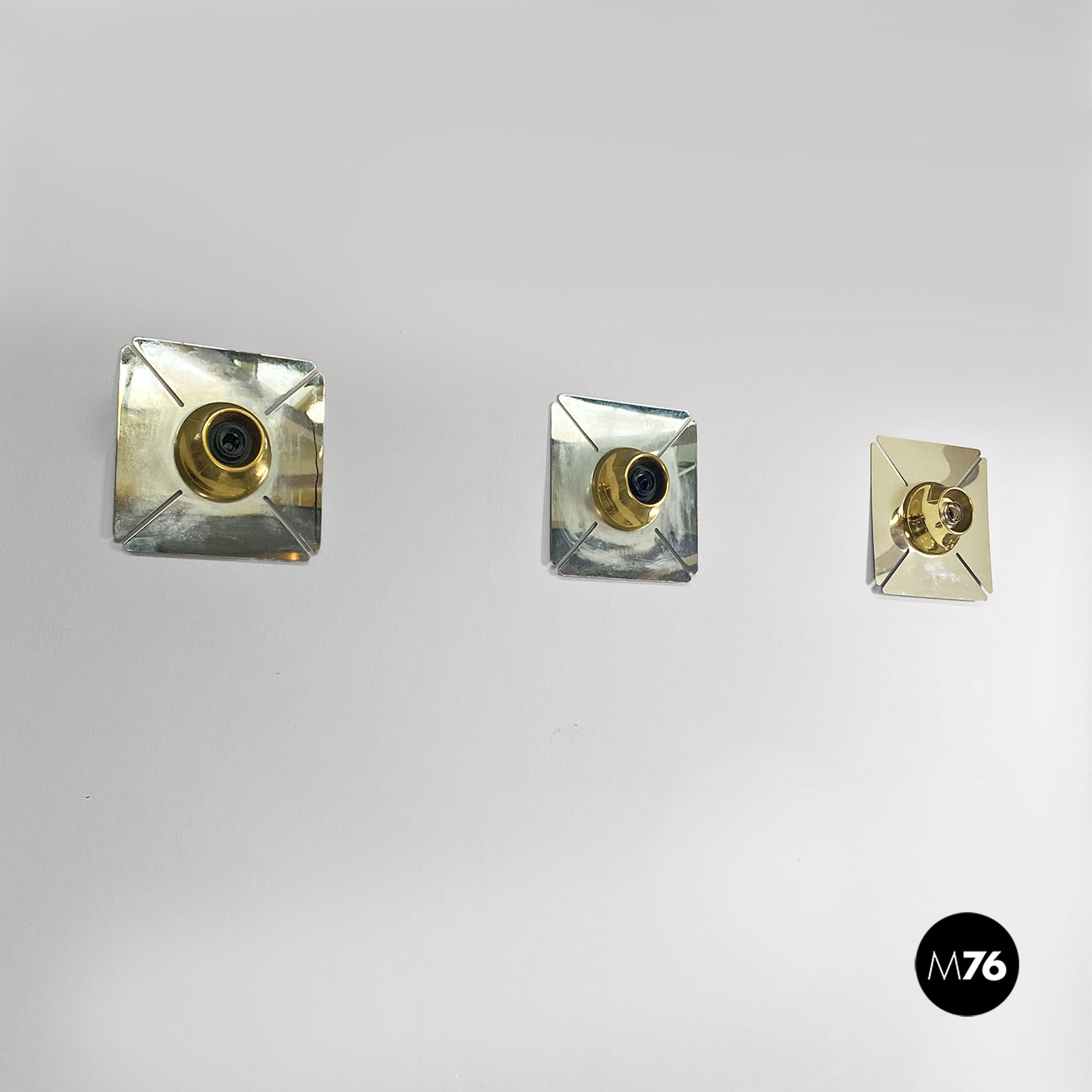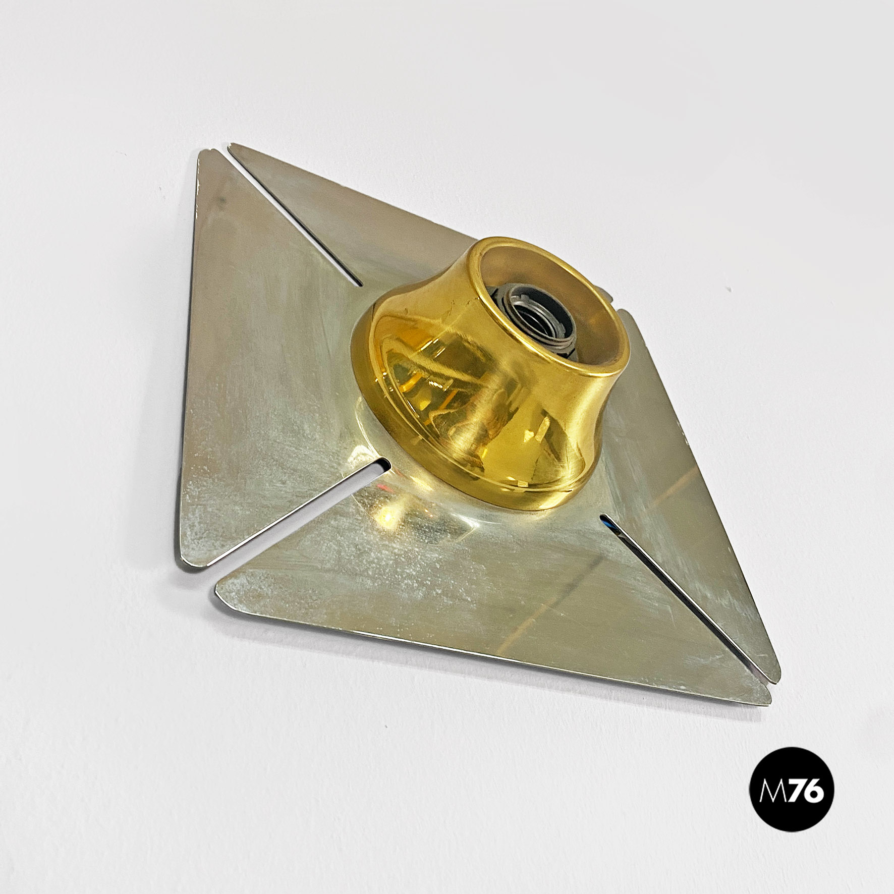 Set di tre applique modello LSP14 Quadrifoglio in acciaio inossidabile e ottone. La lampada presenta al cento il diffusore a base tonda in ottone. Intorno a questo sono presenti quattro lembi flessibili in acciaio, i quali si possono adattare alla curvatura del soffitto o della parete.