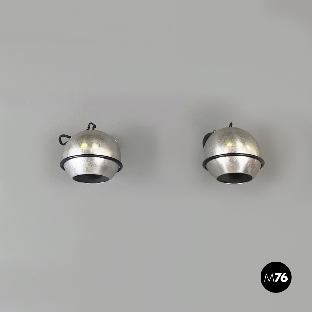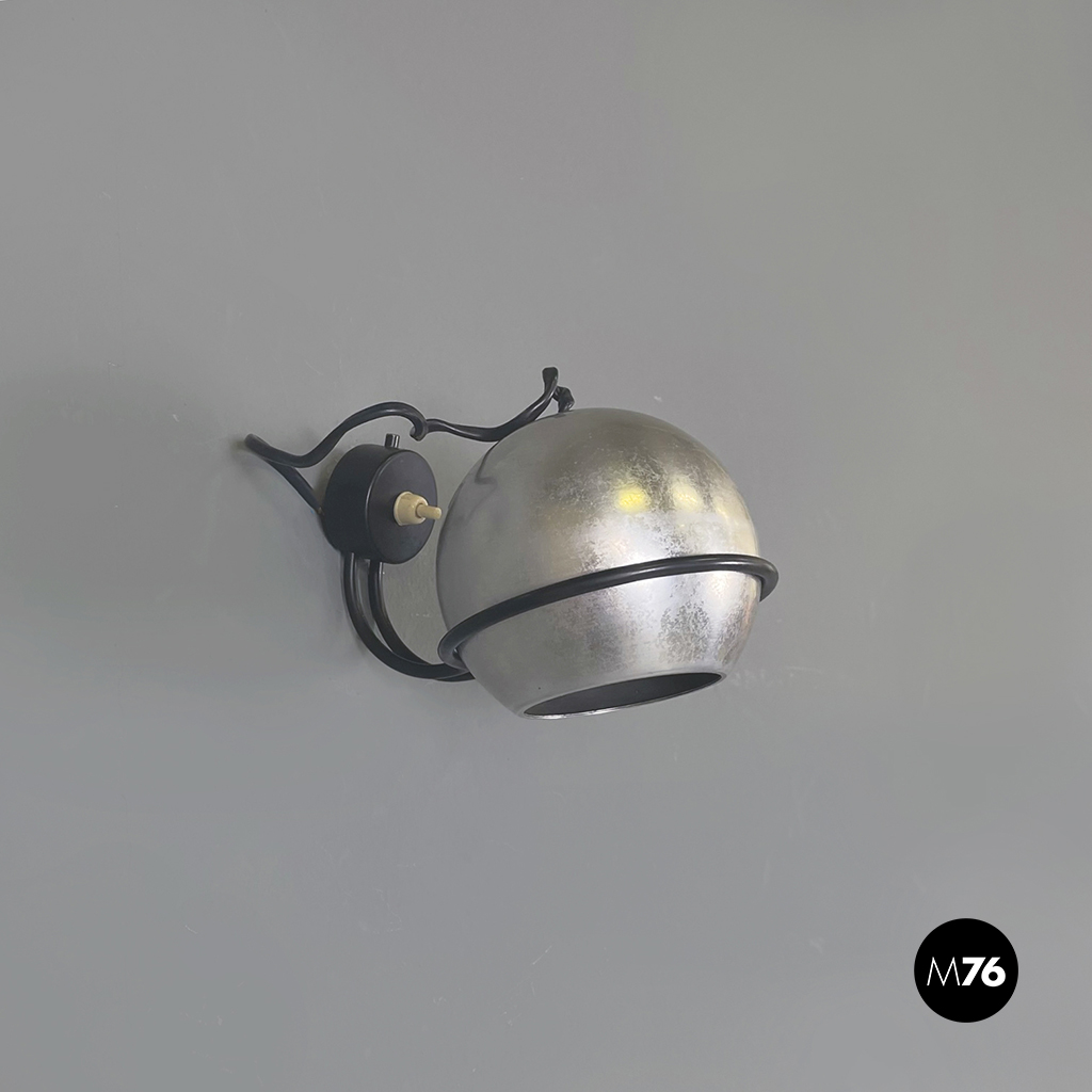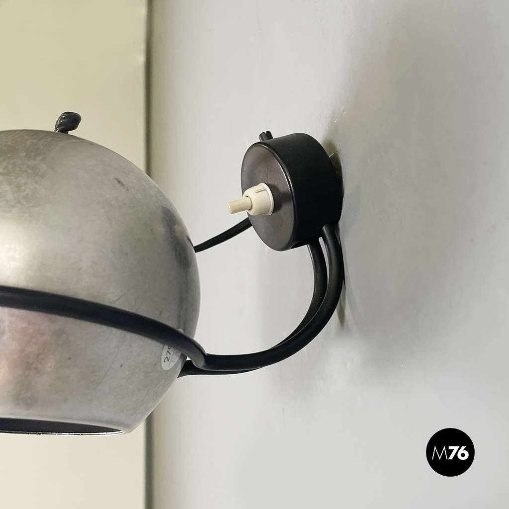 Coppia di applique modello nr. 232 a base tonda in metallo. Il diffusore sferico in acciaio è sostenuto da una struttura in tondino di metallo verniciato nero. L’interruttore è posizionato dietro il diffusore. Posizionabile a piacere.