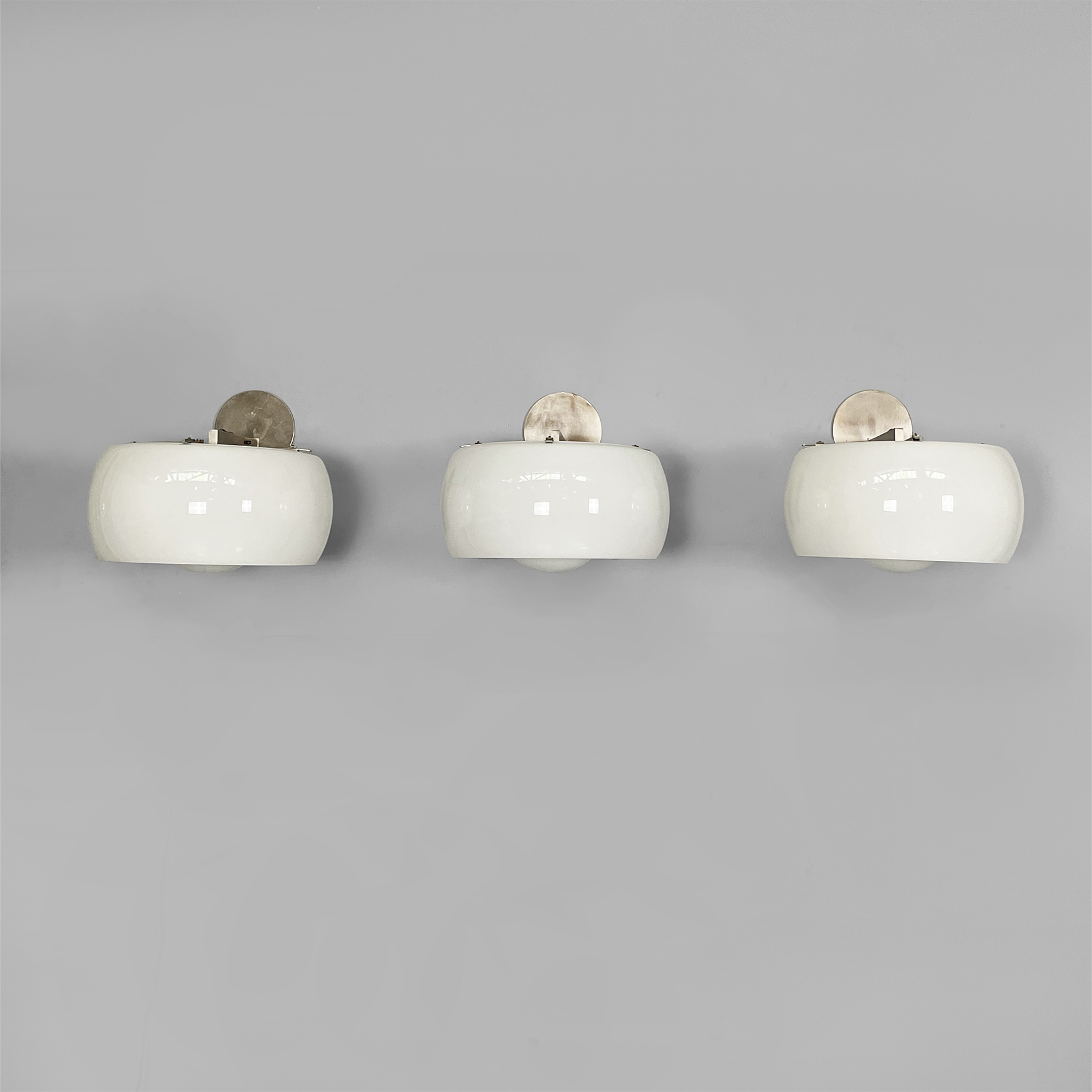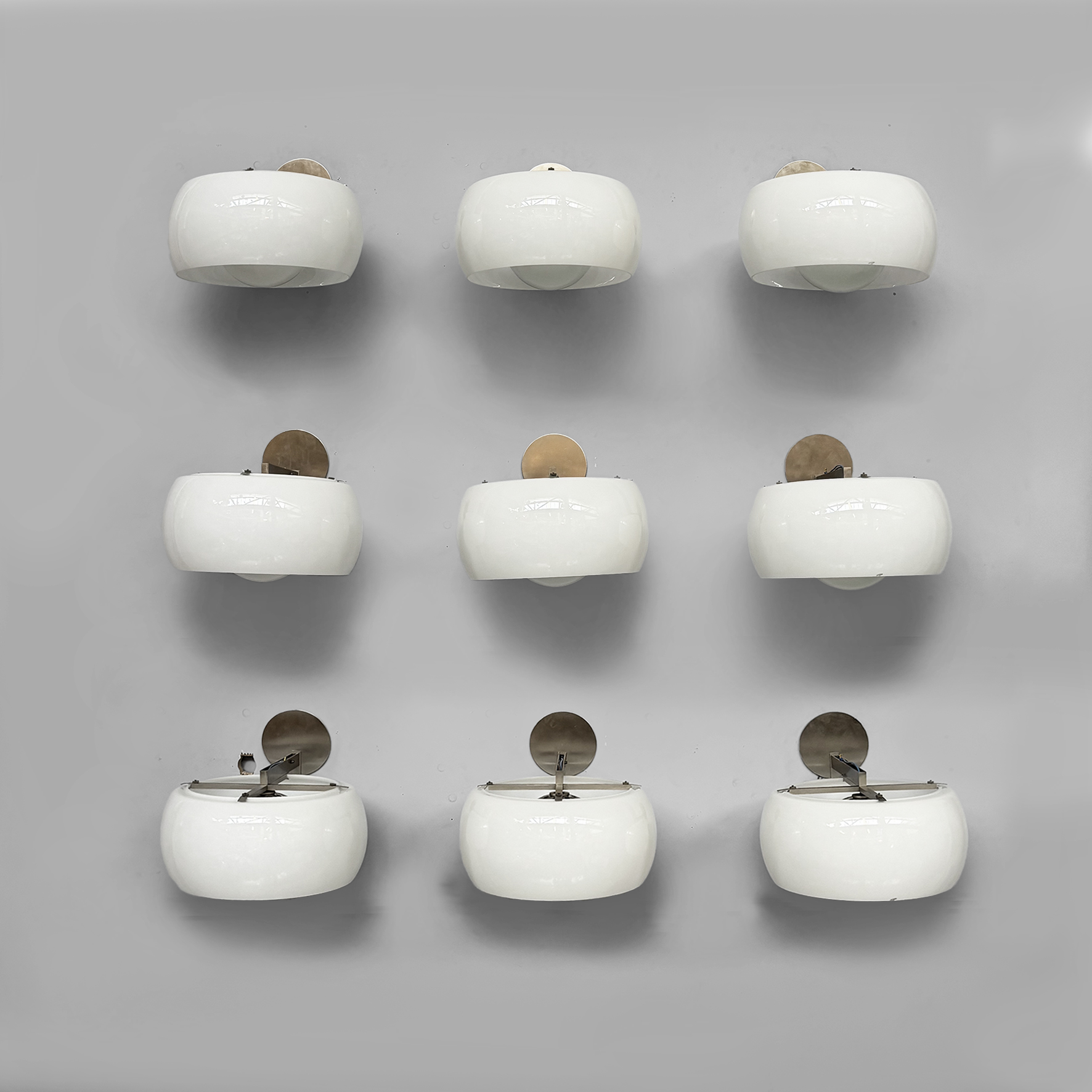 Set di nove applique modello Omega con diffusore cilindrico con sfera interna, in vetro opalino. La lampadina è posizionata all’interno della sfera. Il diffusore è sostenuto da tre bracci e una struttura centrale in ottone nichelato. Attacco a parete tondo, anche esso in ottone nichelato