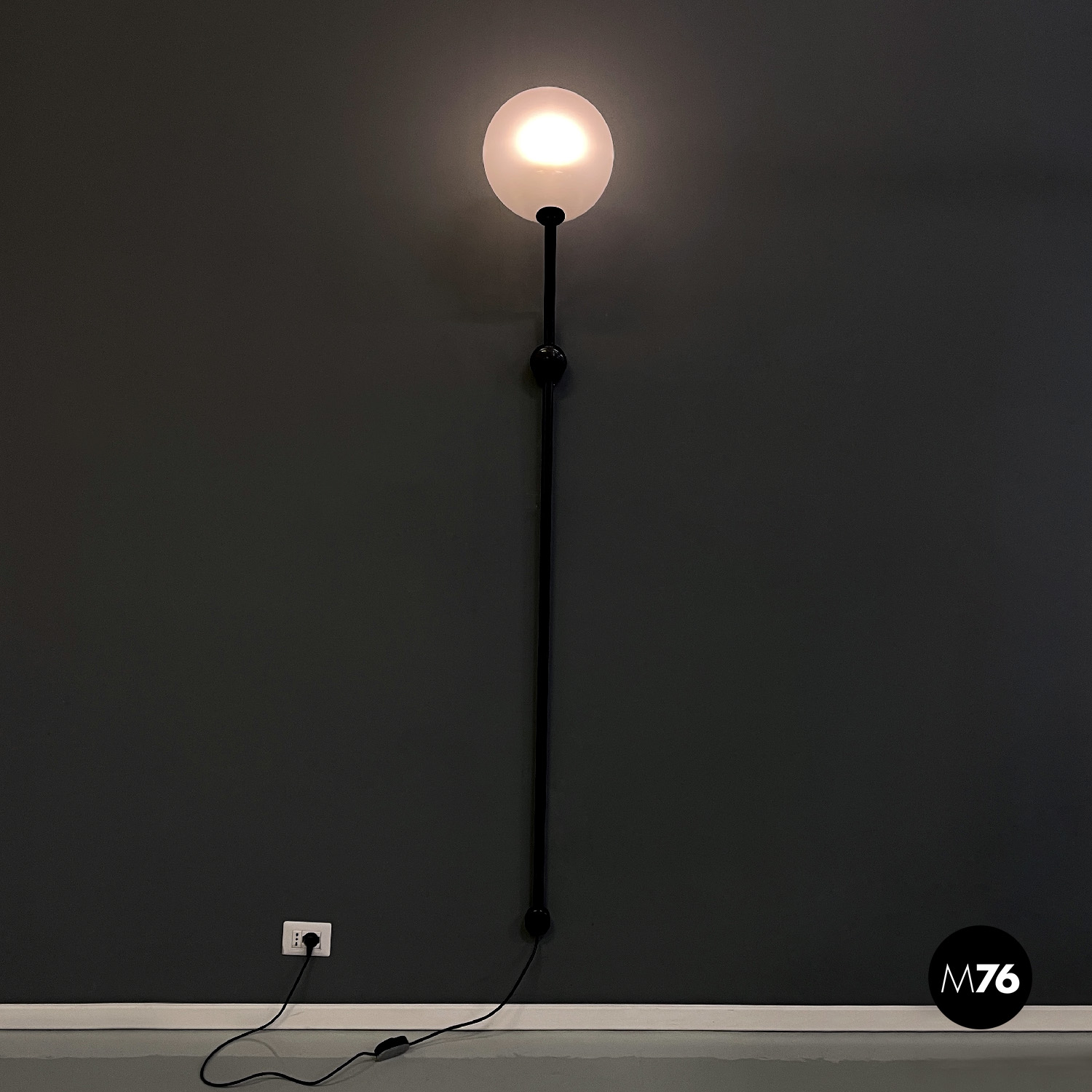 Applique modello Parter verticale. La struttura è in metallo verniciato color grigio canna di fucile con finitura lucida, è composta da uno stelo centrale con due componenti tondi: uno alla base e uno centrale. Nella parte superiore la struttura si estende verso l’esterno e fa da appoggio al diffusore, che è a forma di petalo ed è in vetro opalino.