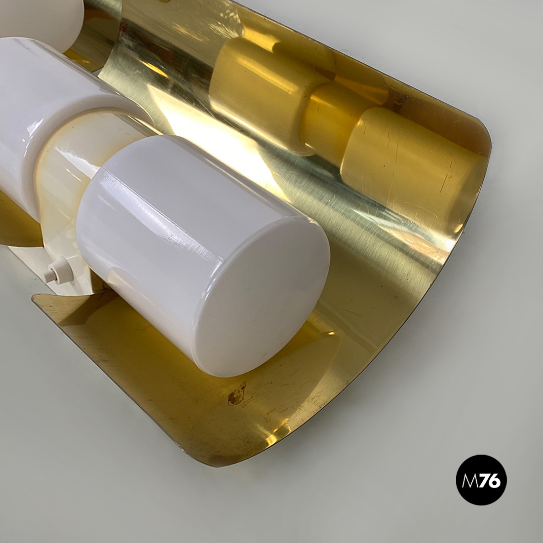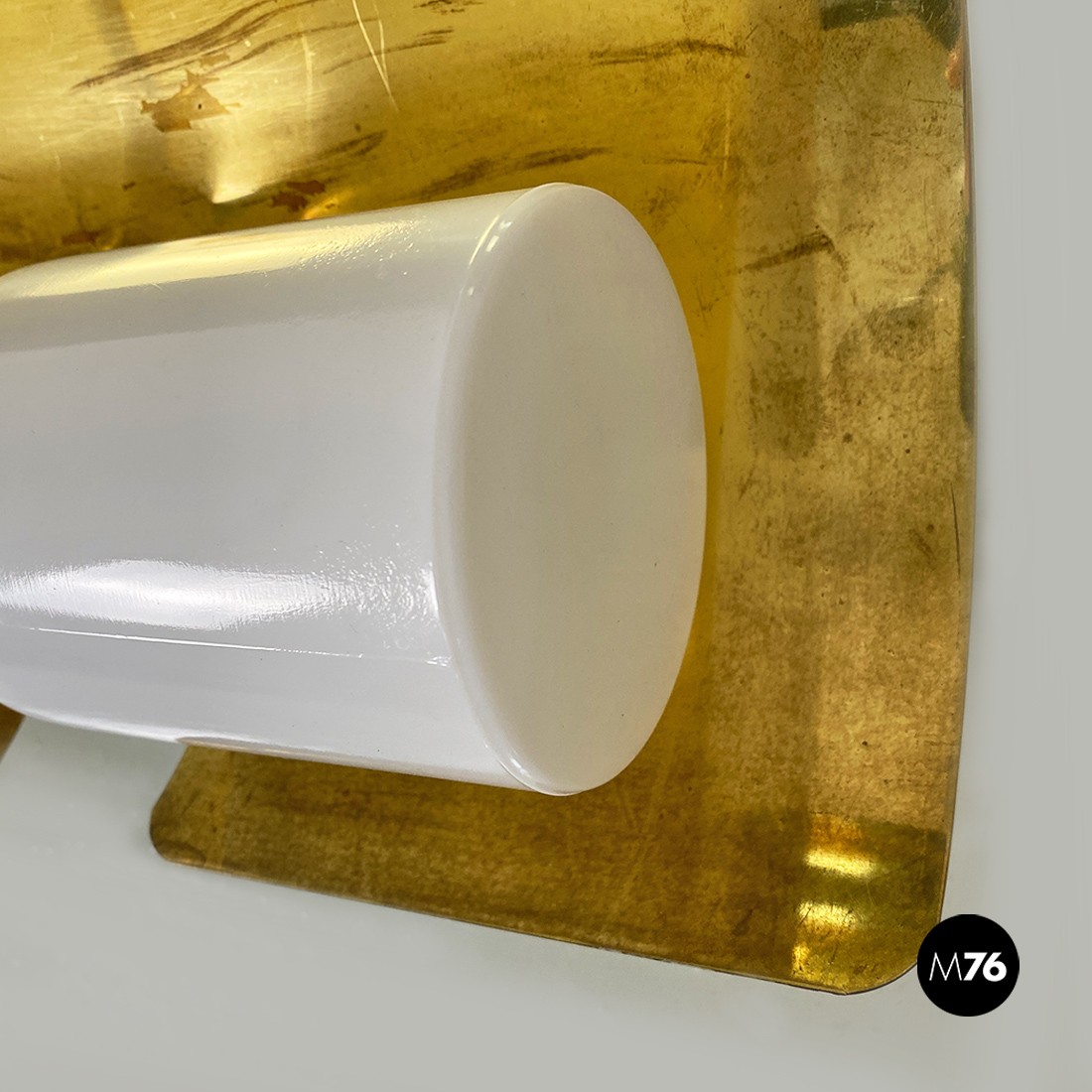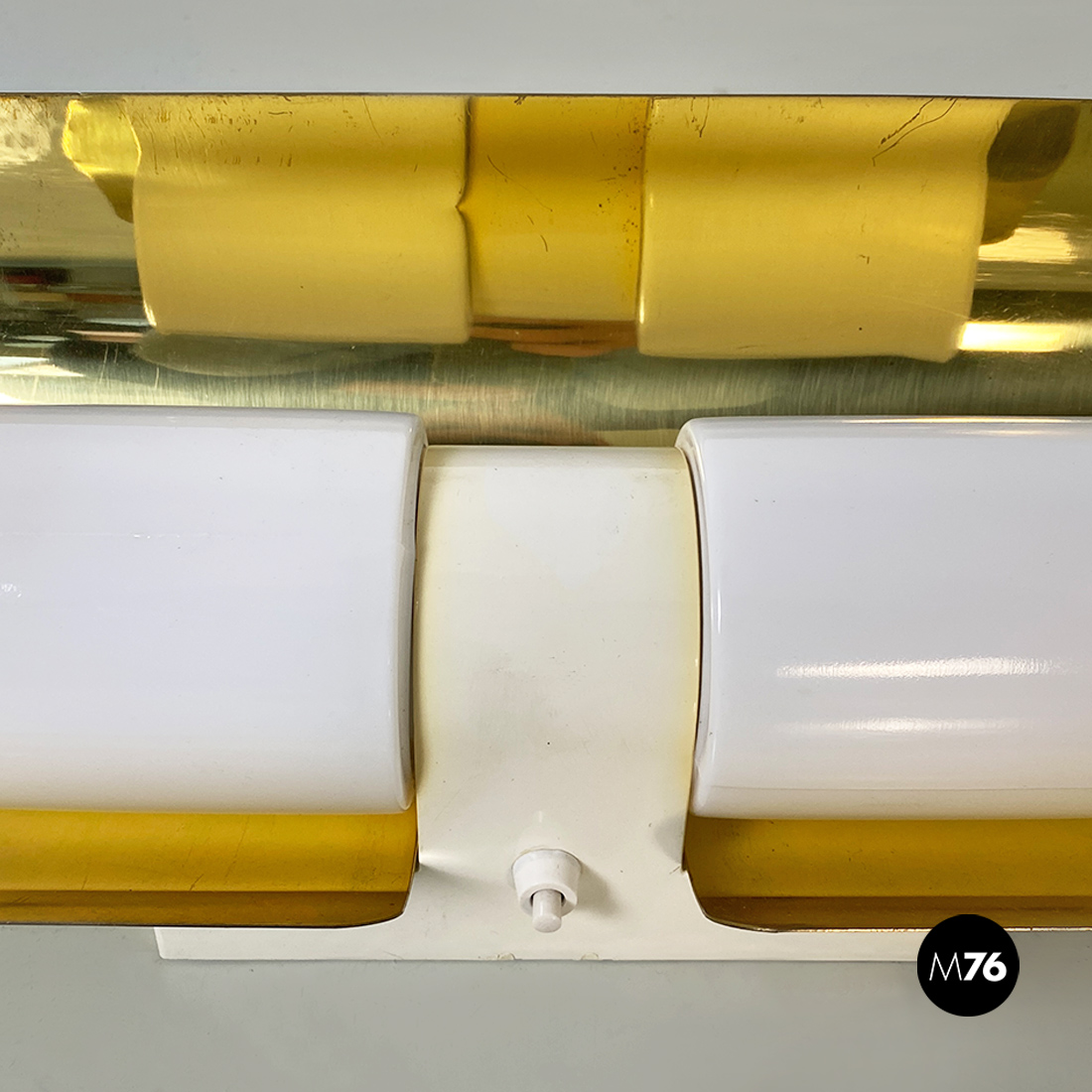 Set di quattro applique o lampade da parete in metallo curvato con finitura in ottone e diffusore in vetro opaline, con parte centrale in ceramica con doppio portalampada ed interruttore.