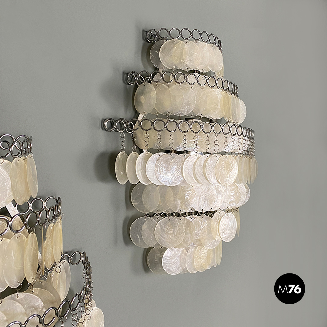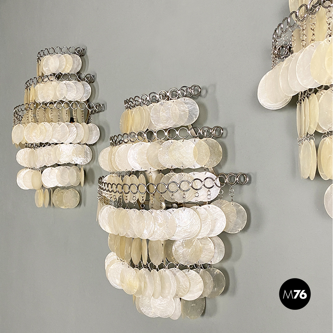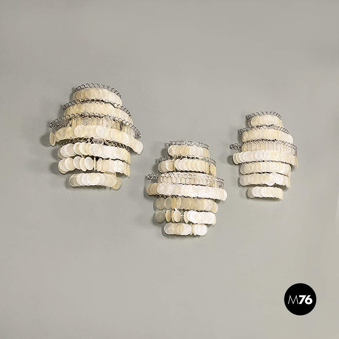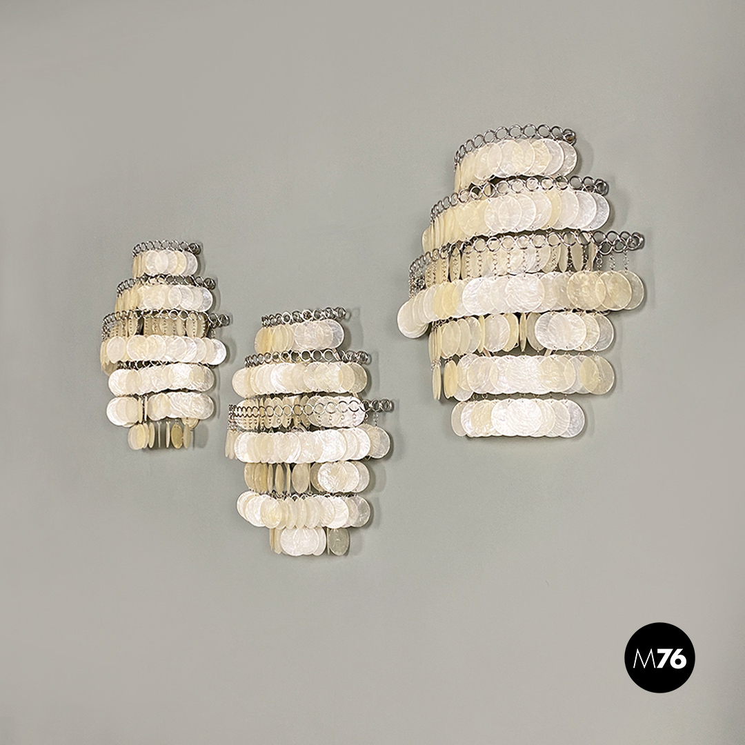 Set di tre appliques o lampade da parete modello Fun, con struttura interna composta da anelli di metallo posti su vari livelli, su cui sono agganciati dei dischi pendenti in vetro, legati tra loro da altri anelli di dimensioni minori a formare una catena.