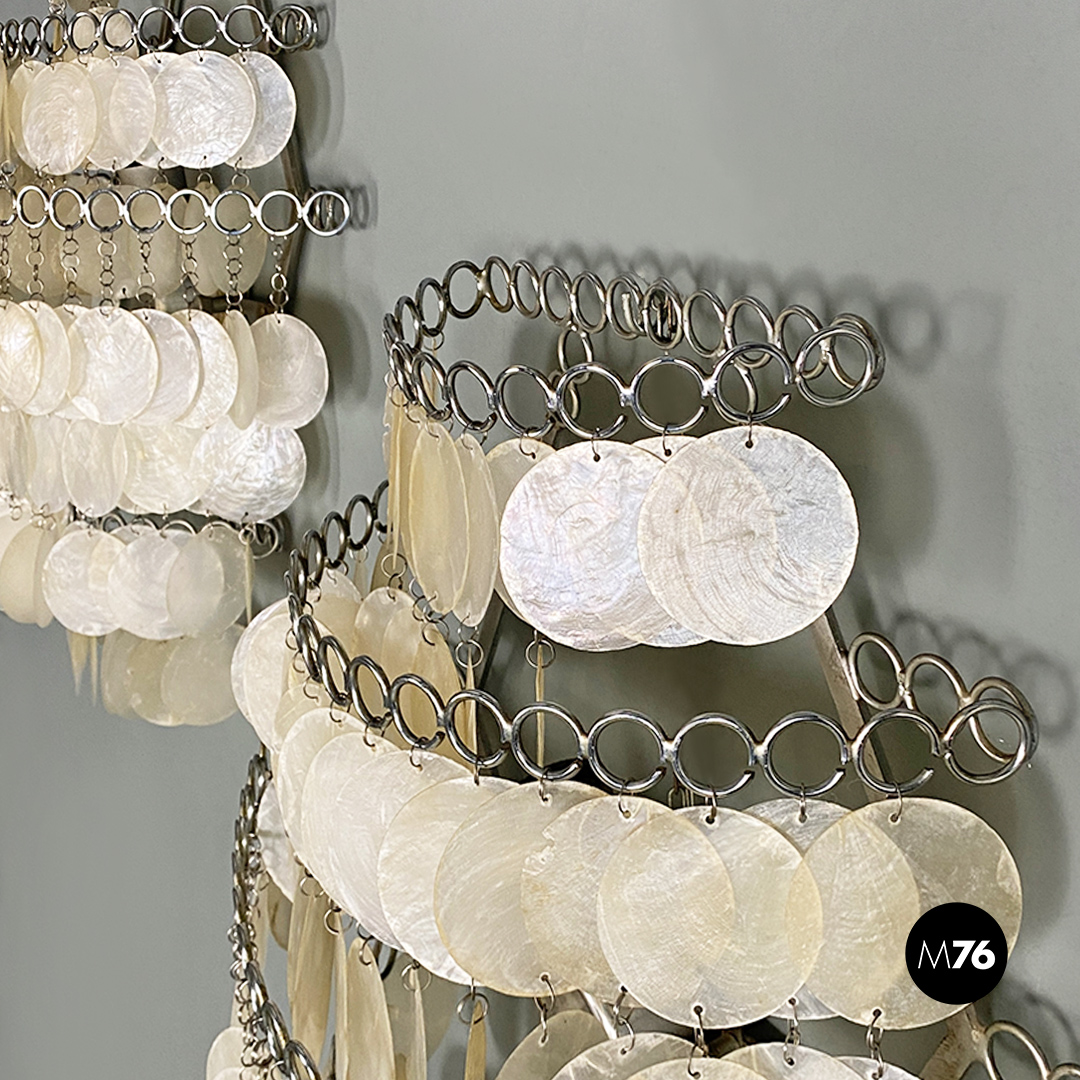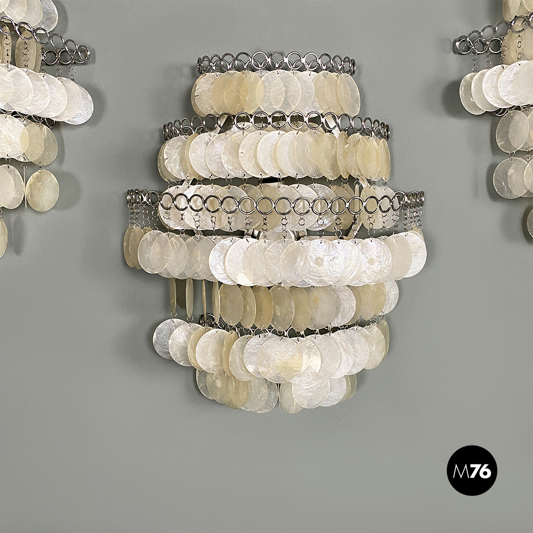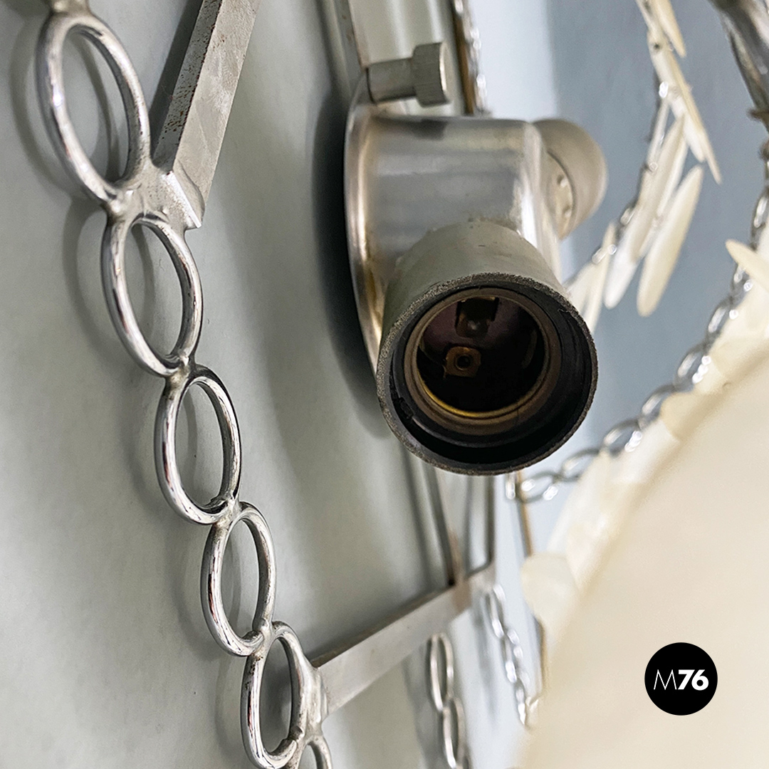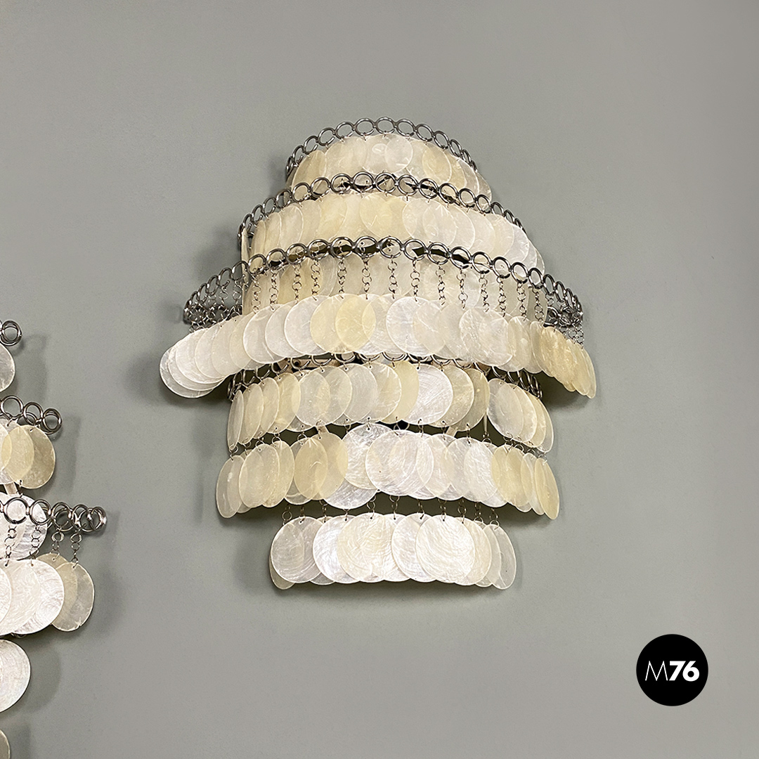 Set di tre appliques o lampade da parete modello Fun, con struttura interna composta da anelli di metallo posti su vari livelli, su cui sono agganciati dei dischi pendenti in vetro, legati tra loro da altri anelli di dimensioni minori a formare una catena.