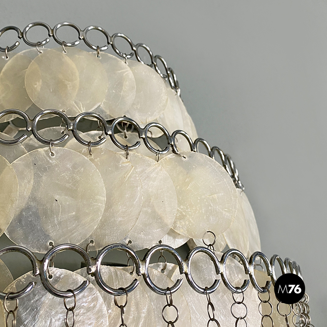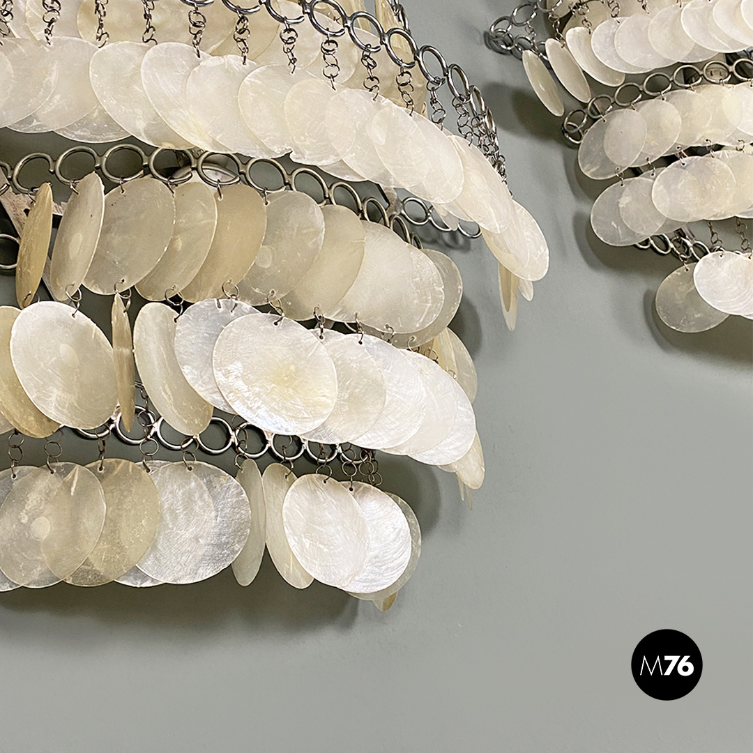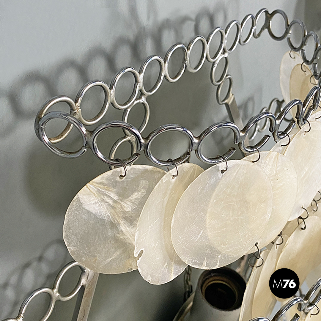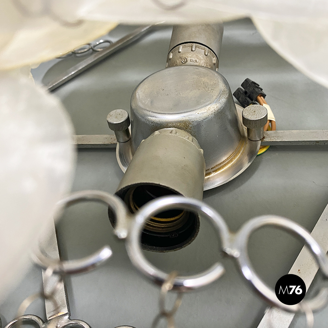 Set di tre appliques o lampade da parete modello Fun, con struttura interna composta da anelli di metallo posti su vari livelli, su cui sono agganciati dei dischi pendenti in vetro, legati tra loro da altri anelli di dimensioni minori a formare una catena.