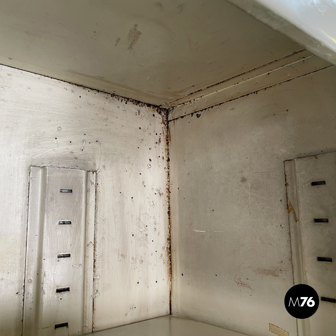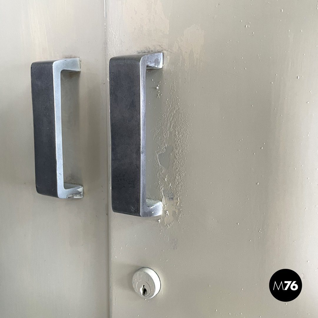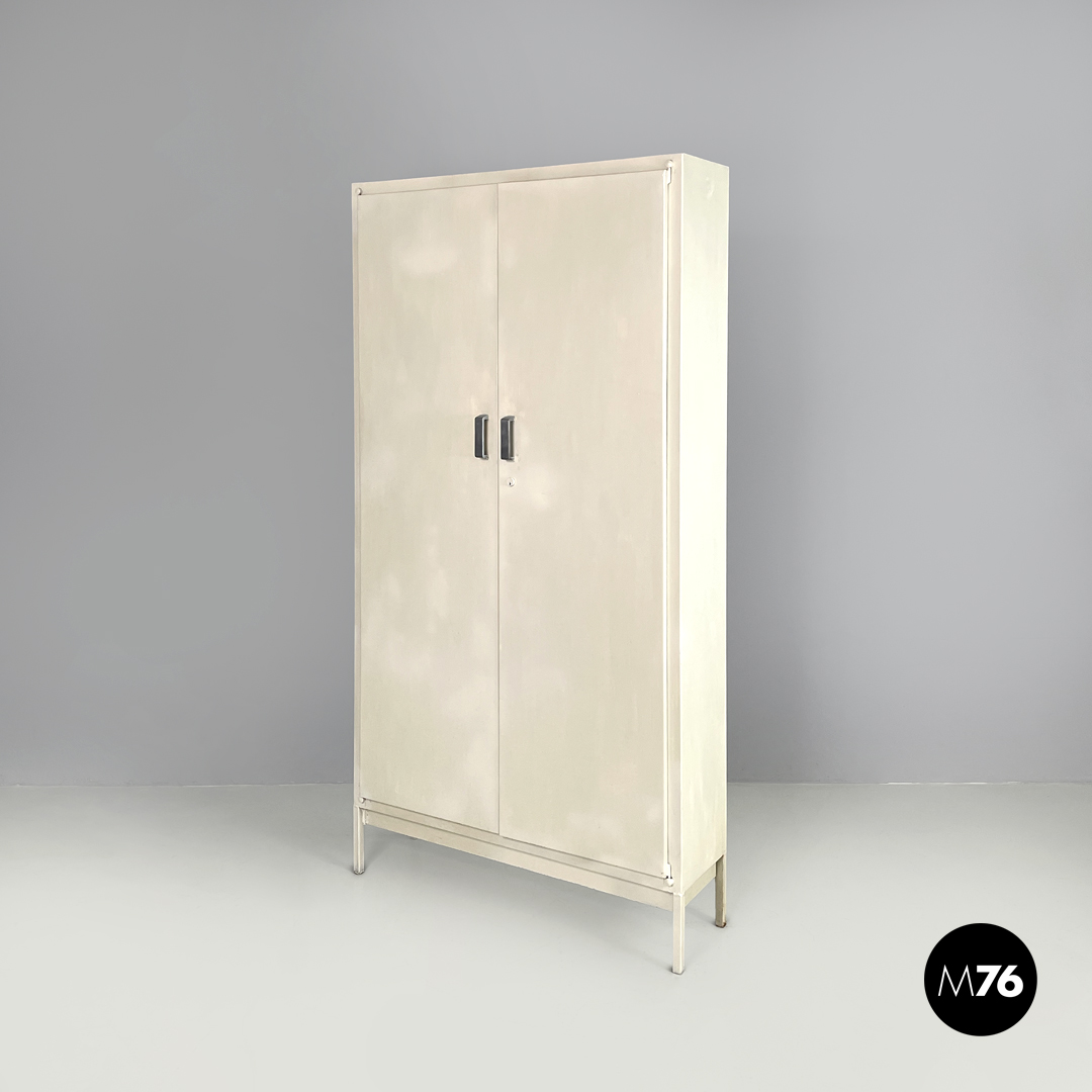 Armadio industriale in metallo verniciato bianco. Presenta due ante con maniglie in metallo, all’interno si trovano cinque ante che possono essere disposte a piacimento grazie a dei tasselli in metallo che si incastrano nei binari posti sullo “schienale” interno dell’armadio. Sul retro sono presenti diversi fori a forma di asterisco. Utilizzabile in un bagno o in uno spogliatoio.