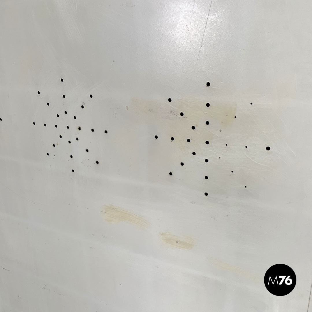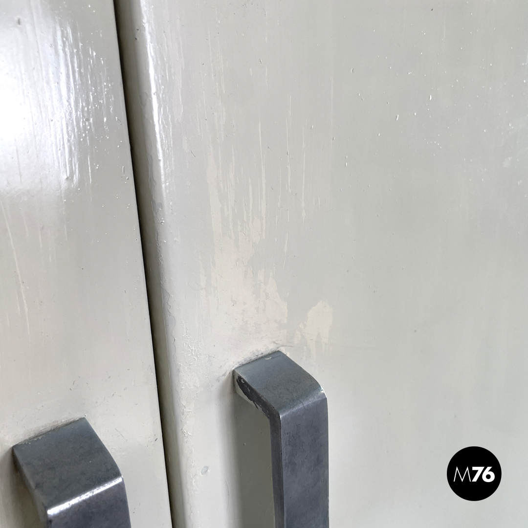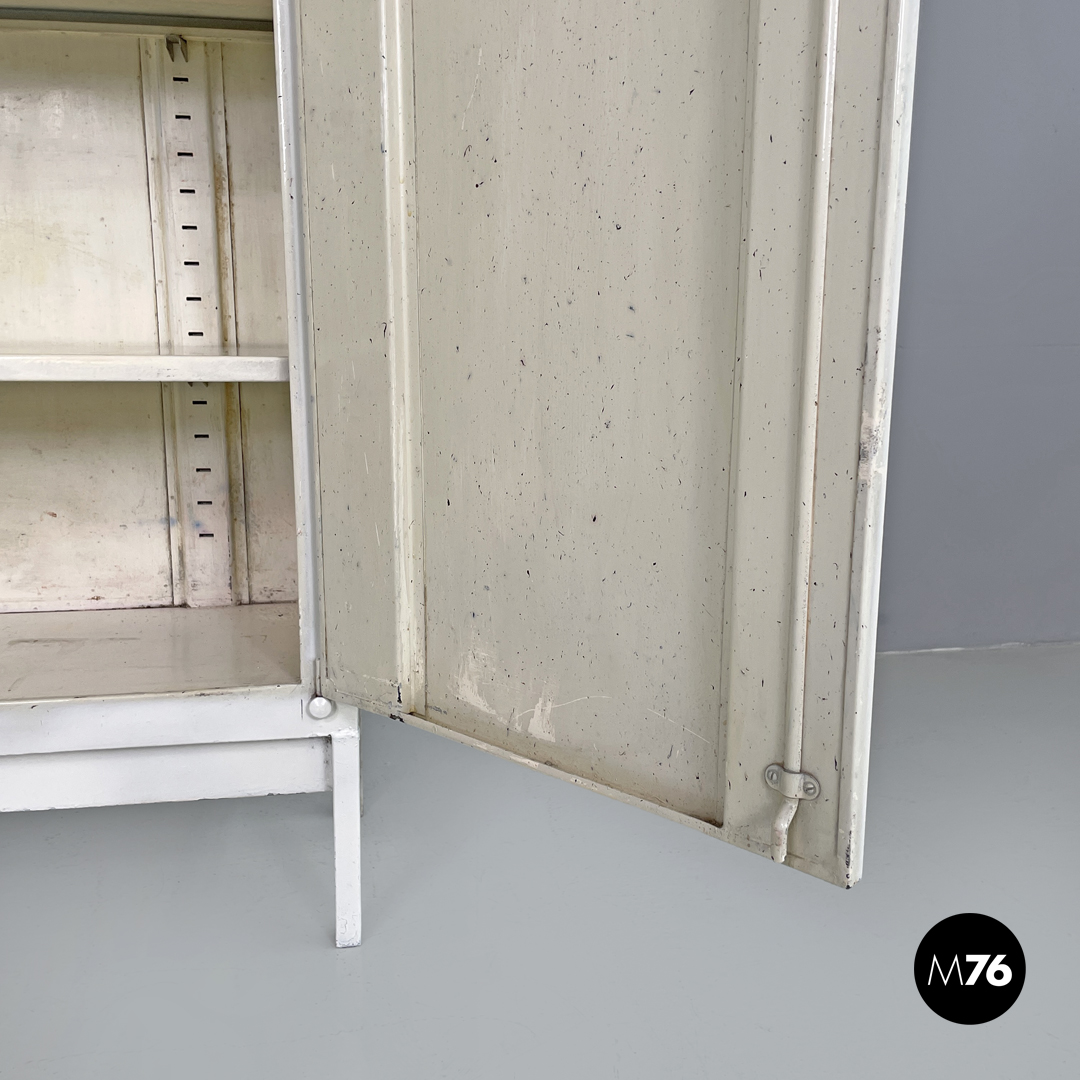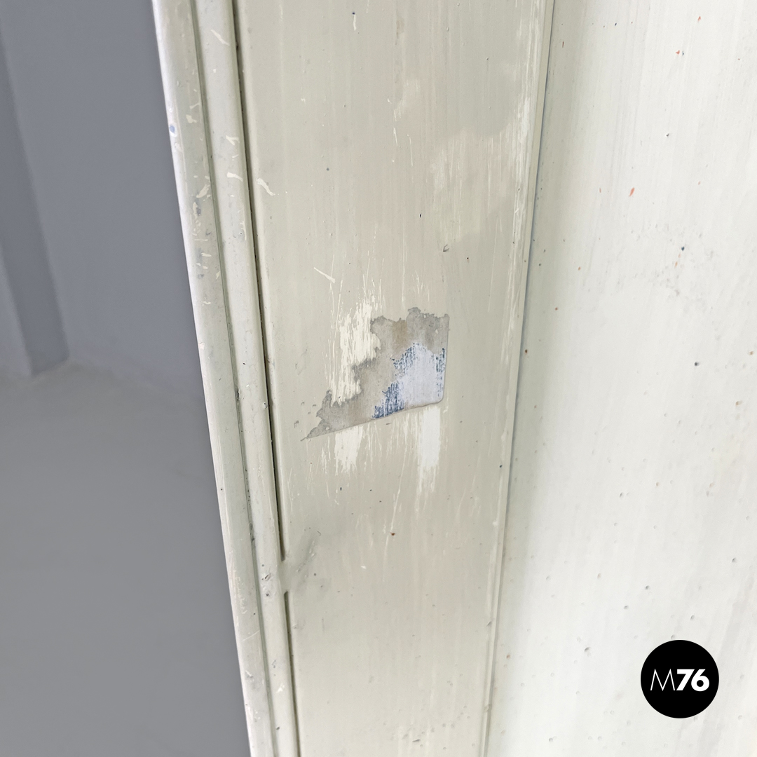 Armadio industriale in metallo verniciato bianco. Presenta due ante con maniglie in metallo, all’interno si trovano cinque ante che possono essere disposte a piacimento grazie a dei tasselli in metallo che si incastrano nei binari posti sullo “schienale” interno dell’armadio. Sul retro sono presenti diversi fori a forma di asterisco. Utilizzabile in un bagno o in uno spogliatoio.