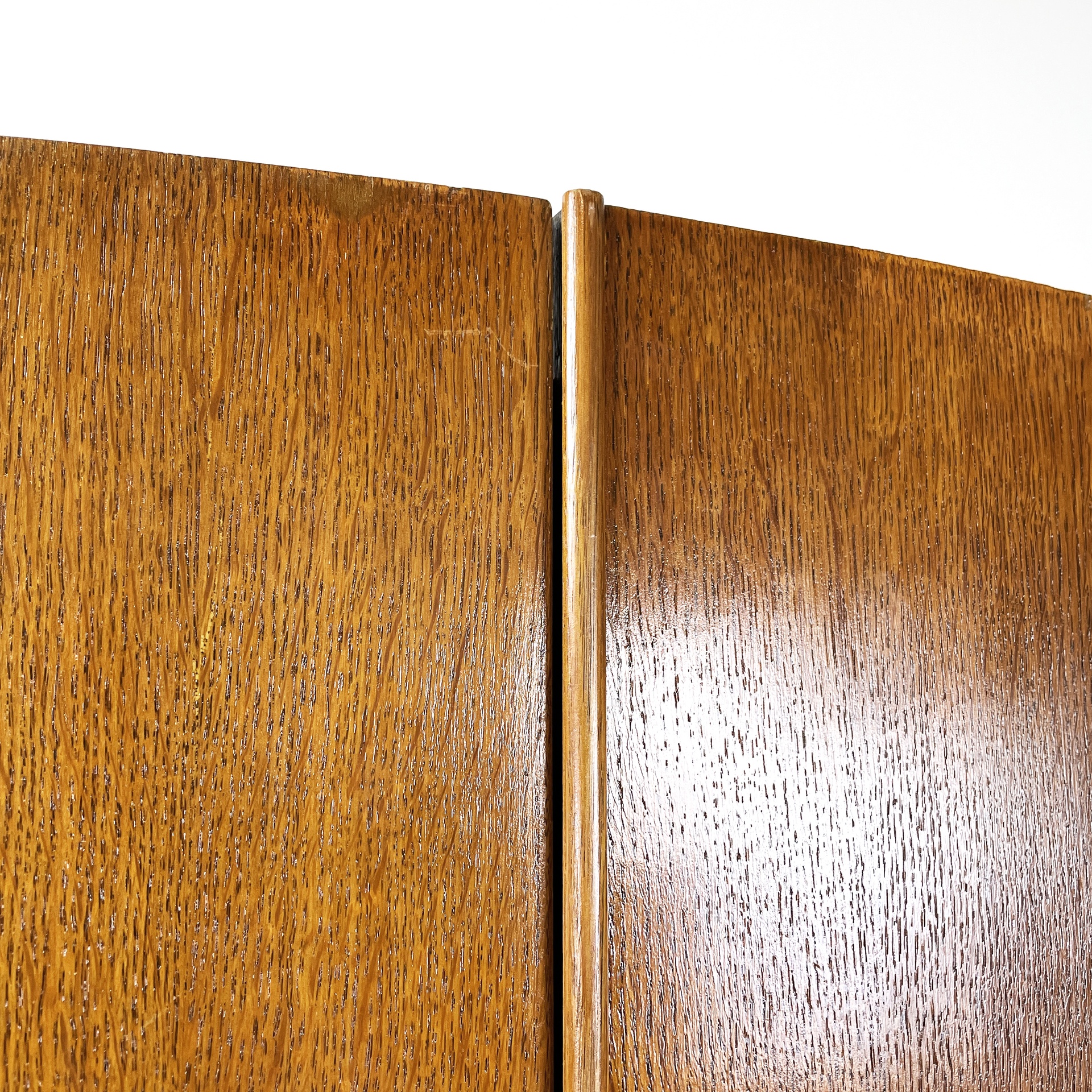 Armadio interamente in legno massello con doppia anta a battente. All’interno sono presenti due vani. Sulla sinistra è presente un appendiabiti estraibile in metallo con un asta in legno per le cravatte. Sulla destra sono presenti delle mensole, un cassetto, un piccolo portaoggetti per bottoni e uno vano con anta e specchio. Ogni elemento presenta etichetta specifica che definisce l’utilizzo della mensola. Art Deco.