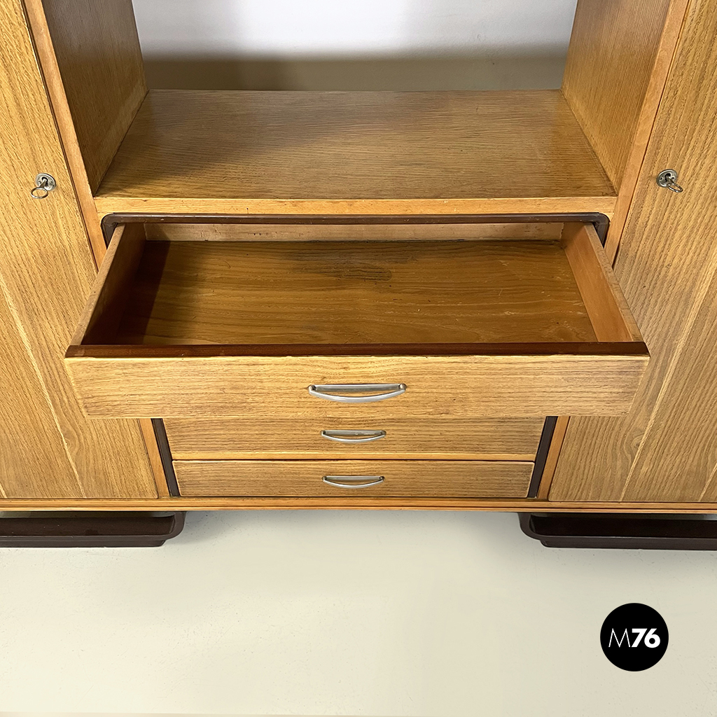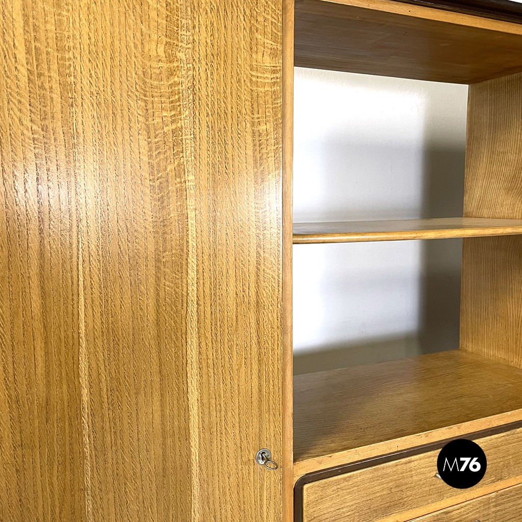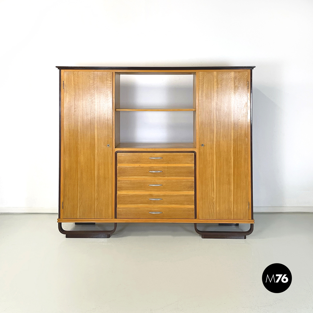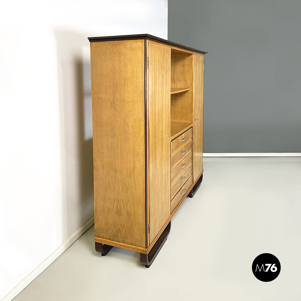 Armadio o mobile contenitore in legno chiaro e con dettagli in legno scuro. Ai lati sono presenti due ante a battente con serratura e chiave in metallo cromato e allu0027interno 3 mensole. Nella parte alta centrale è presente un vano aperto con una mensola centrale. Al di sotto di questo ci sono 5 cassetti rettangolari con maniglia in metallo cromato. Sugli spigoli sono presenti dei listelli in legno scuro. Le zampe sono ovali, in legno marrone scuro.