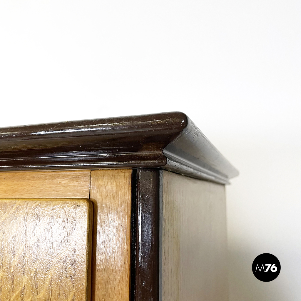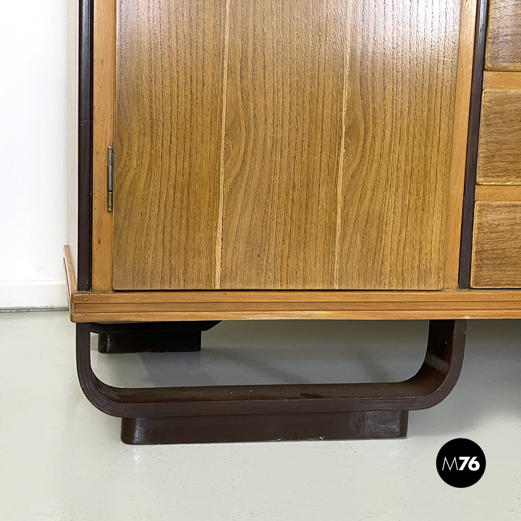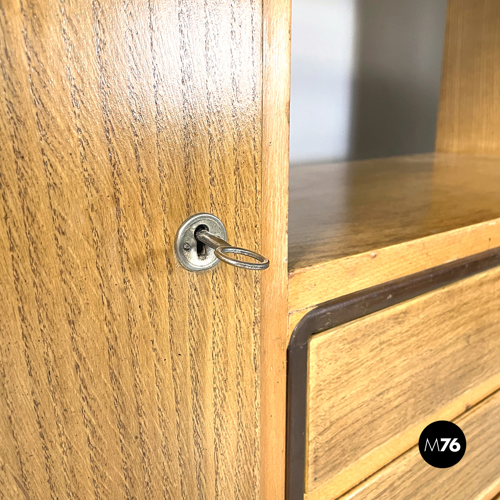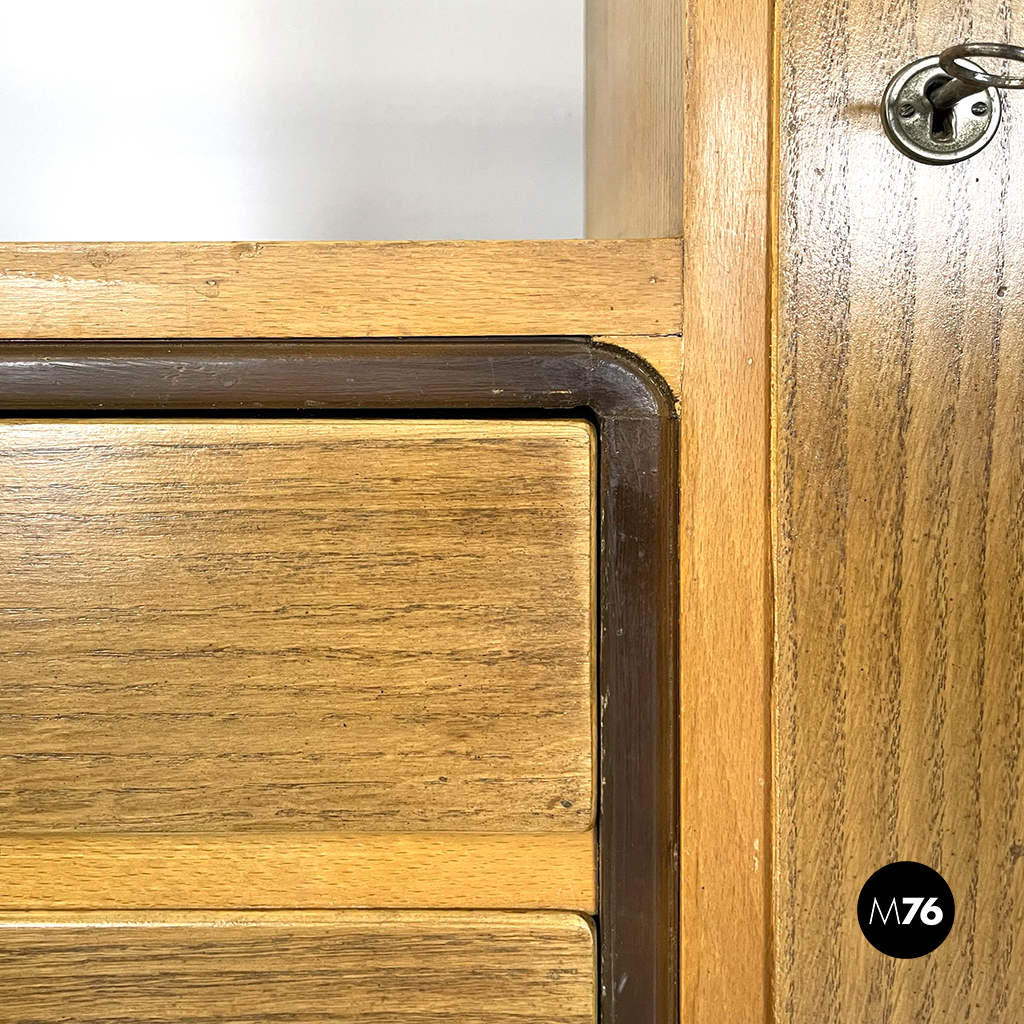 Armadio o mobile contenitore in legno chiaro e con dettagli in legno scuro. Ai lati sono presenti due ante a battente con serratura e chiave in metallo cromato e allu0027interno 3 mensole. Nella parte alta centrale è presente un vano aperto con una mensola centrale. Al di sotto di questo ci sono 5 cassetti rettangolari con maniglia in metallo cromato. Sugli spigoli sono presenti dei listelli in legno scuro. Le zampe sono ovali, in legno marrone scuro.