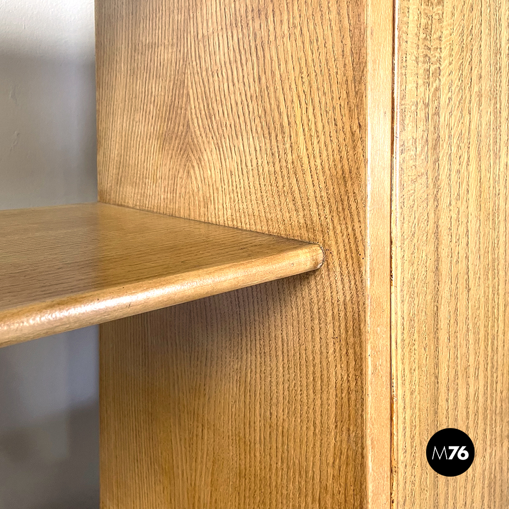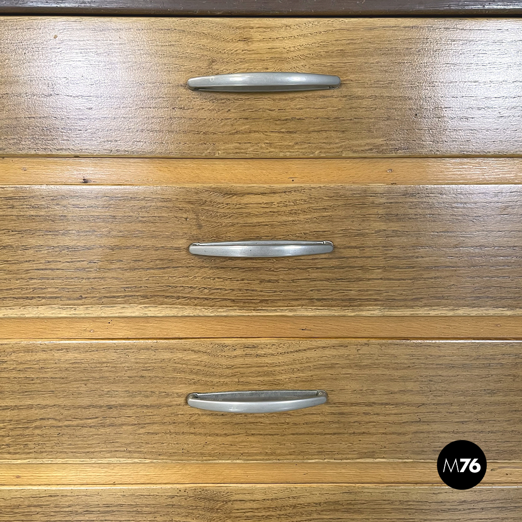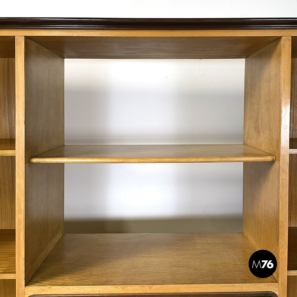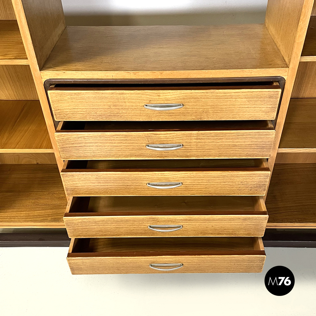 Armadio o mobile contenitore in legno chiaro e con dettagli in legno scuro. Ai lati sono presenti due ante a battente con serratura e chiave in metallo cromato e allu0027interno 3 mensole. Nella parte alta centrale è presente un vano aperto con una mensola centrale. Al di sotto di questo ci sono 5 cassetti rettangolari con maniglia in metallo cromato. Sugli spigoli sono presenti dei listelli in legno scuro. Le zampe sono ovali, in legno marrone scuro.