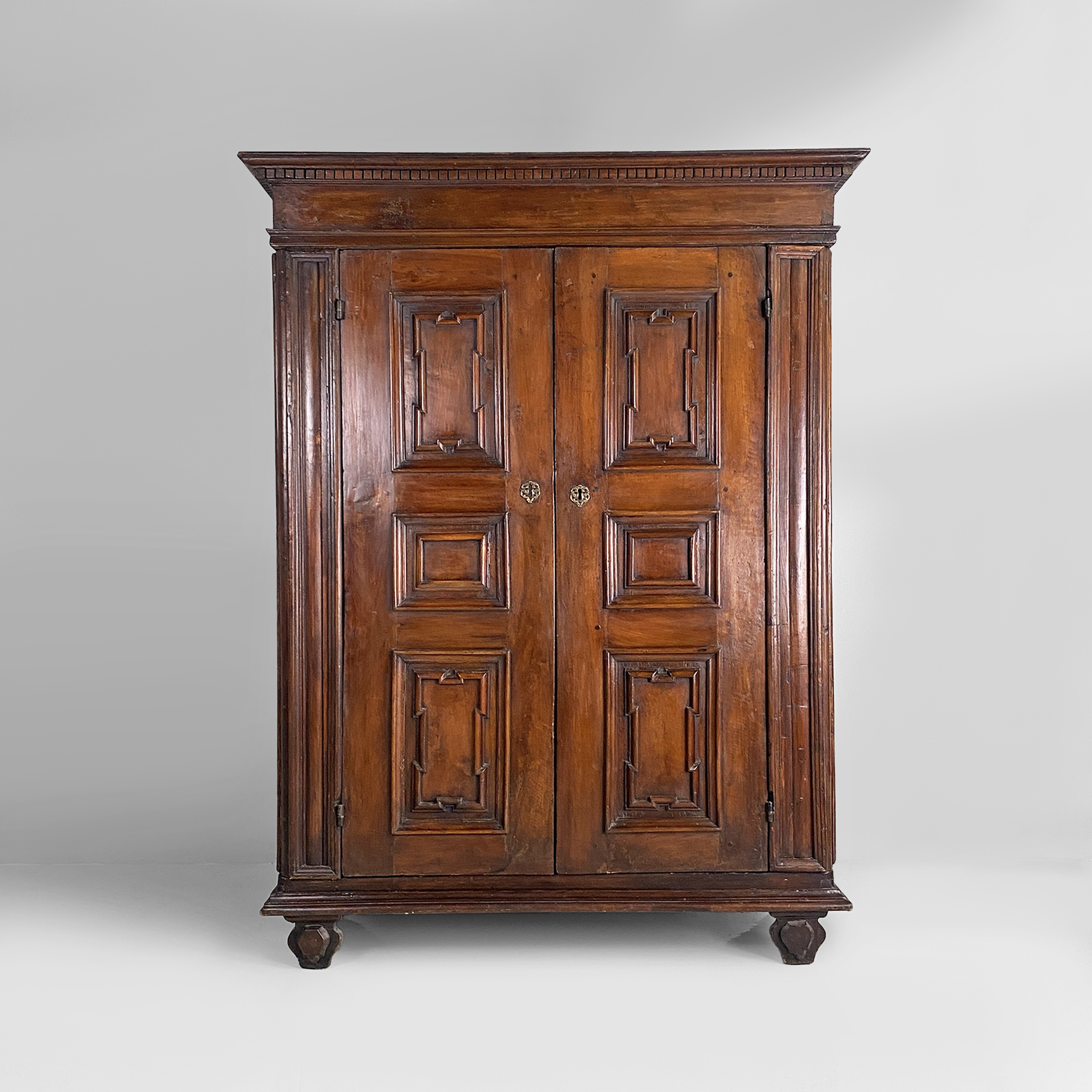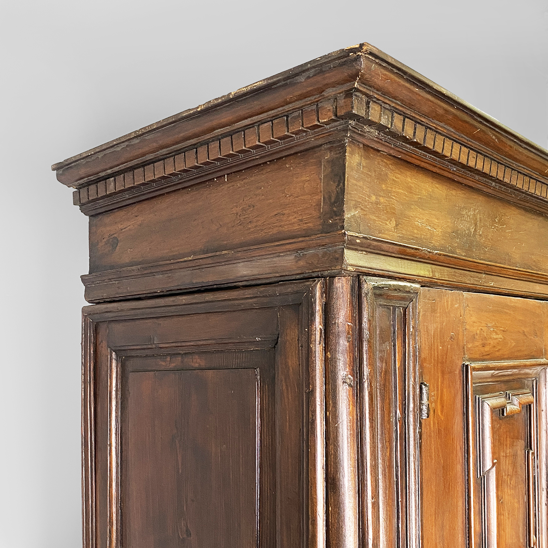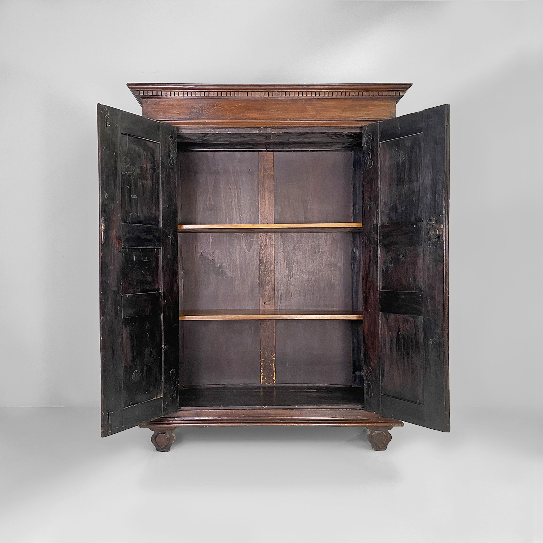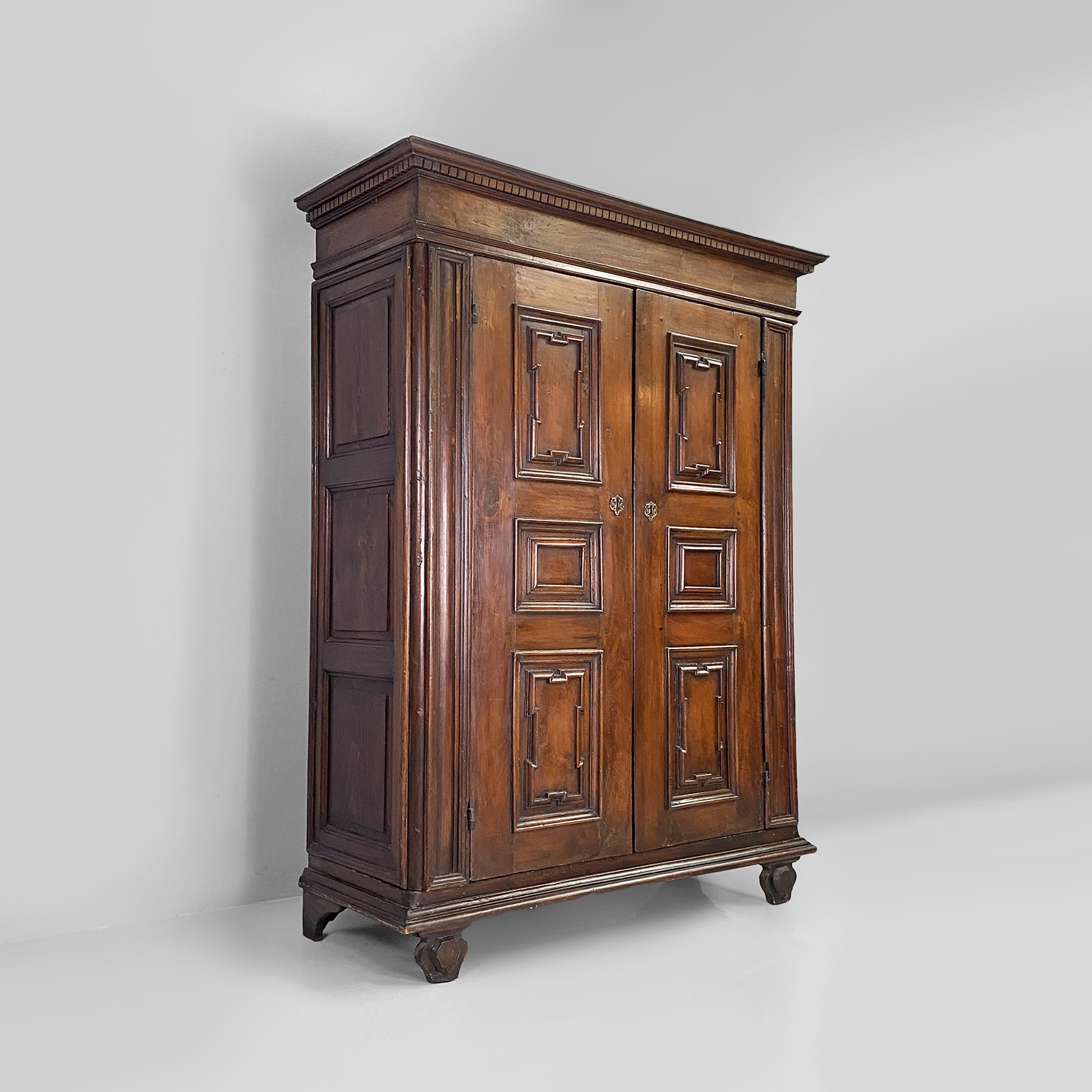 Armadio barocco in legno a due ante. Mobile contenitore con ante a battente e doppia mensola interna, con zampe anteriori con decoro e posteriori con forma irregolare sagomata. Su tutta la cornice del cappello è riportato un fregio con un motivo ripetuto, mentre presenta ante e fianchi a cassettone sempre decorate con fregi. Schiena del mobile non finita. Serrature in ferro e ottone, non utilizzabili per chiave mancante.
