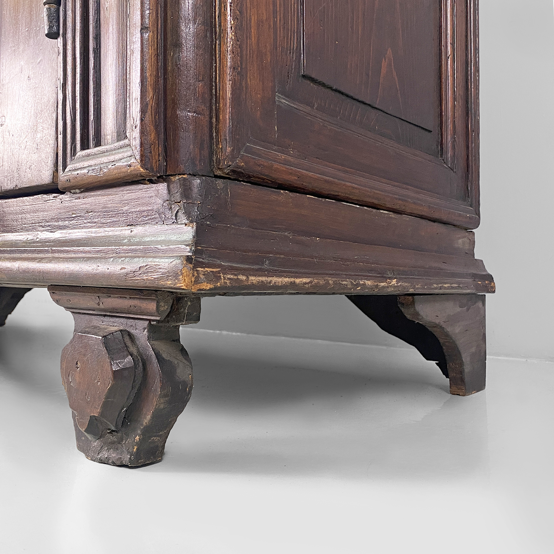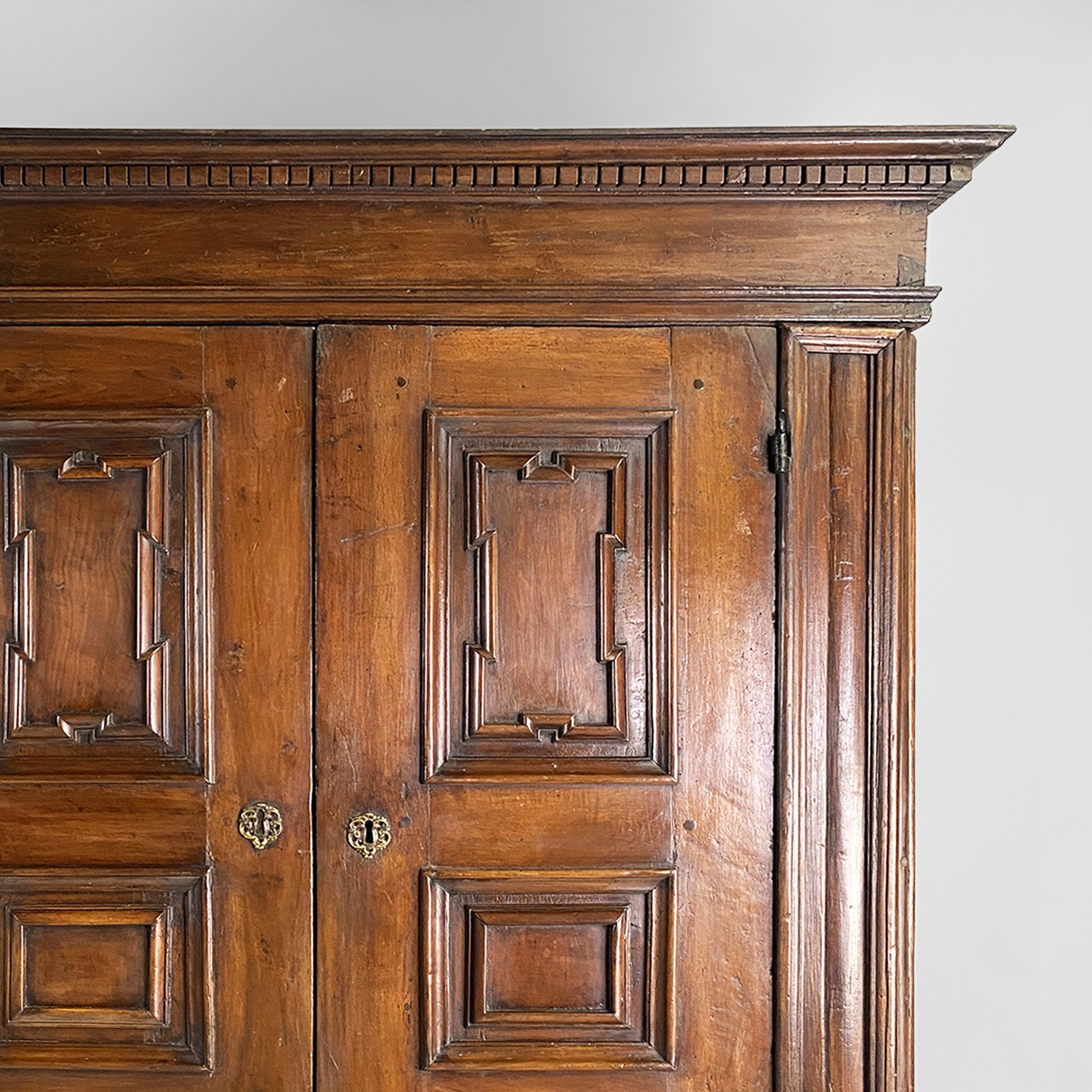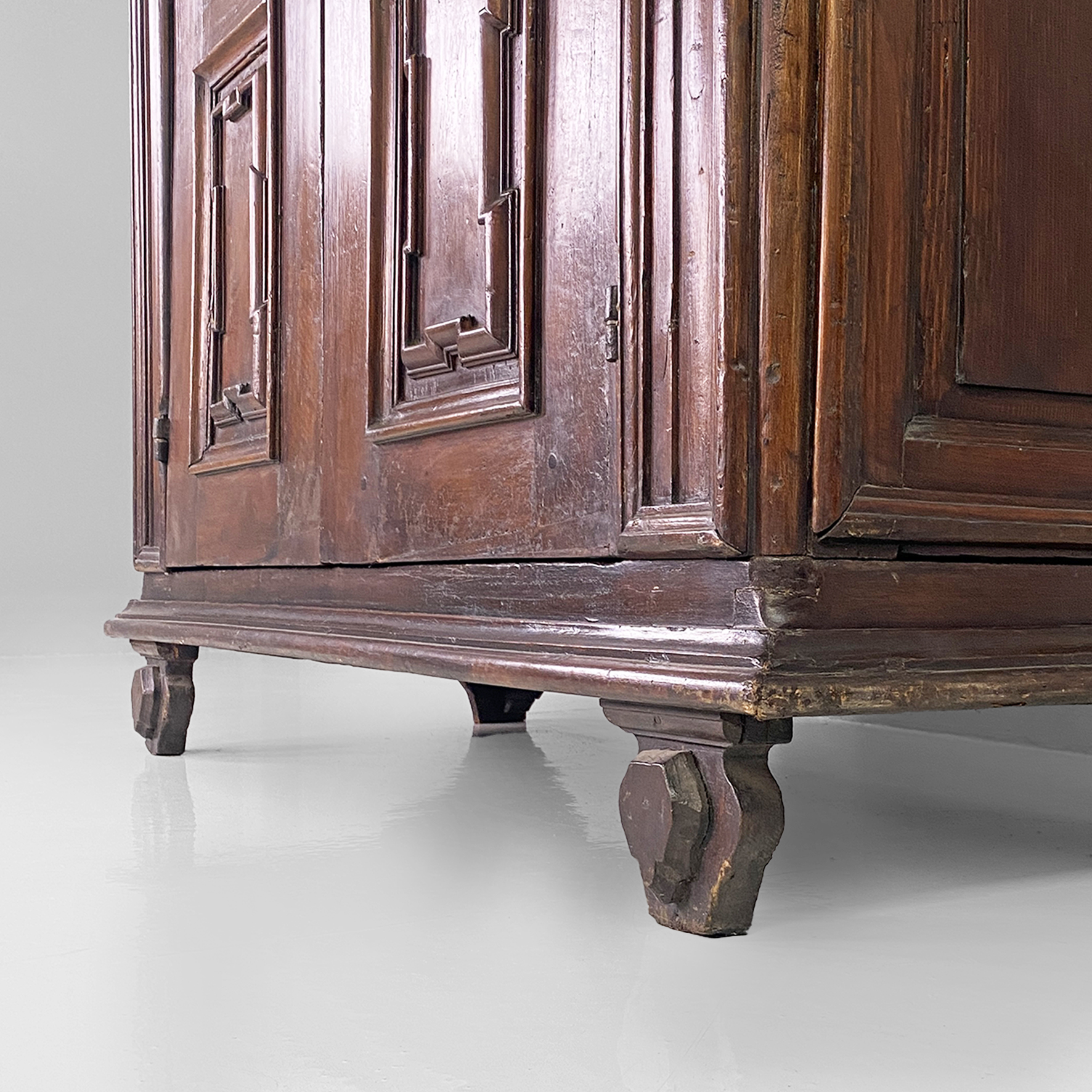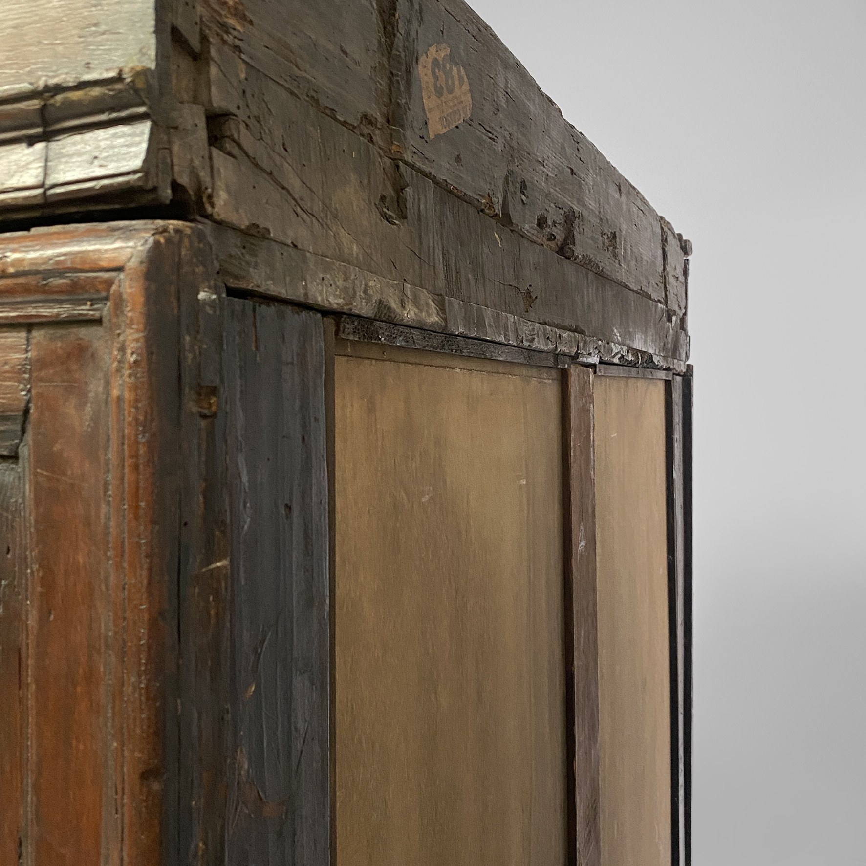 Armadio barocco in legno a due ante. Mobile contenitore con ante a battente e doppia mensola interna, con zampe anteriori con decoro e posteriori con forma irregolare sagomata. Su tutta la cornice del cappello è riportato un fregio con un motivo ripetuto, mentre presenta ante e fianchi a cassettone sempre decorate con fregi. Schiena del mobile non finita. Serrature in ferro e ottone, non utilizzabili per chiave mancante.