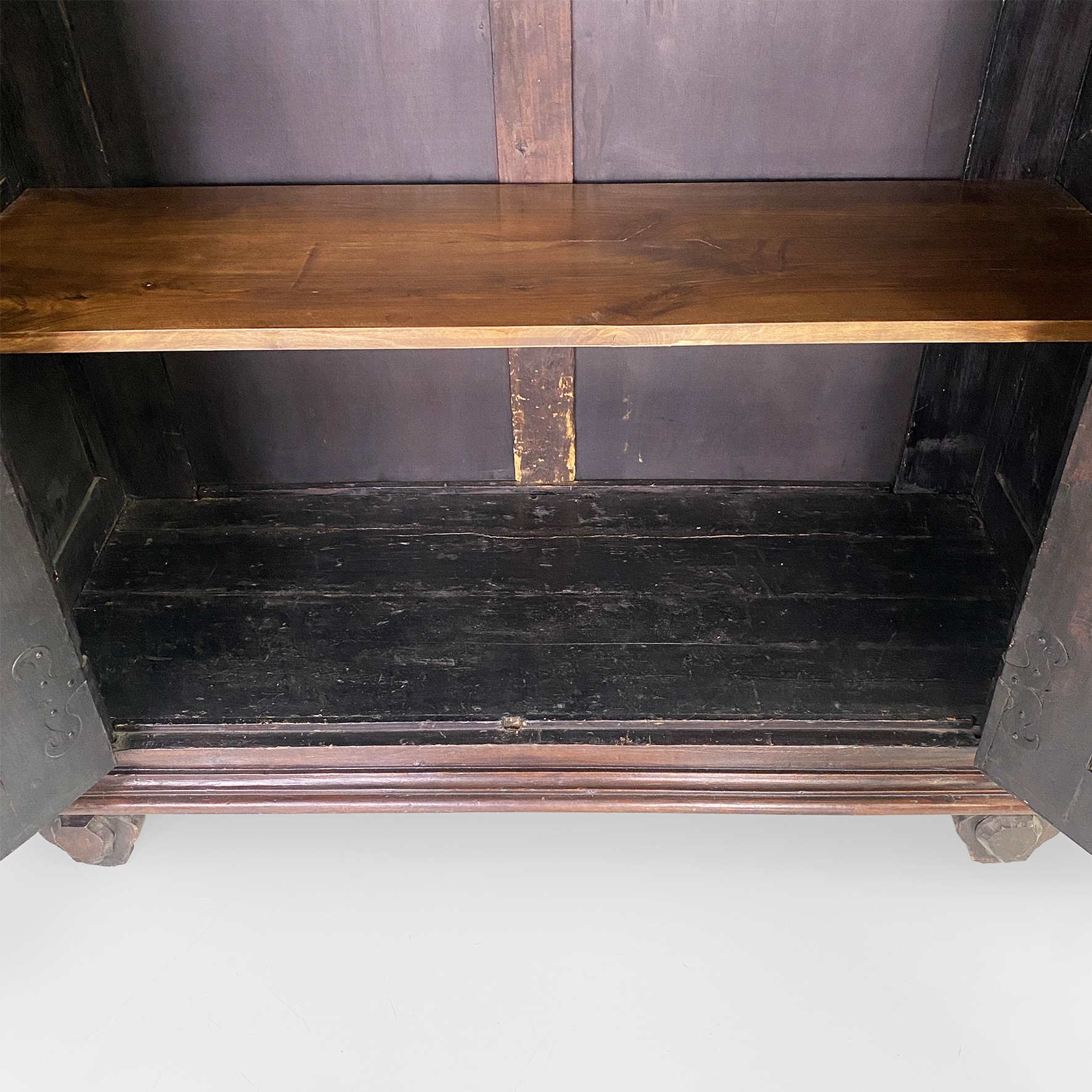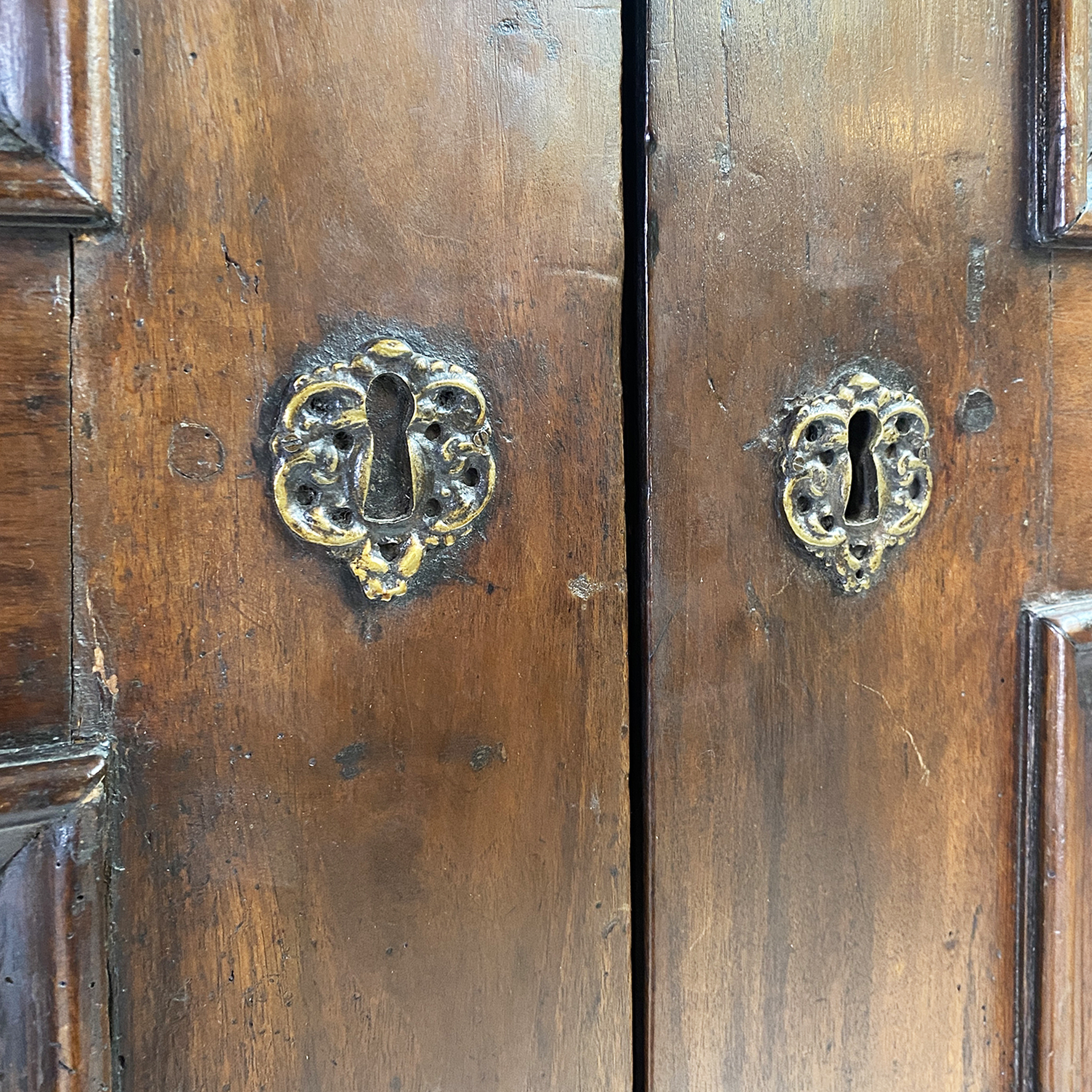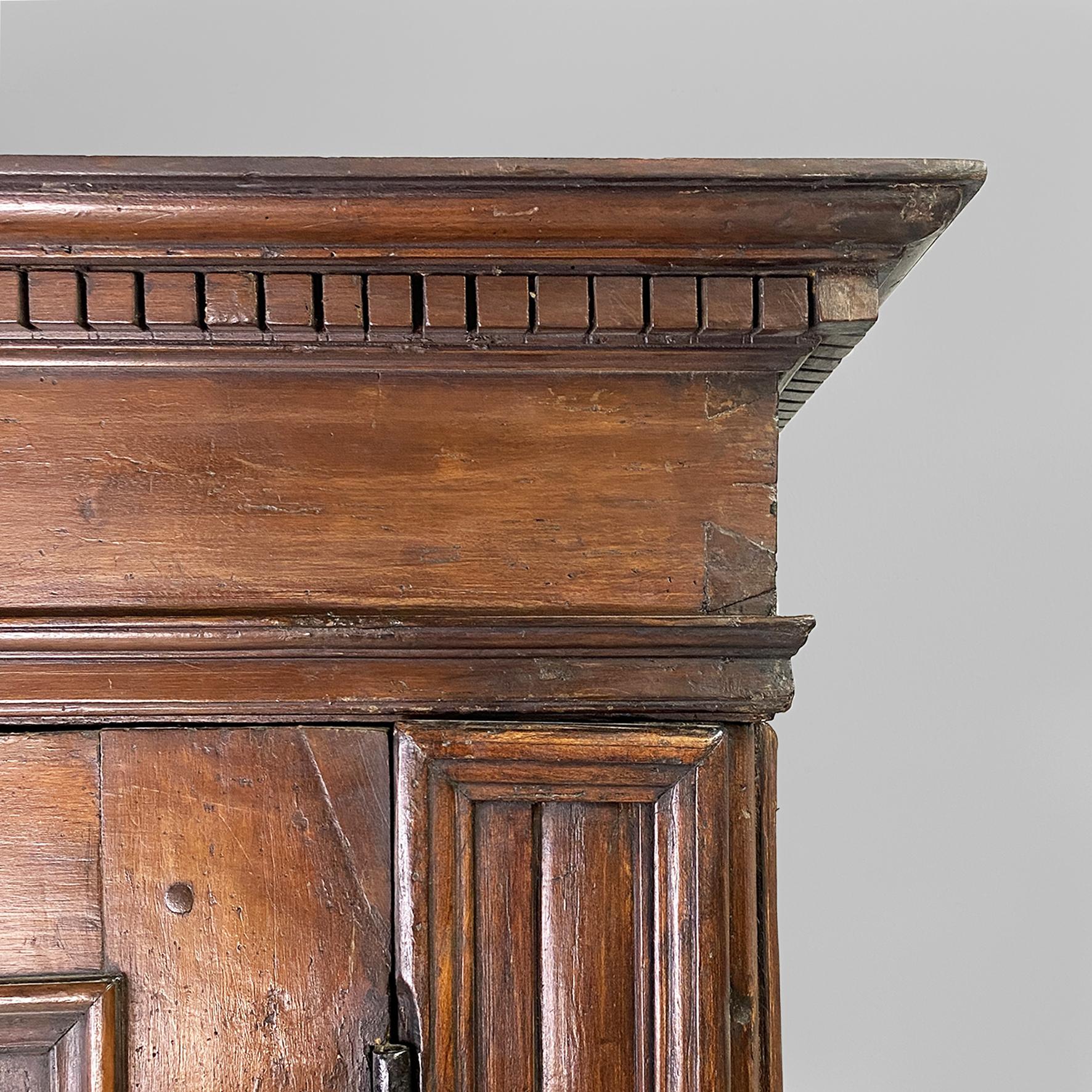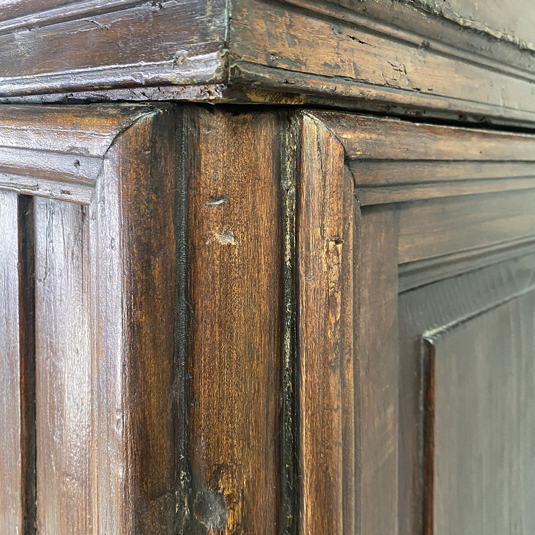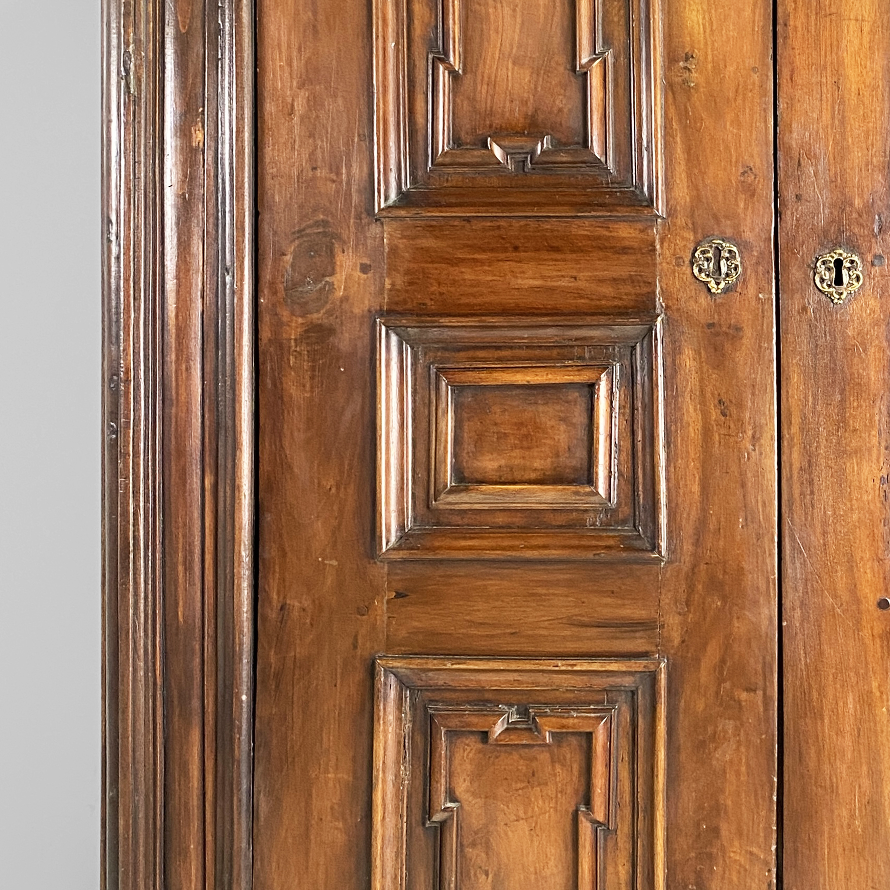 Armadio barocco in legno a due ante. Mobile contenitore con ante a battente e doppia mensola interna, con zampe anteriori con decoro e posteriori con forma irregolare sagomata. Su tutta la cornice del cappello è riportato un fregio con un motivo ripetuto, mentre presenta ante e fianchi a cassettone sempre decorate con fregi. Schiena del mobile non finita. Serrature in ferro e ottone, non utilizzabili per chiave mancante.
