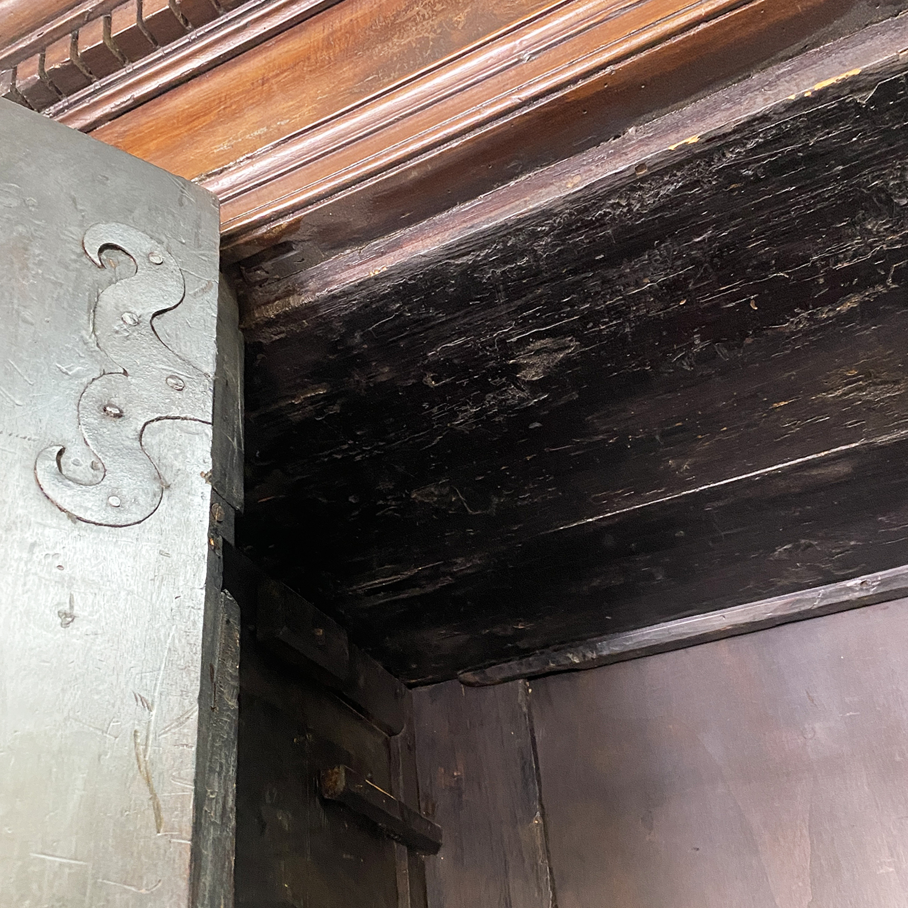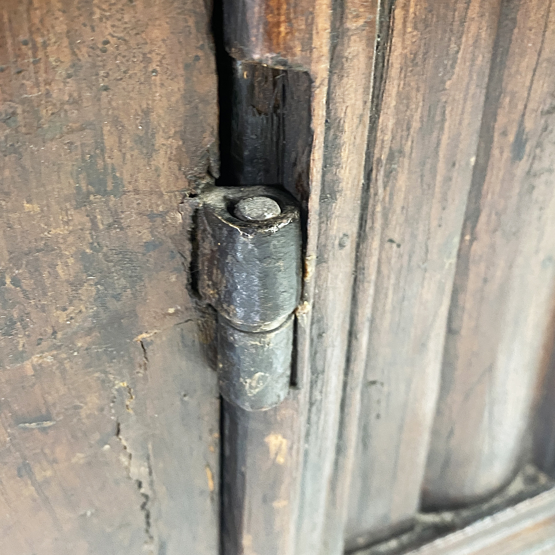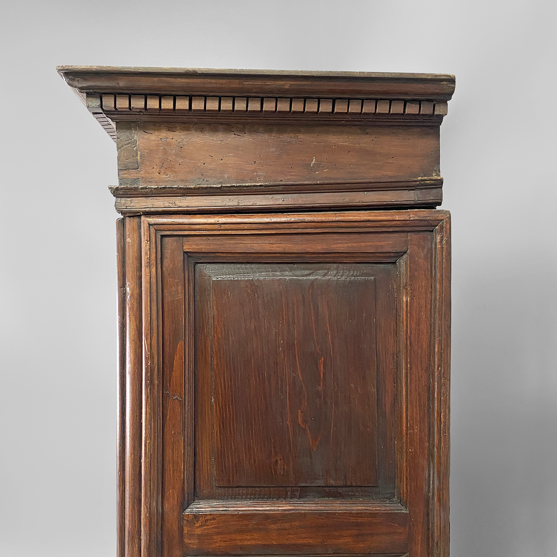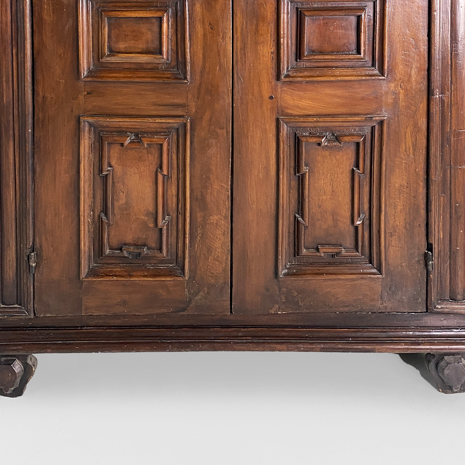 Armadio barocco in legno a due ante. Mobile contenitore con ante a battente e doppia mensola interna, con zampe anteriori con decoro e posteriori con forma irregolare sagomata. Su tutta la cornice del cappello è riportato un fregio con un motivo ripetuto, mentre presenta ante e fianchi a cassettone sempre decorate con fregi. Schiena del mobile non finita. Serrature in ferro e ottone, non utilizzabili per chiave mancante.