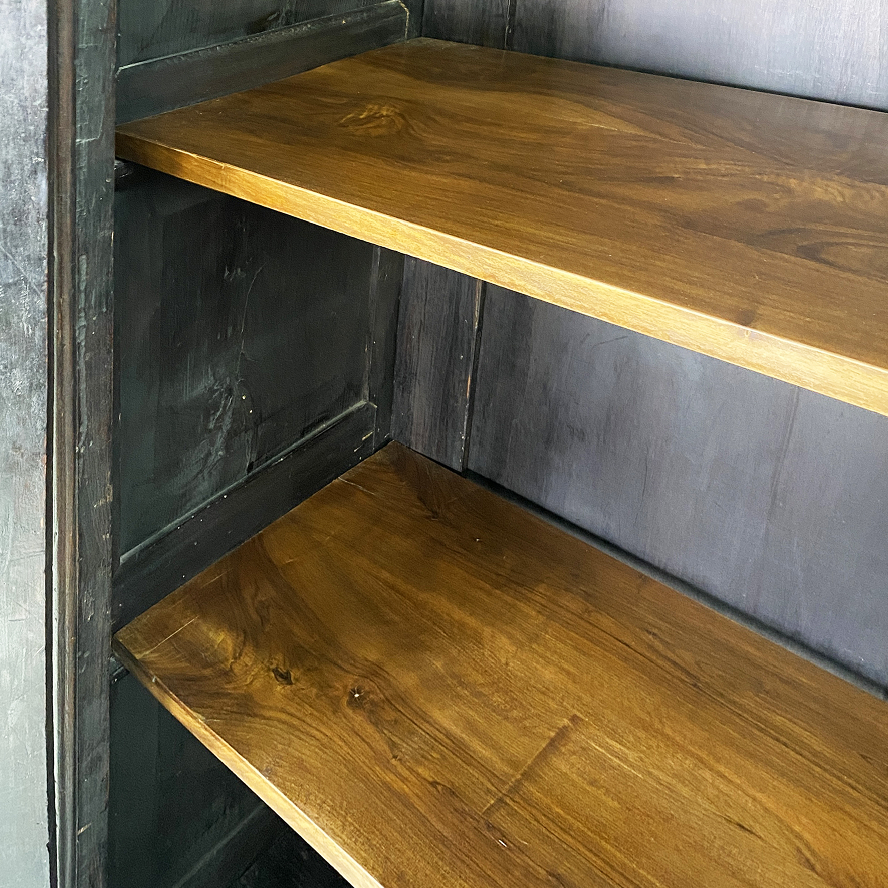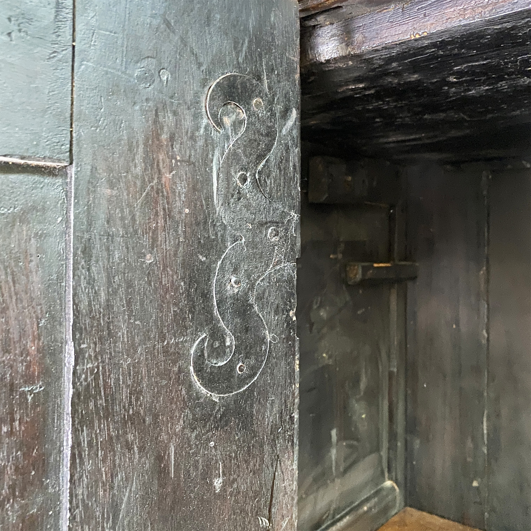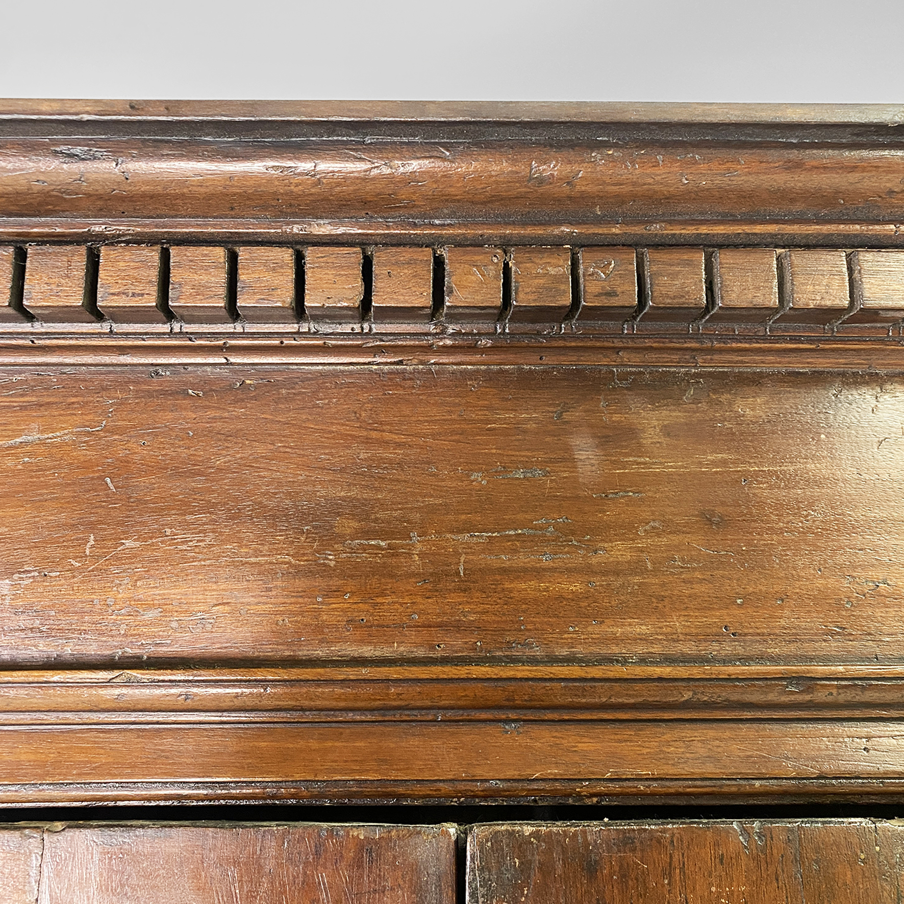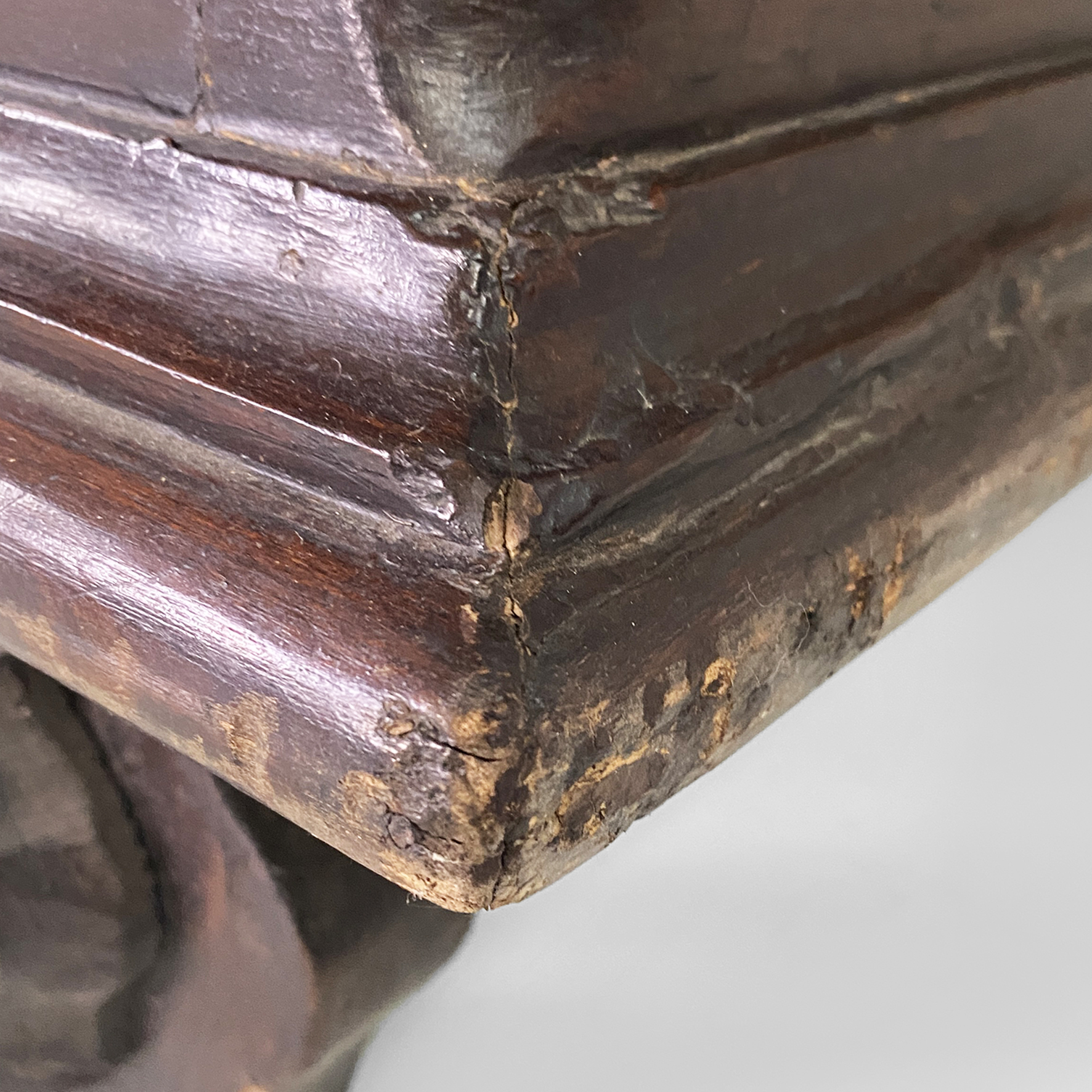 Armadio barocco in legno a due ante. Mobile contenitore con ante a battente e doppia mensola interna, con zampe anteriori con decoro e posteriori con forma irregolare sagomata. Su tutta la cornice del cappello è riportato un fregio con un motivo ripetuto, mentre presenta ante e fianchi a cassettone sempre decorate con fregi. Schiena del mobile non finita. Serrature in ferro e ottone, non utilizzabili per chiave mancante.