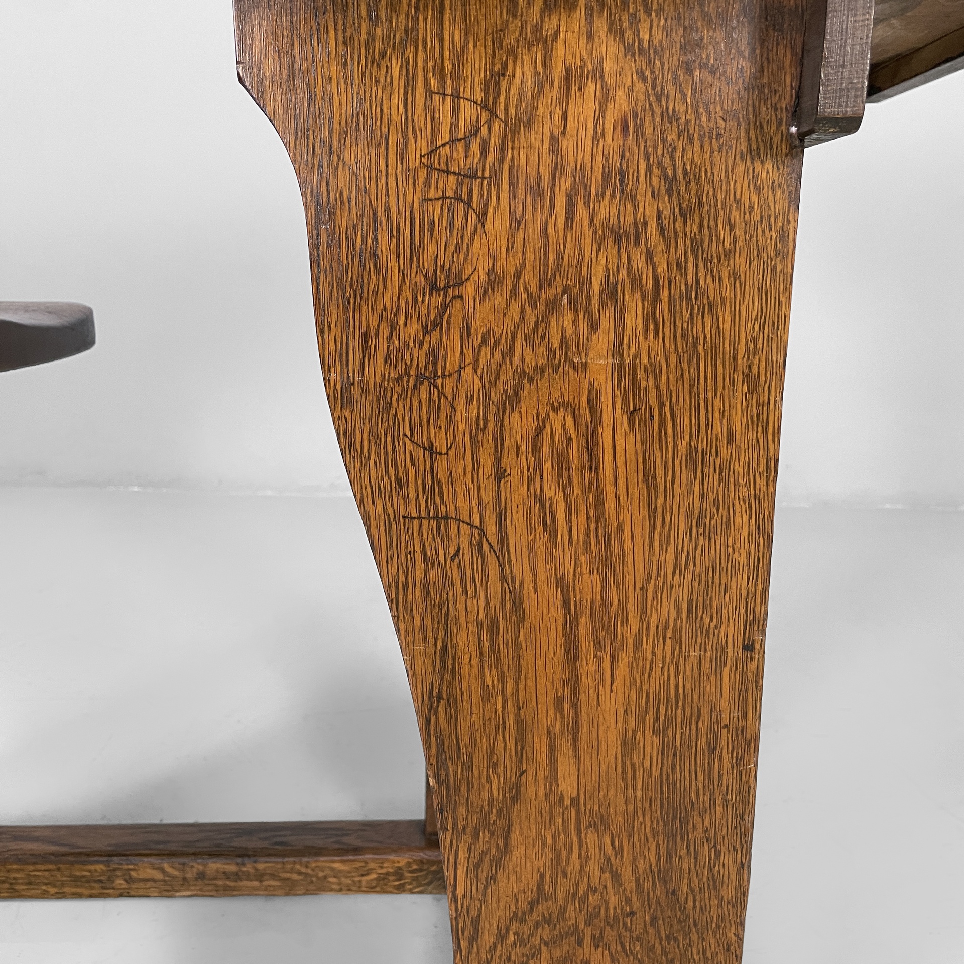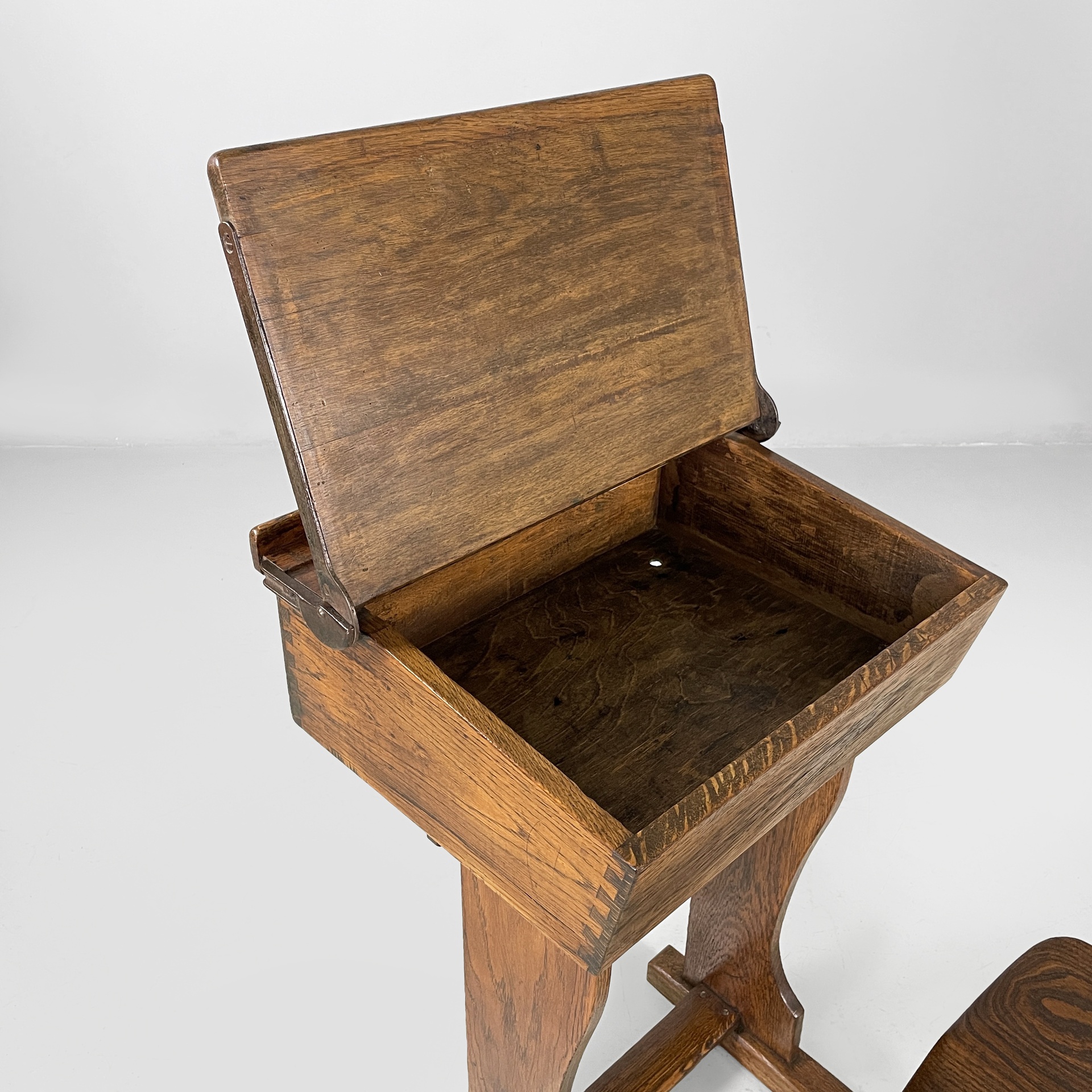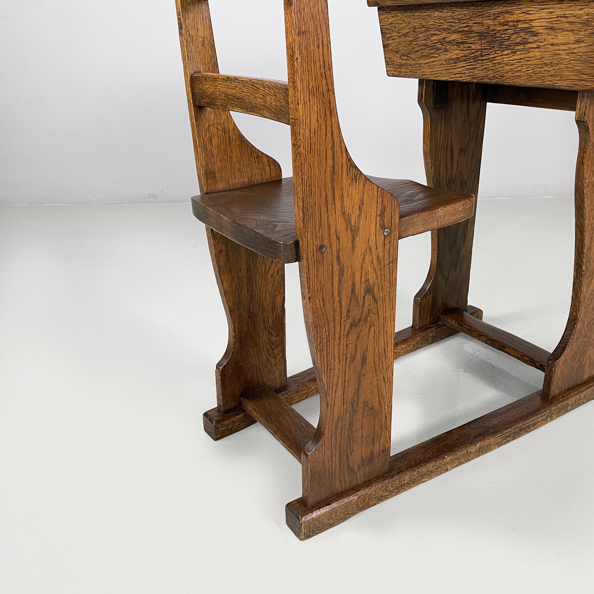 Banco di scuola composto da un tavolo e una sedia, interamente in legno. Il banco presenta un piccolo calamaio estraibile in ceramica bianca, un piano inclinato per poter appoggiare il quaderno e un vano interno. Il tavolo presenta un sistema a scorrimento per poter permettere di sedersi. La sedia presenta uno schienale a listelli e una seduta sagomata. Sedia e banco sono collegati alla base.