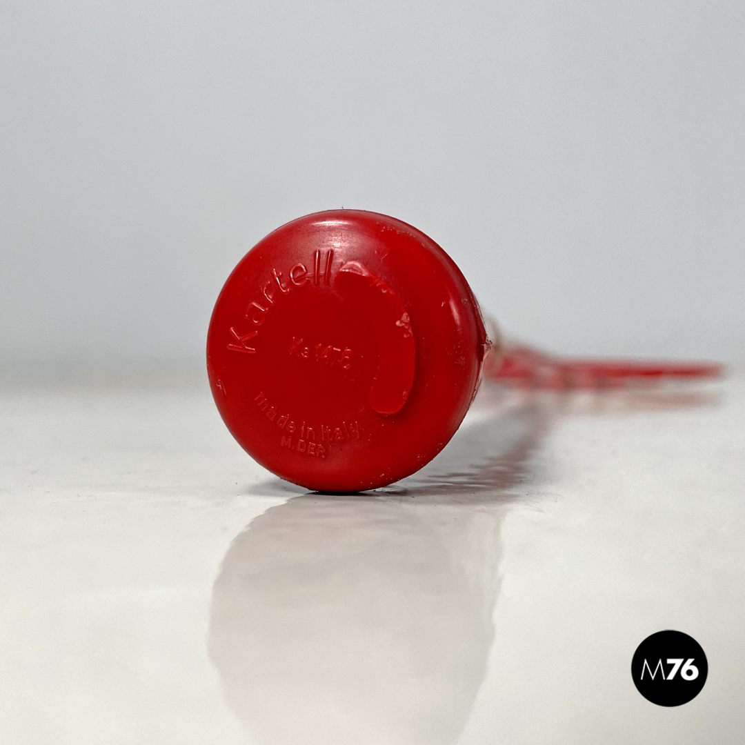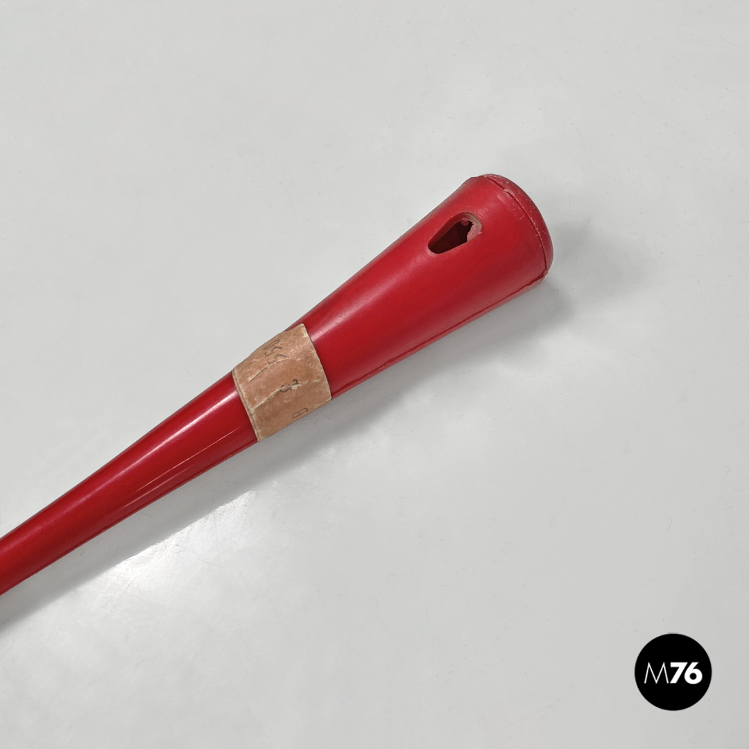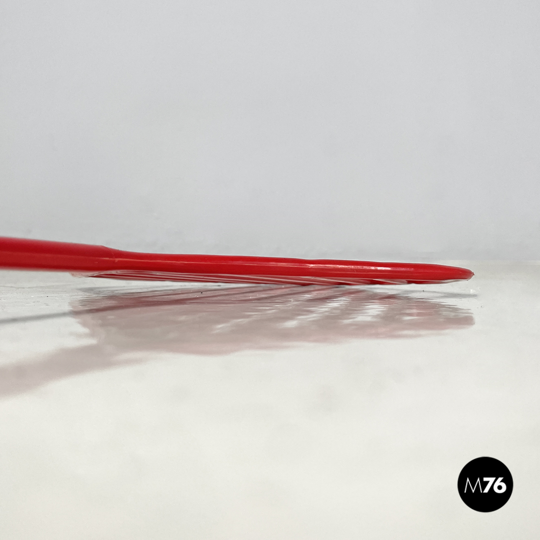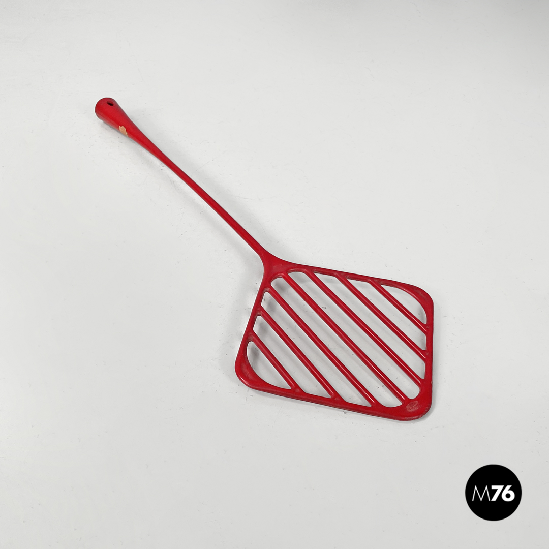 Battipanni model 1476 in plastica rossa. La struttura è interamente a sezione tonda, la parte alta è di forma romboidale con sette listelli verticali. Lo stelo si allunga e si allarga verso il fondo della struttura.