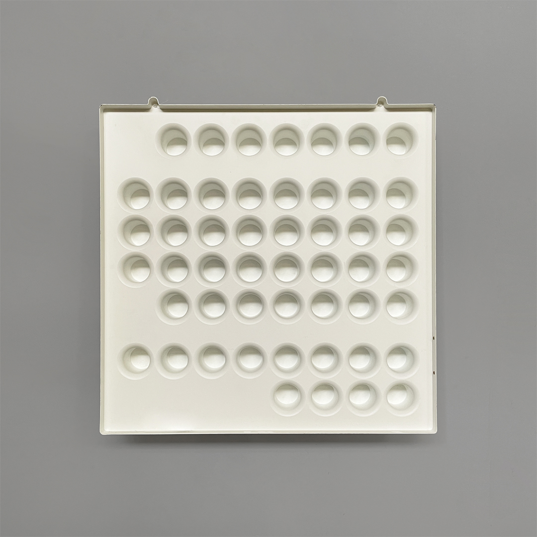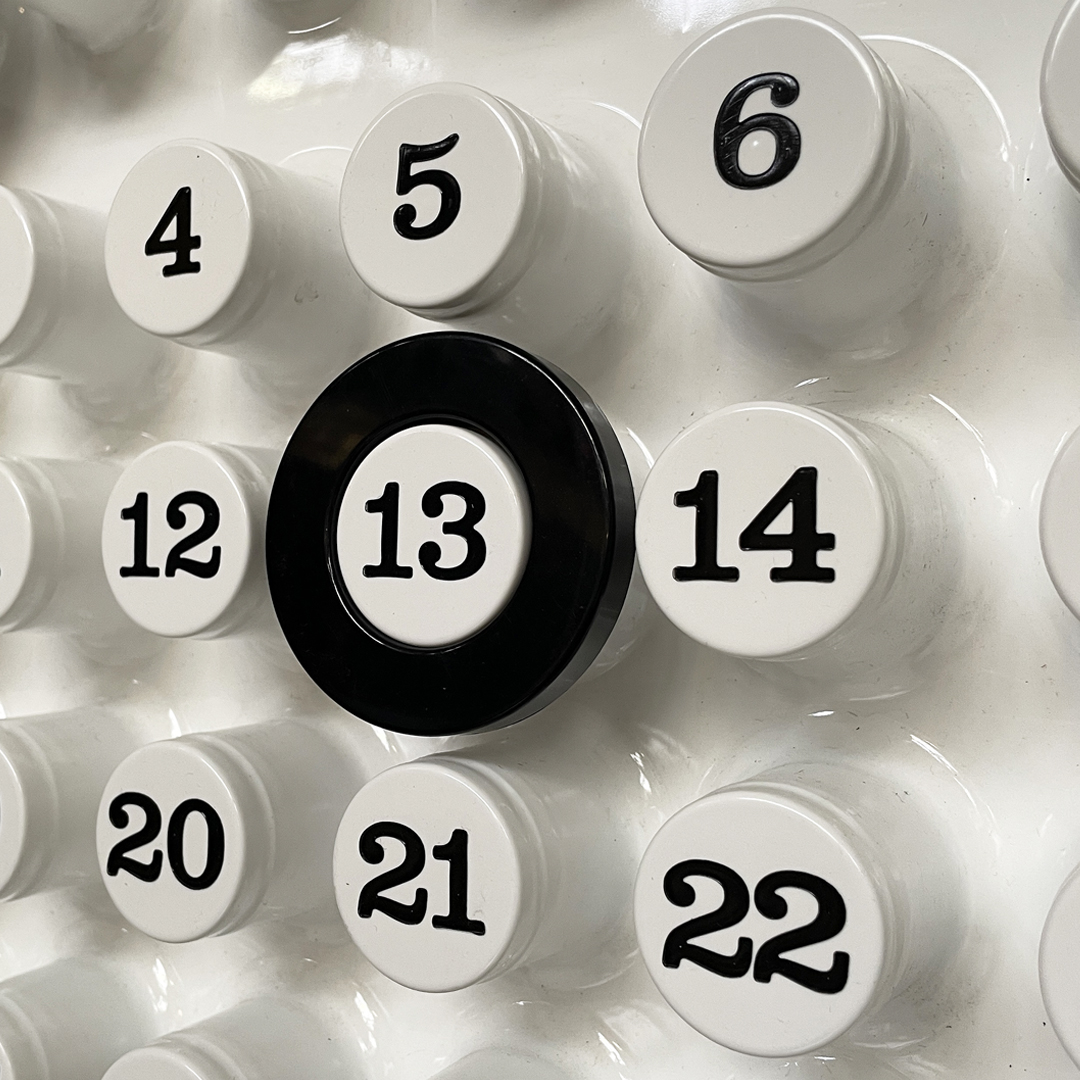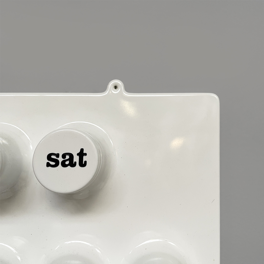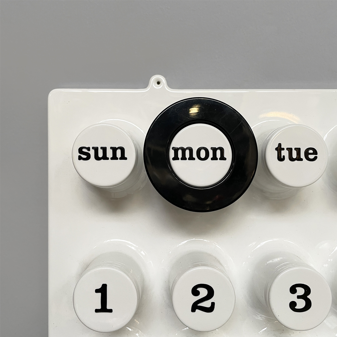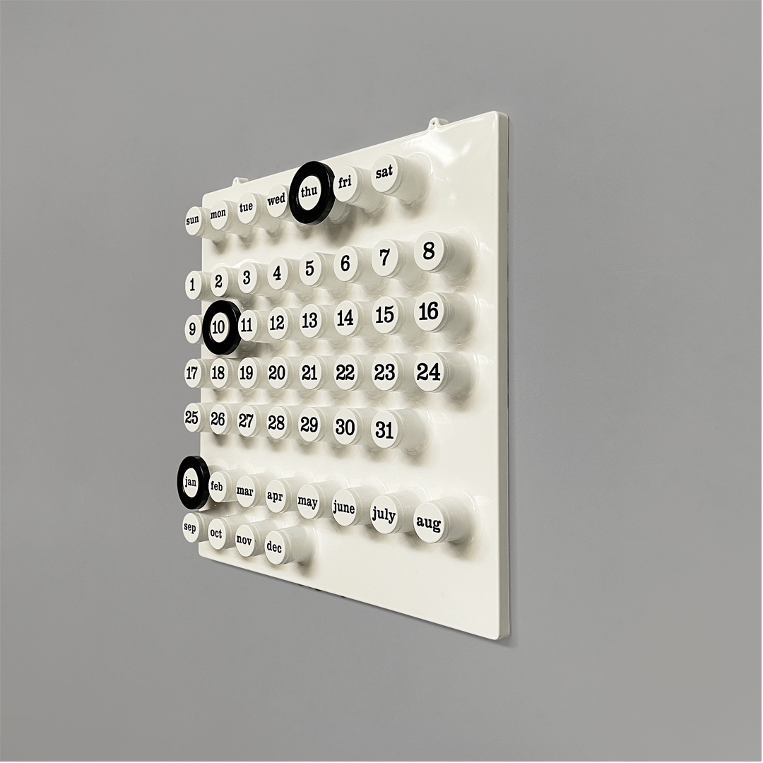 Calendario infinito da parete in plastica colore bianco. Il calendario presenta diversi cilindri sporgenti: questi corrispondono nella parte alta ai giorni dalla settimana, nella parte centrale ai numeri e nella parte inferiore ai mesi. Per segnare i giorni e i mesi è possibile grazie ad un anello in plastica nero. L’anello può essere richiesto in altri colori.