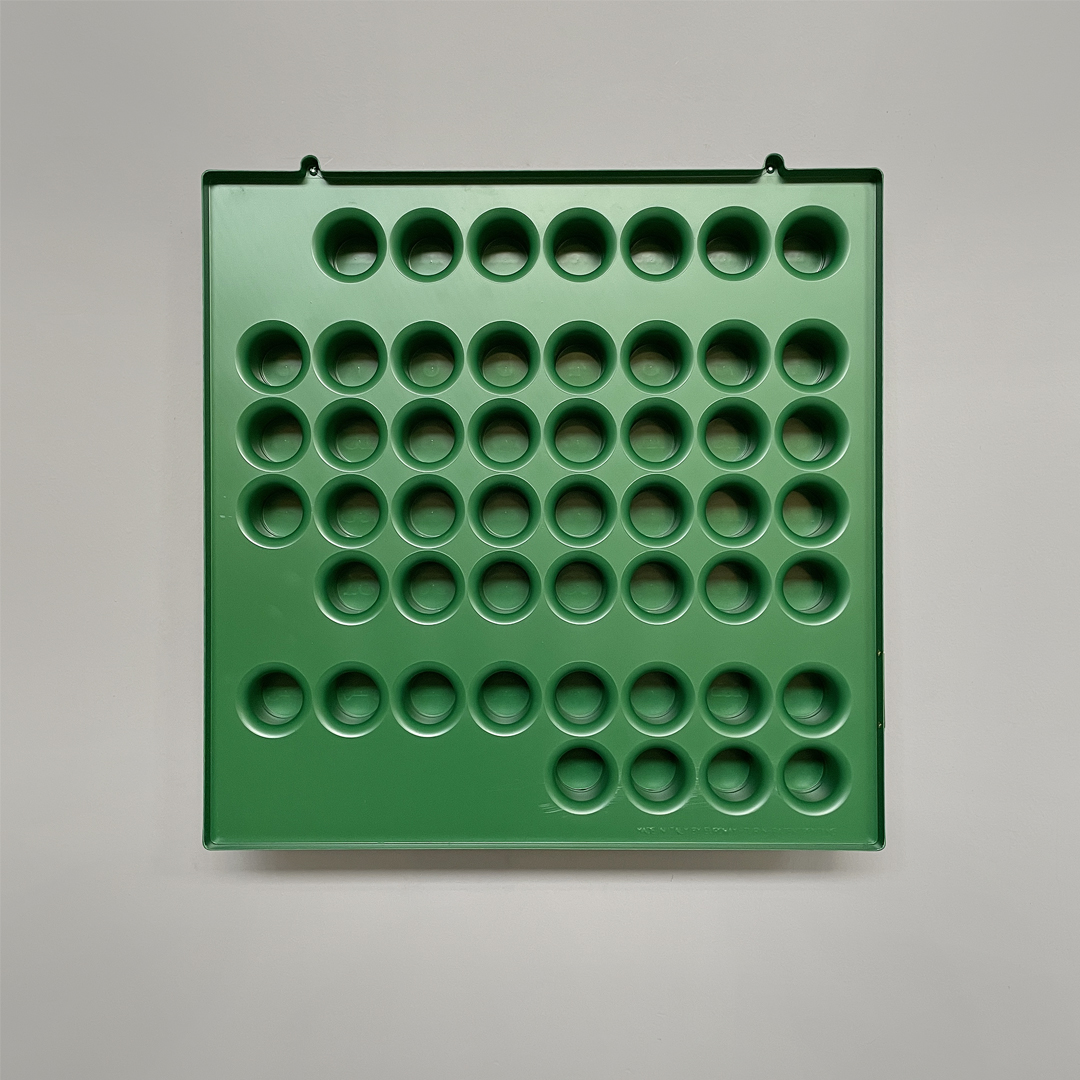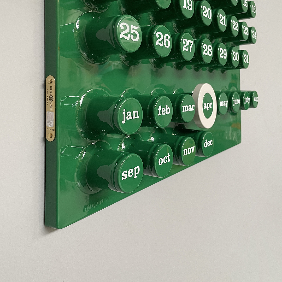 Calendario infinito da parete in plastica verde. Il calendario presenta diversi cilindri sporgenti: questi corrispondono nella parte alta ai giorni dalla settimana, nella parte centrale ai numeri e nella parte inferiore ai mesi. Per segnare i giorni e i mesi è possibile grazie ad un anello in plastica bianco. L’anello può essere richiesto in altri colori.