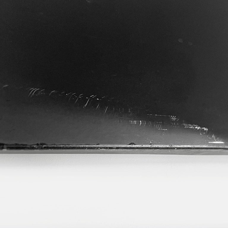 Calendario perpetuo, modello Meridiana, realizzato con una lamiera in ferro nero, ripiegata nella parte alta e bassa a finire l’oggetto. Con numeri indicanti i giorni e i mesi posizionati a semicerchio nella parte destra del pannello, mentre a sinistra si trova una lancetta magnetica rossa.