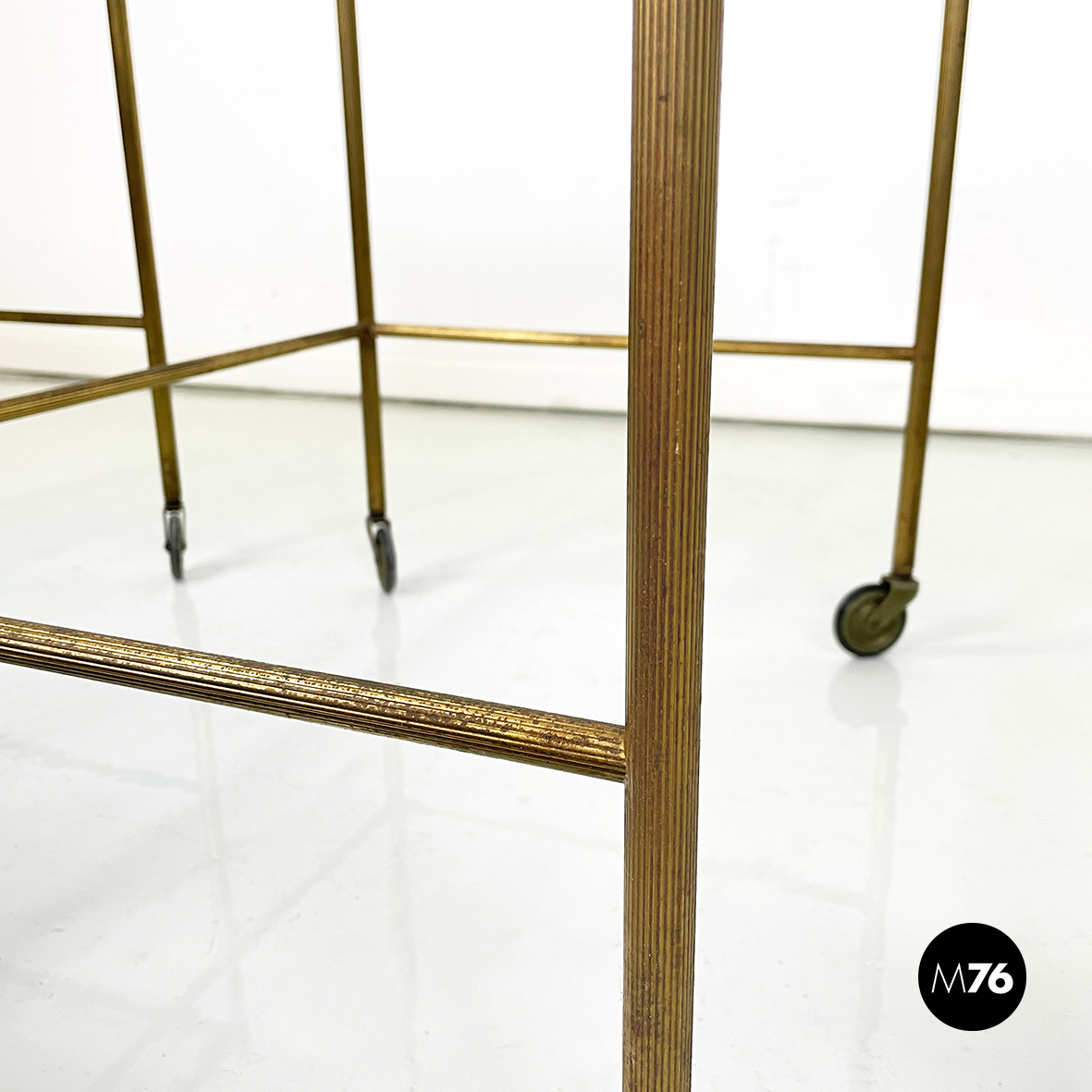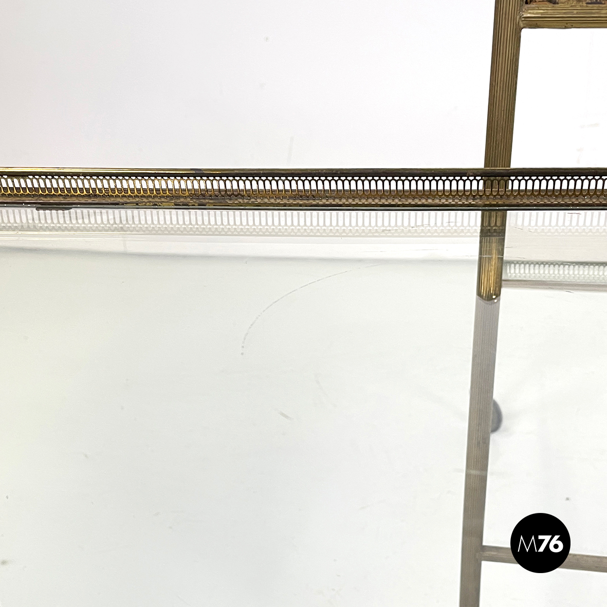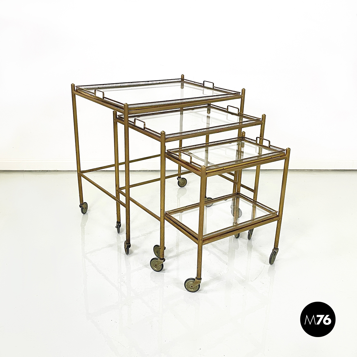 Set di tre carrelli con struttura in ottone. I due carrelli più grandi presentano un vassoio estraibile con struttura in ottone finemente lavorata e piano in vetro. Il carrello più piccolo presenta due ripiani con superiore vassoio estraibile. Il tre carrelli sono inseribili l’uno dentro l’altro. Rotelle alla base. Maniglie presenti sui vassoi. Utilizzabili come tavoli da caffè.