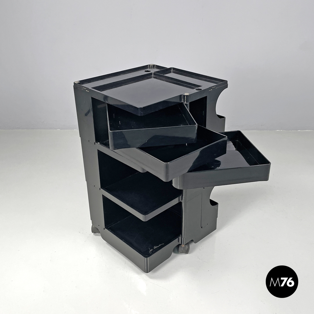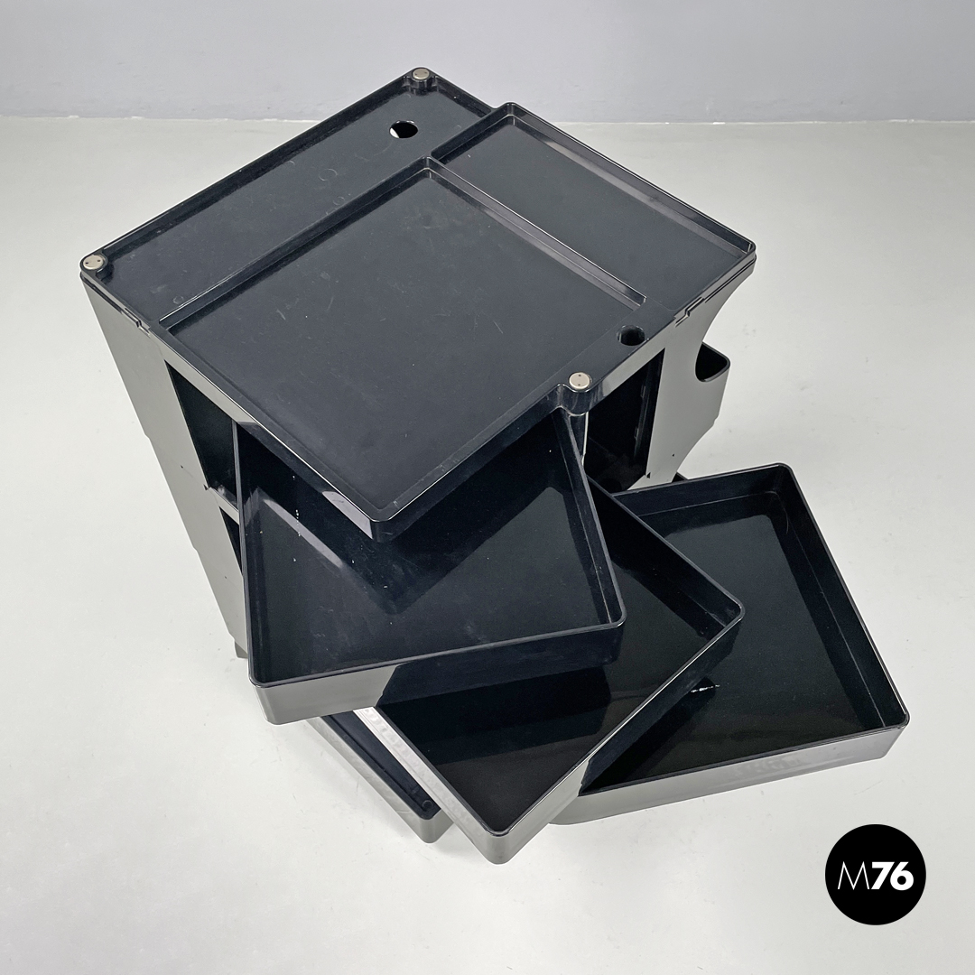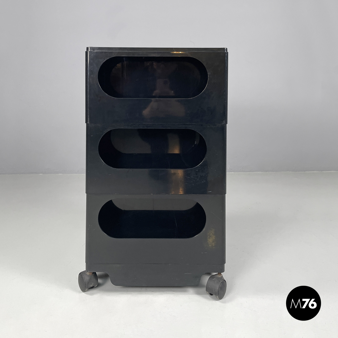 Carrello portaoggetti modello Boby in plastica nera. Il carrello è a base rettangolare, presenta molti scompartimenti, con tre cassetti che si aprono verso l’esterno ruotando su un angolo. Una sezione del piano è estraibile così da poter accedere a un’apertura alta quanto la struttura. Con tre ruote in plastica nera.