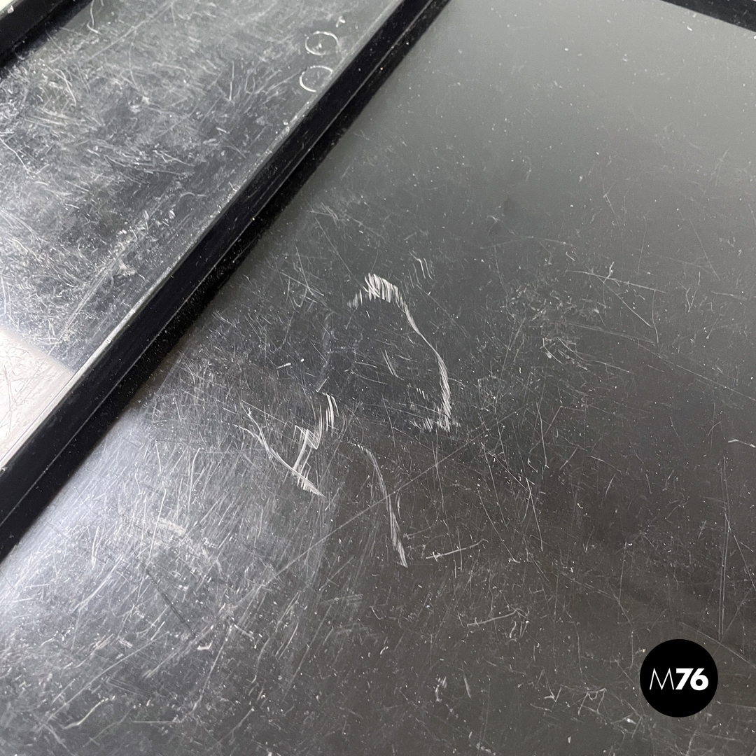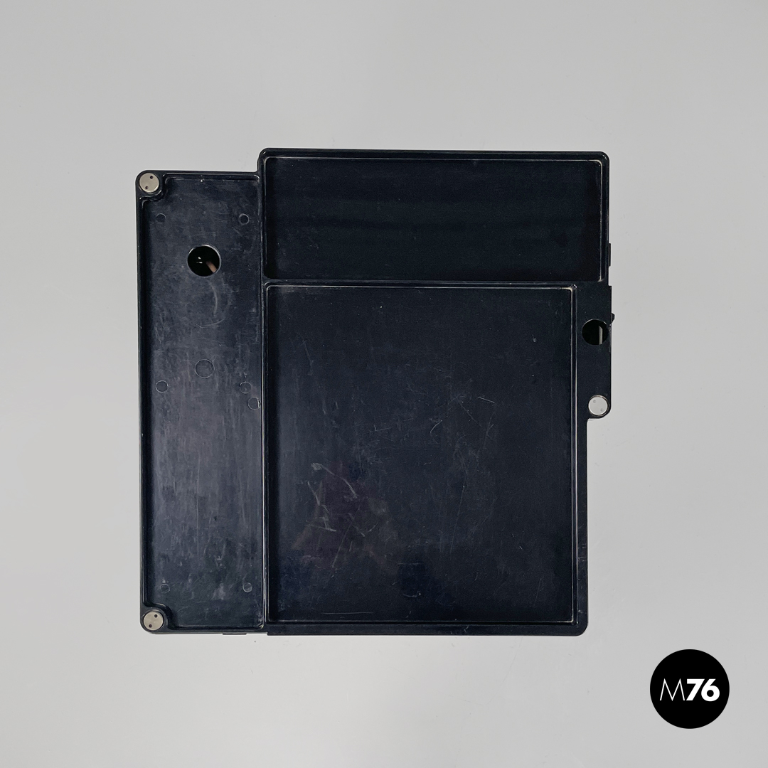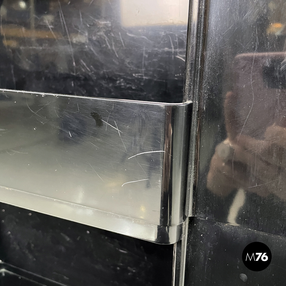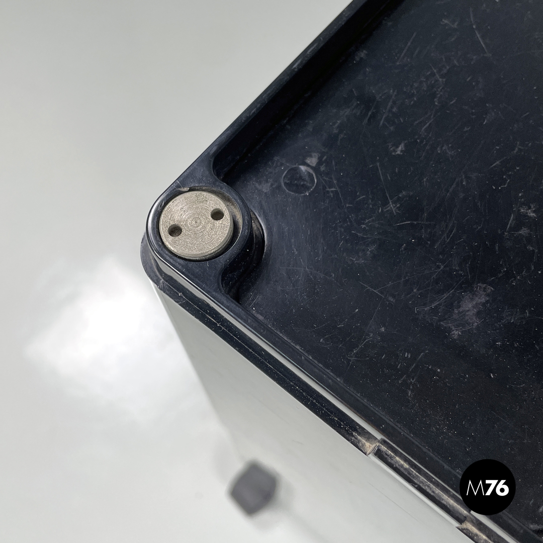 Carrello portaoggetti modello Boby in plastica nera. Il carrello è a base rettangolare, presenta molti scompartimenti, con tre cassetti che si aprono verso l’esterno ruotando su un angolo. Una sezione del piano è estraibile così da poter accedere a un’apertura alta quanto la struttura. Con tre ruote in plastica nera.