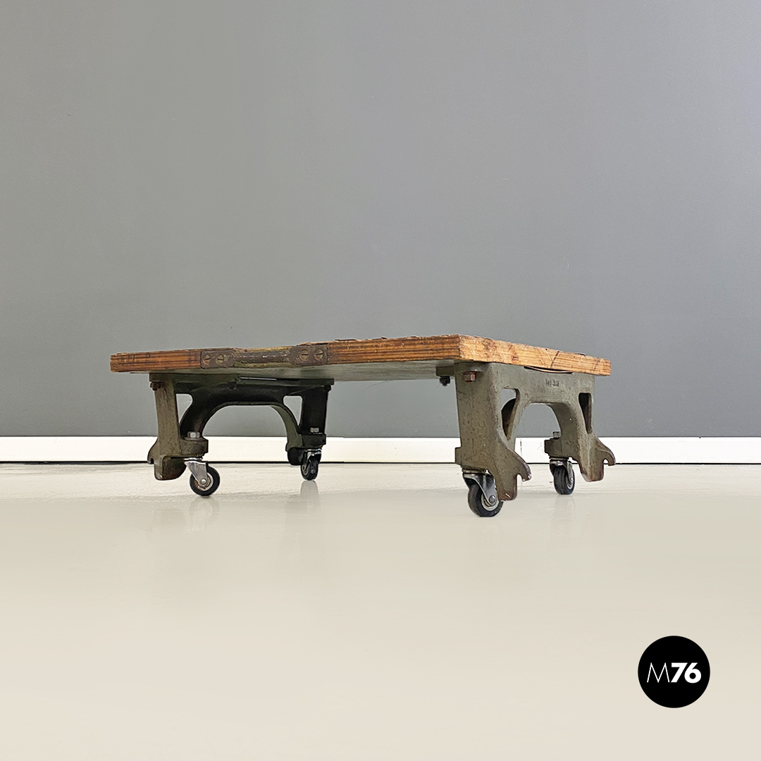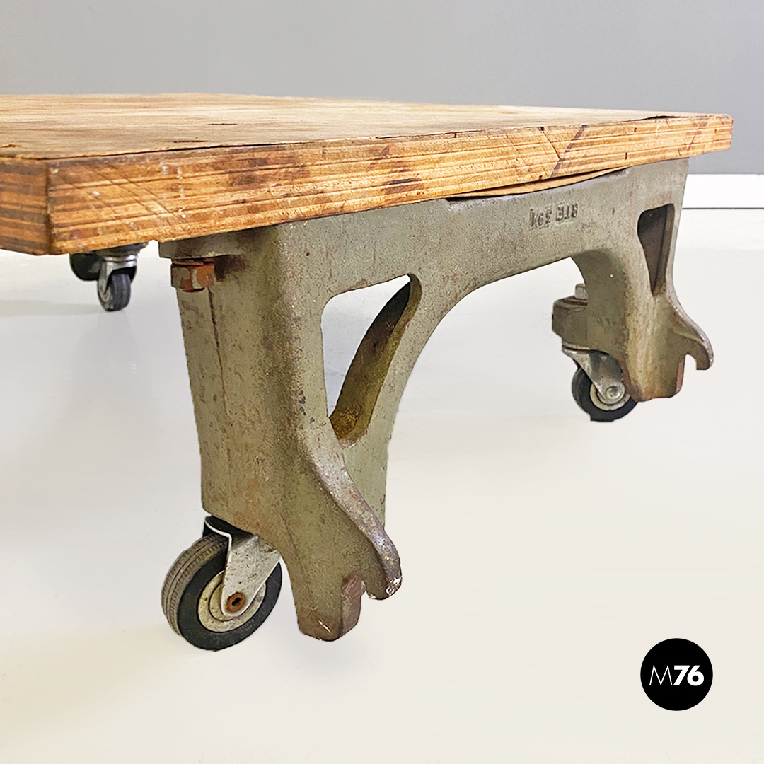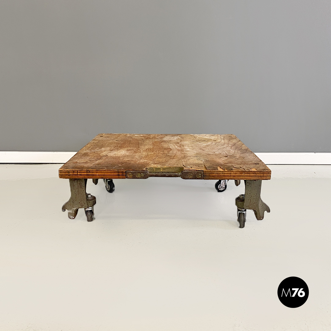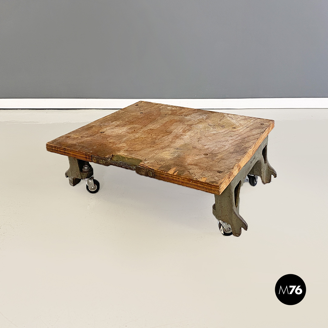 Carrello portaoggetti con base in ghisa e ruote, con piano in legno di forma quadrata e una maniglia posta su una dei quattro lati, sempre in ghisa. Ruote non originali.