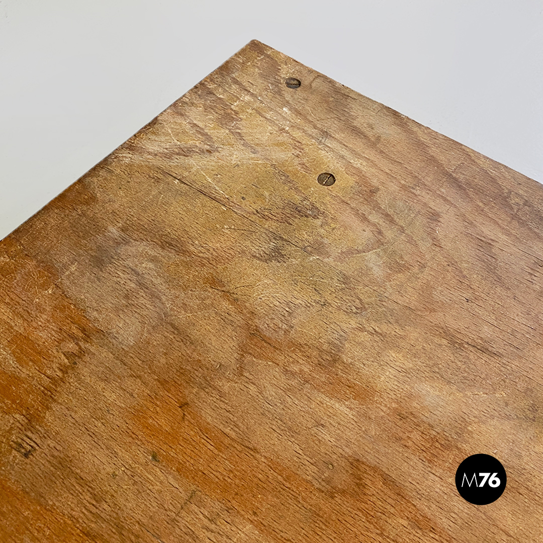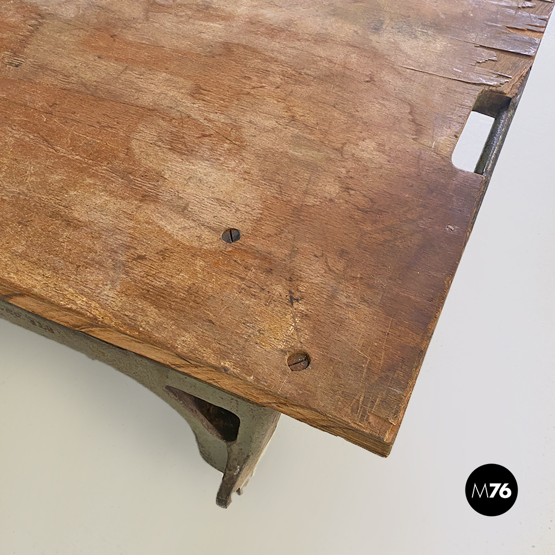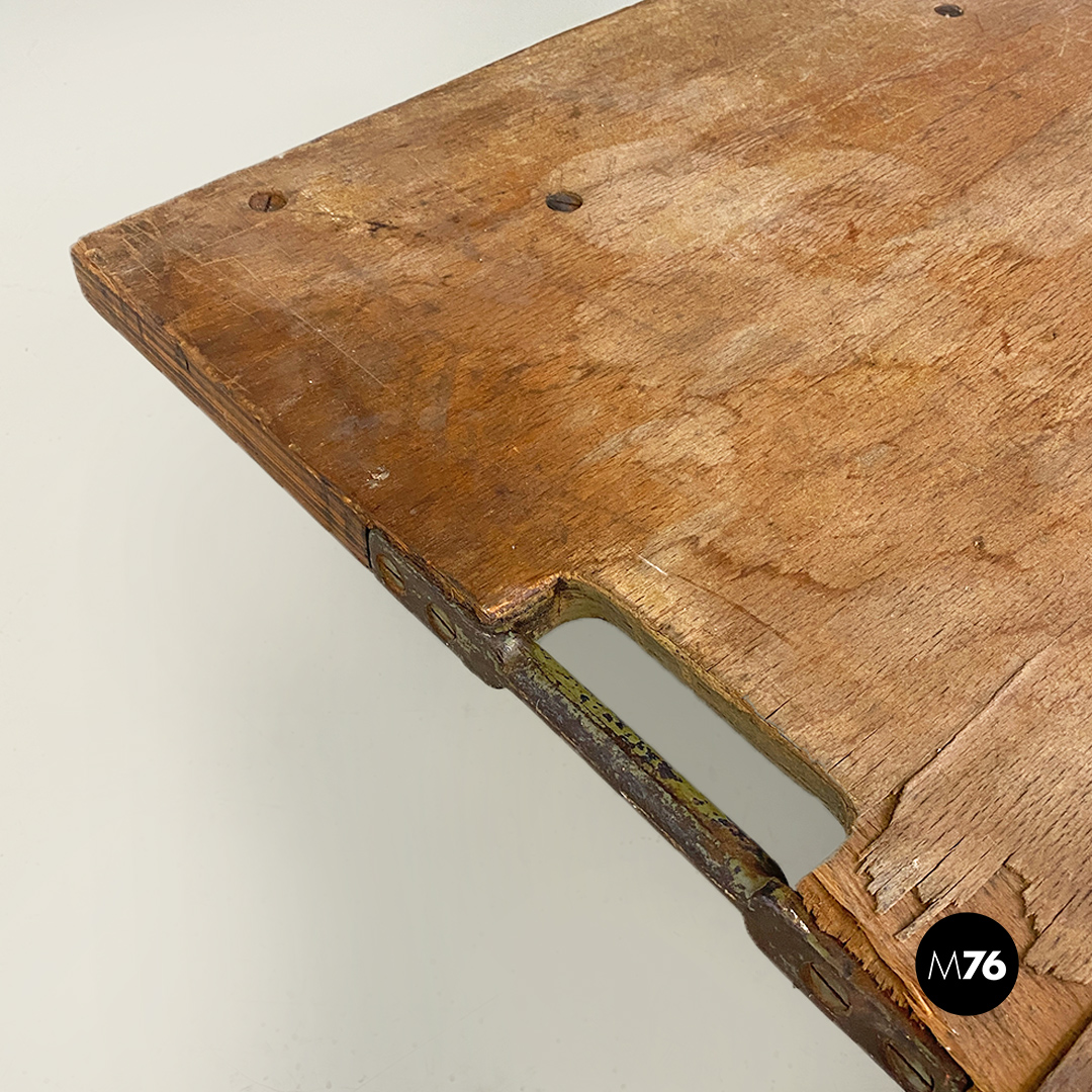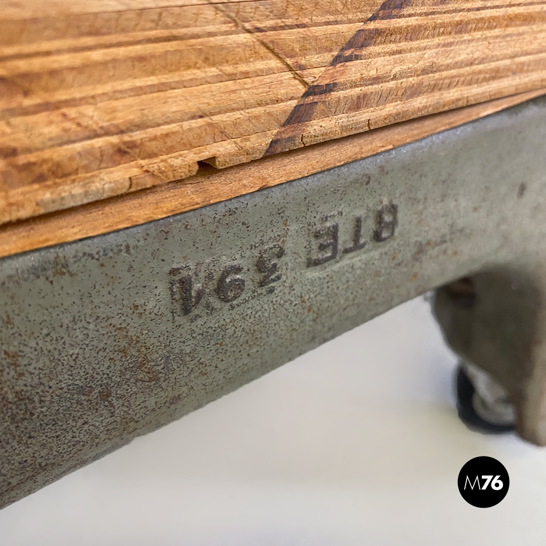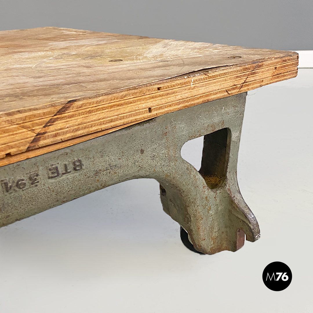 Carrello portaoggetti con base in ghisa e ruote, con piano in legno di forma quadrata e una maniglia posta su una dei quattro lati, sempre in ghisa. Ruote non originali.