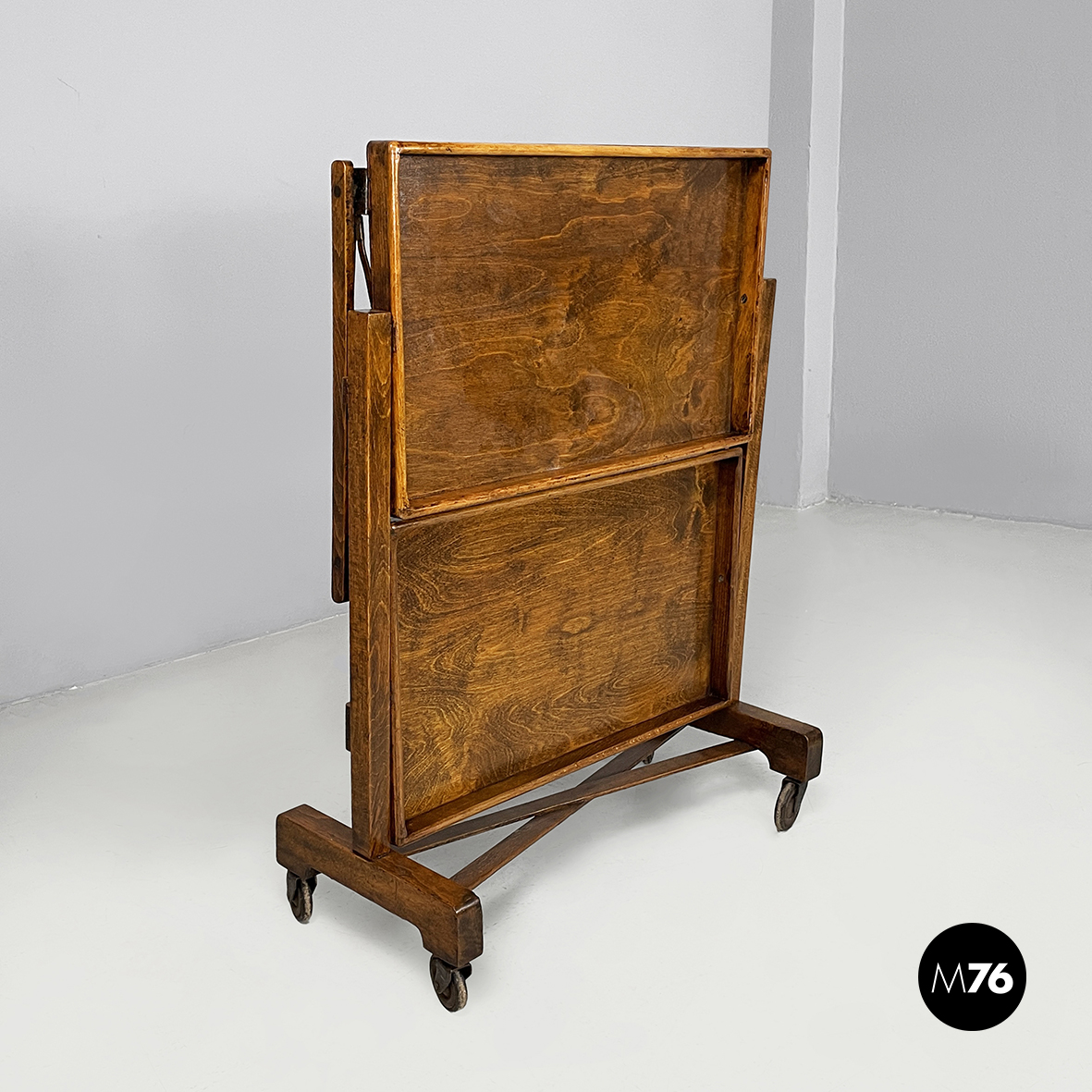 Carrello portavivande con doppio ripiano rettangolare, interamente in legno. Ogni ripiano presenta un rialzo sul bordo. Le zampe, unite al centro da due listelli posizionati ad X, presentano rotelle come piedini. I ripiani possono ruotare ed essere posizionati verticalmente, permettendo al carrello di occupare meno spazio. Art Deco.