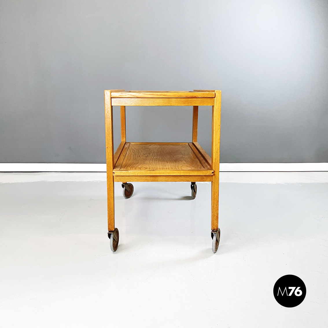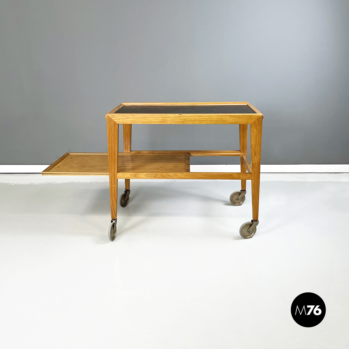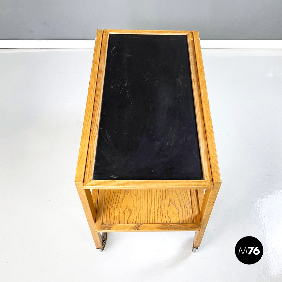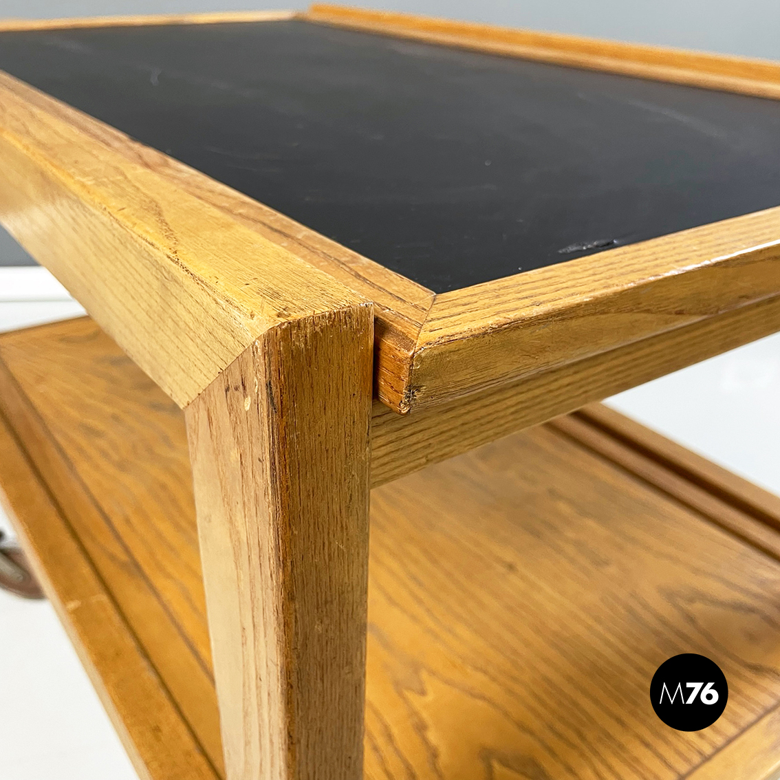 Carrello rettangolare a due piani in legno. Il piano superiore in legno verniciato nero è rimovibile. Il piano inferiore è scorrevole. Le zampe sono a sezione quadrate. Ruote in metallo.