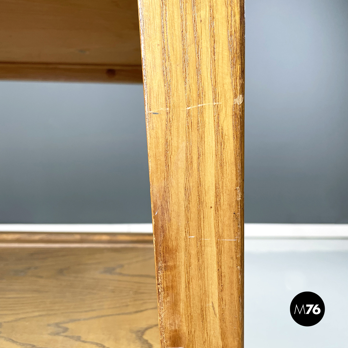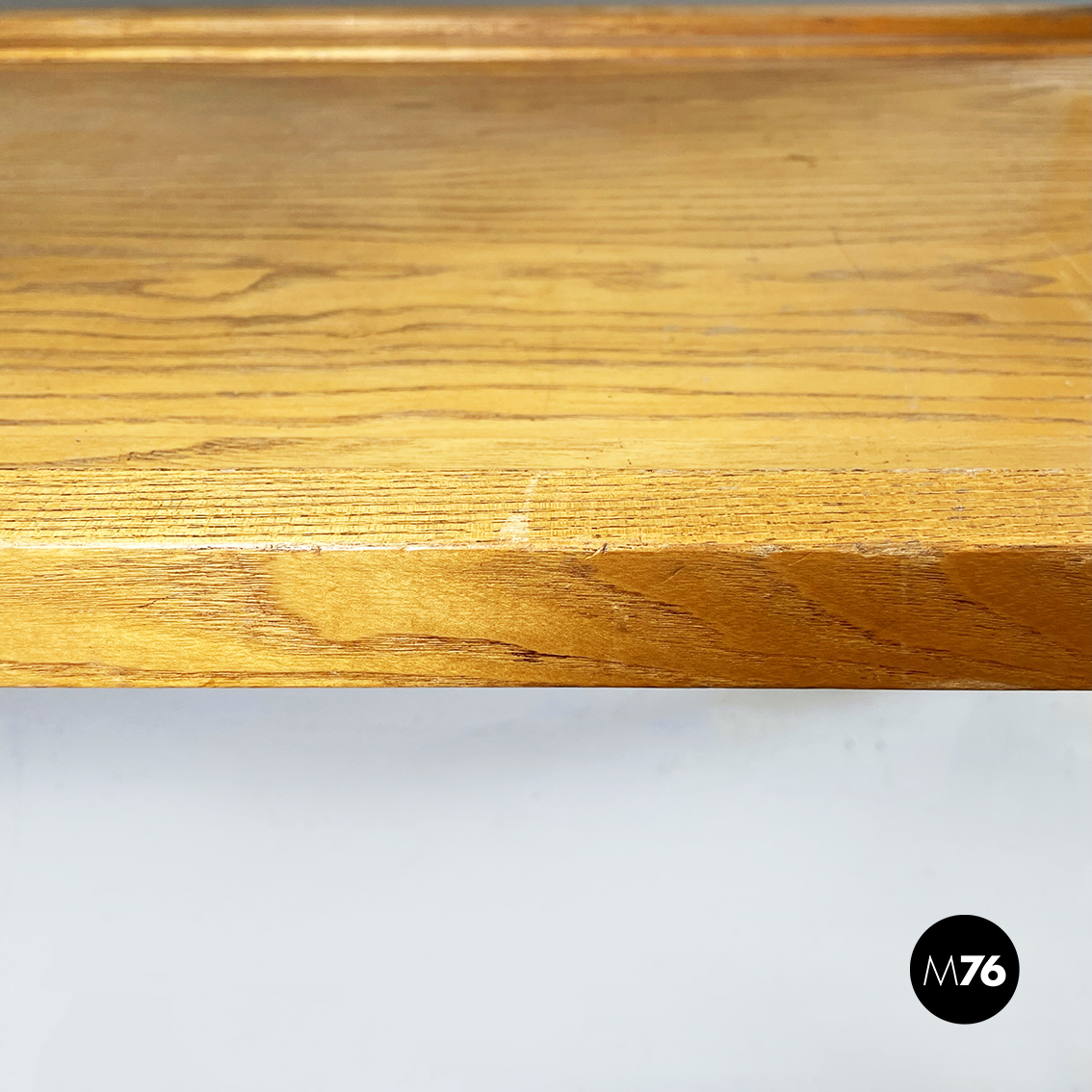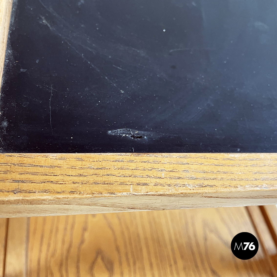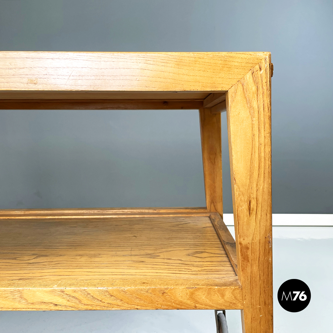 Carrello rettangolare a due piani in legno. Il piano superiore in legno verniciato nero è rimovibile. Il piano inferiore è scorrevole. Le zampe sono a sezione quadrate. Ruote in metallo.