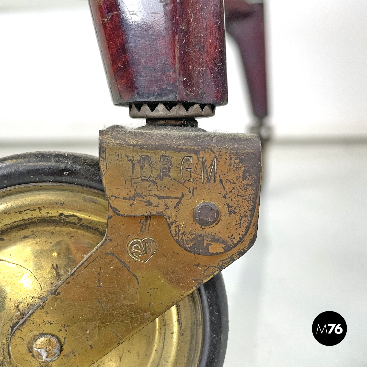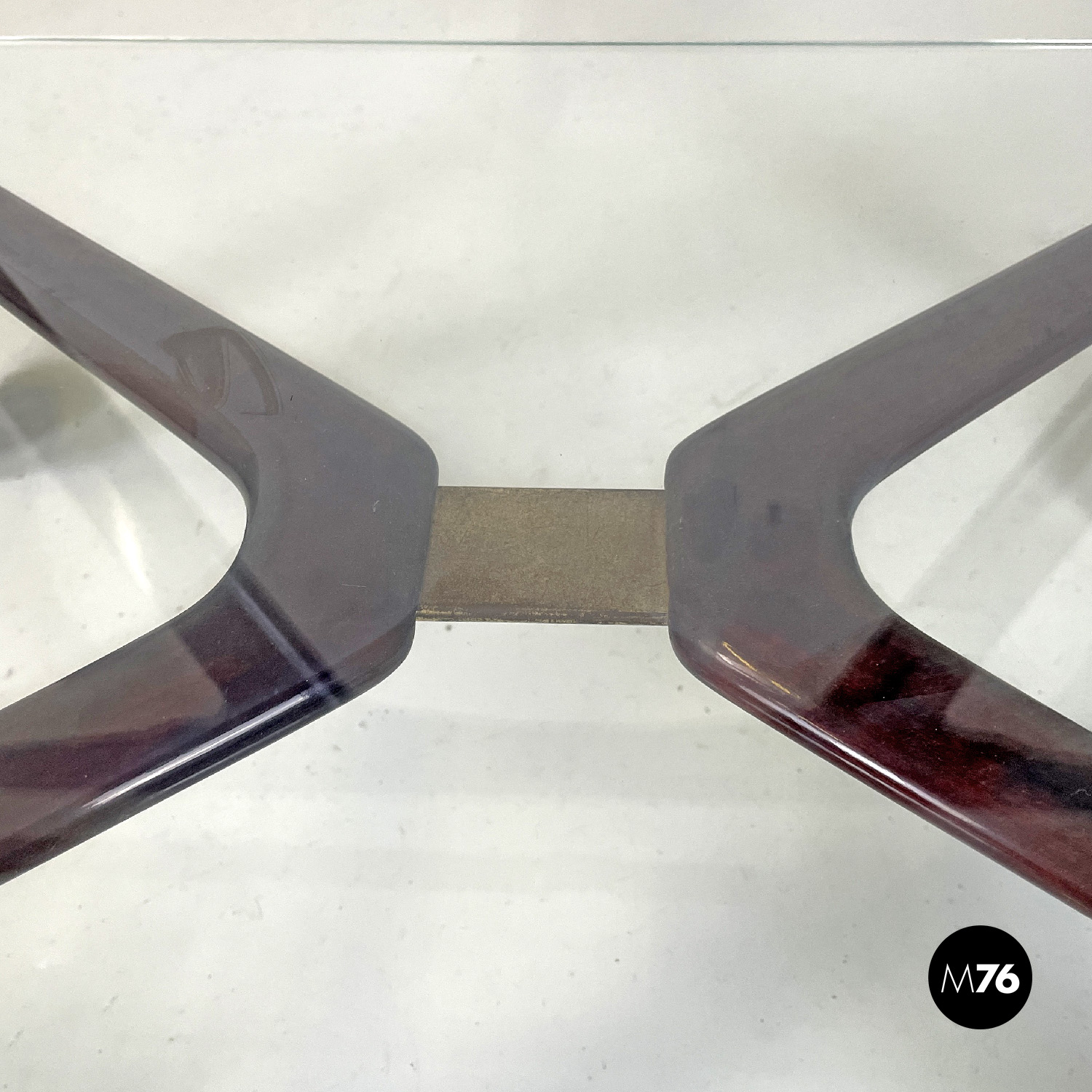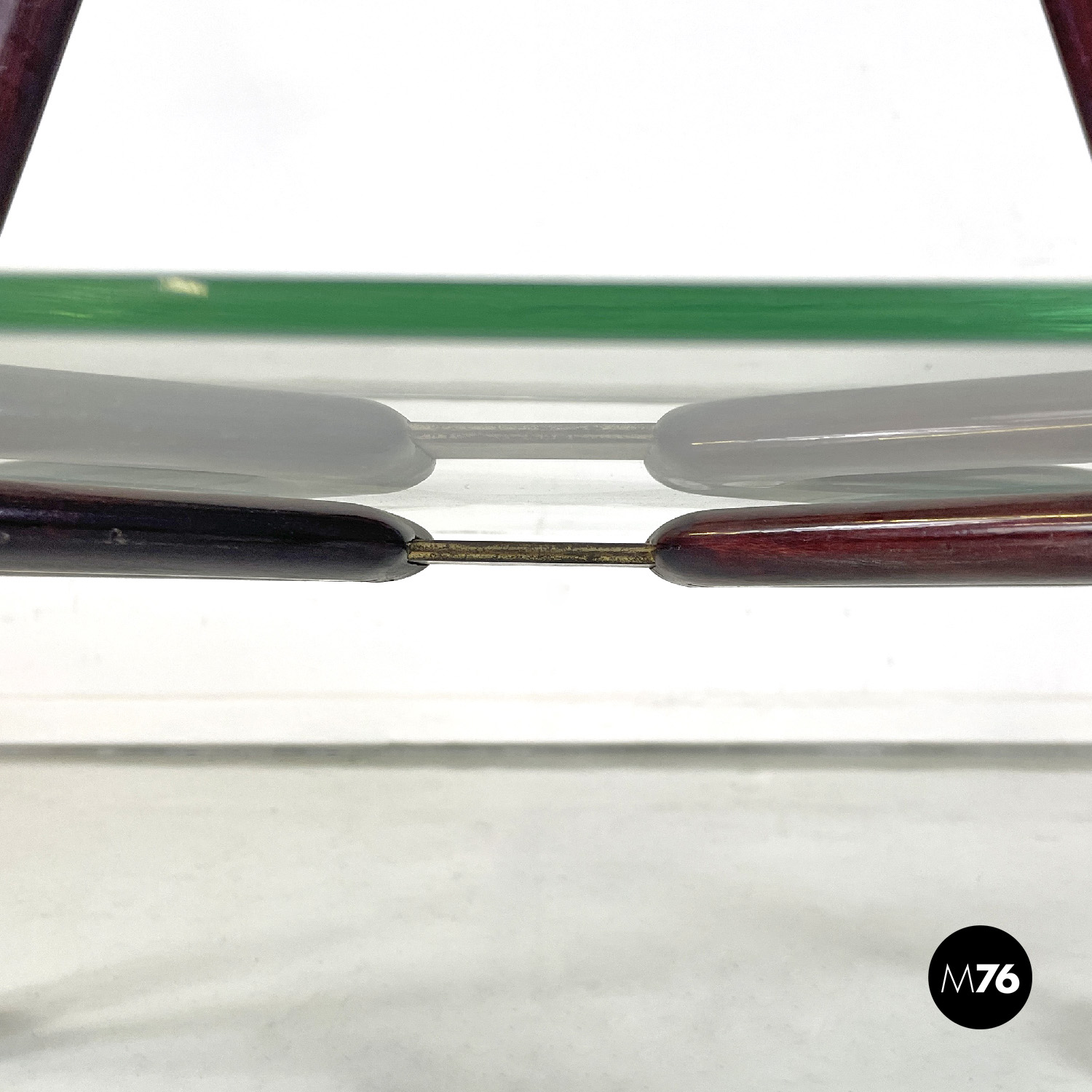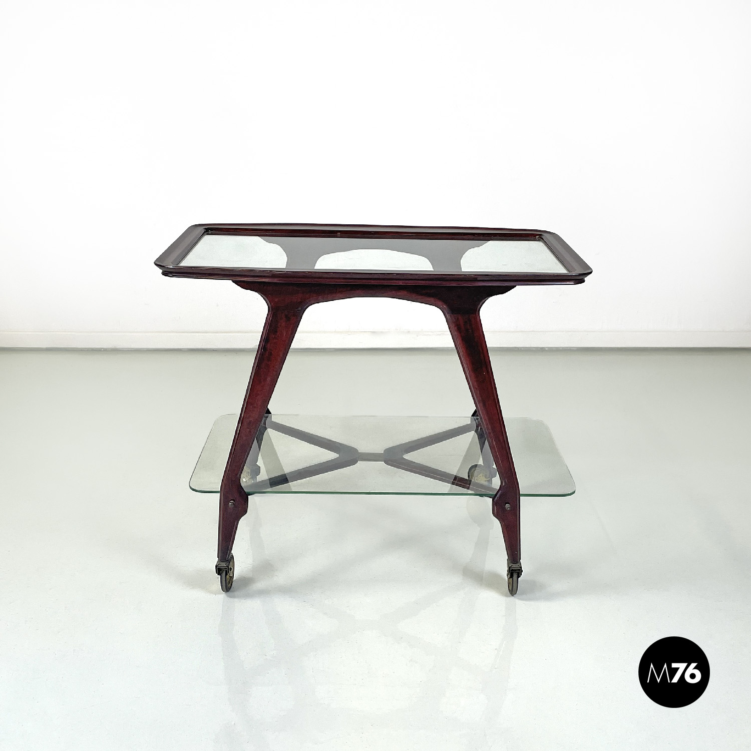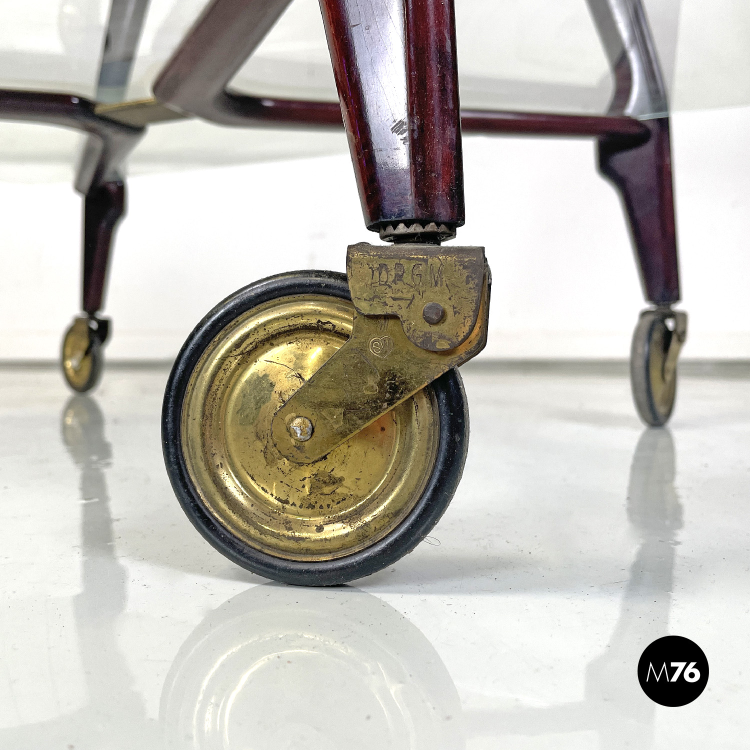 Carrello con due ripiani rettangolari. La struttura del carrello è in legno, il piano superiore è esternamente in legno mentre la parte interna è in vetro. Il piano inferiore è estraibile ed è interamente in vetro, poggia su una struttura incrociata collegata alle quattro gambe della struttura. Presenta quattro ruote in ottone.